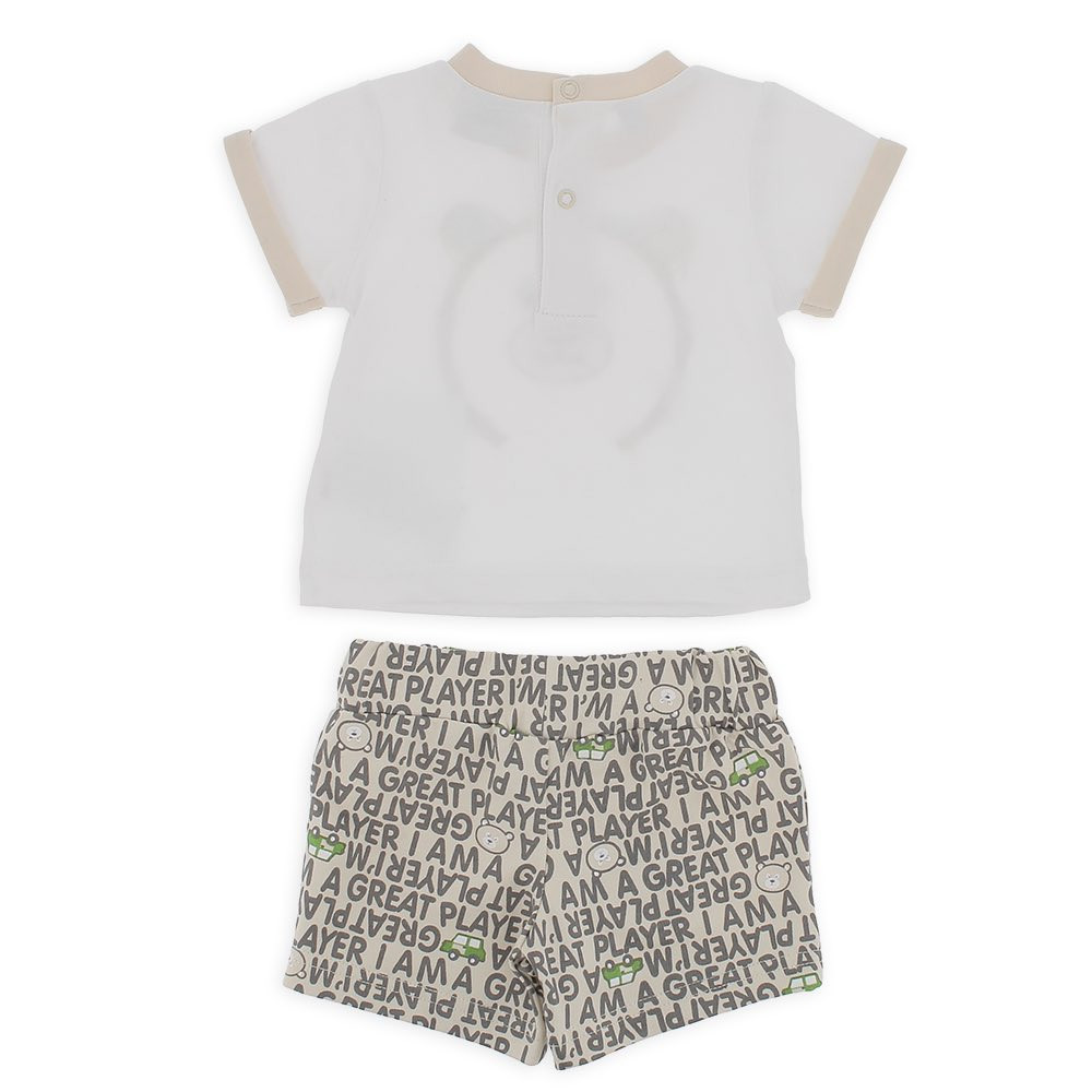 Completo composto da due pezzi. T-shirt in jersey girocollo, a maniche corte con profili a contrasto. Chiusura posteriore con bottoni automatici. Orsetto ricamato con orecchie applicate sul davanti. Pantaloncino in felpa leggera con vita elasticizzata e coulisse. Stampa all over di scritte e orsetti.