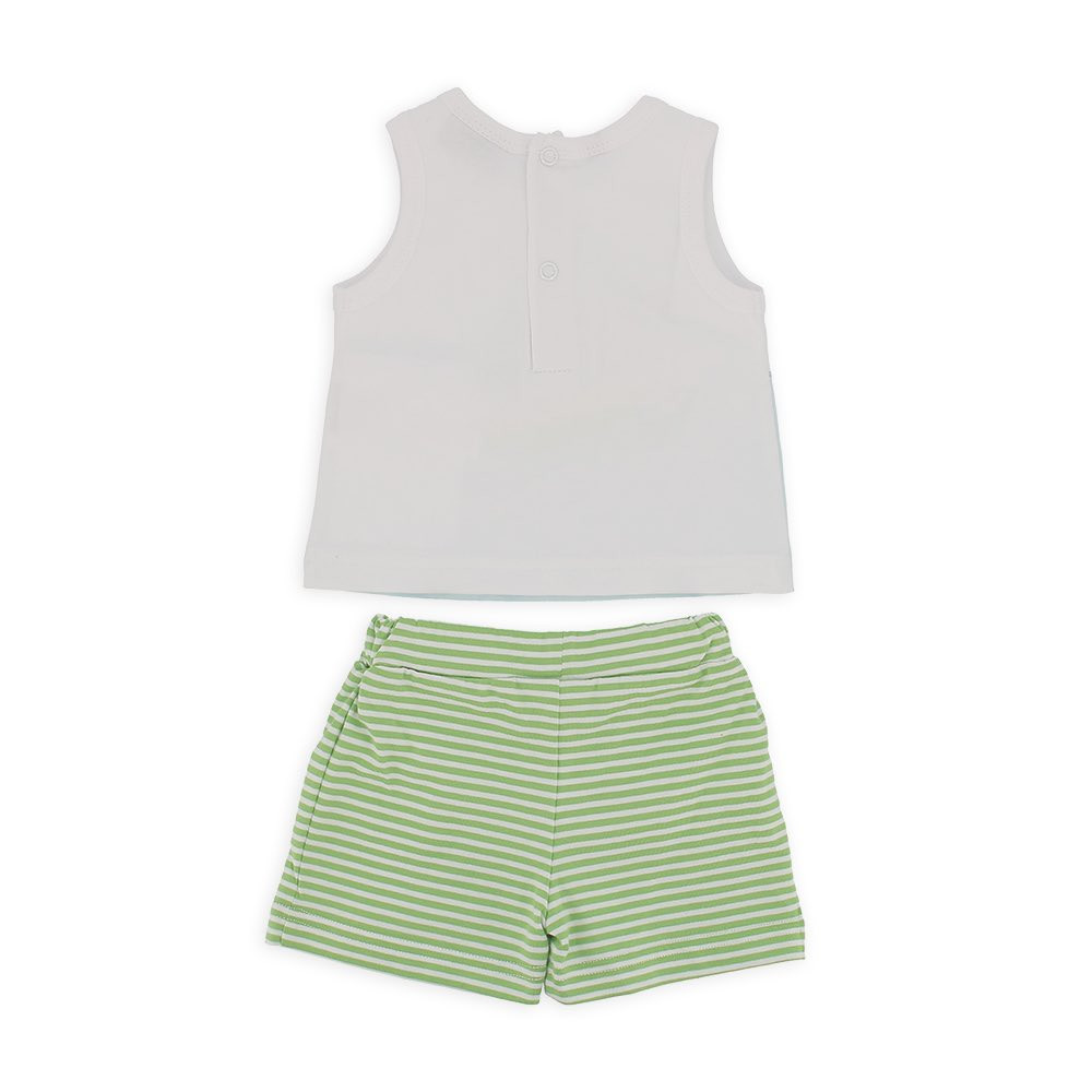 Completo composto da due pezzi. Canotta in jersey girocollo con chiusura posteriore con bottoni automatici. Stampa frontale con orsetto. Pantaloncino in jersey a righe con vita elasticizzata.
