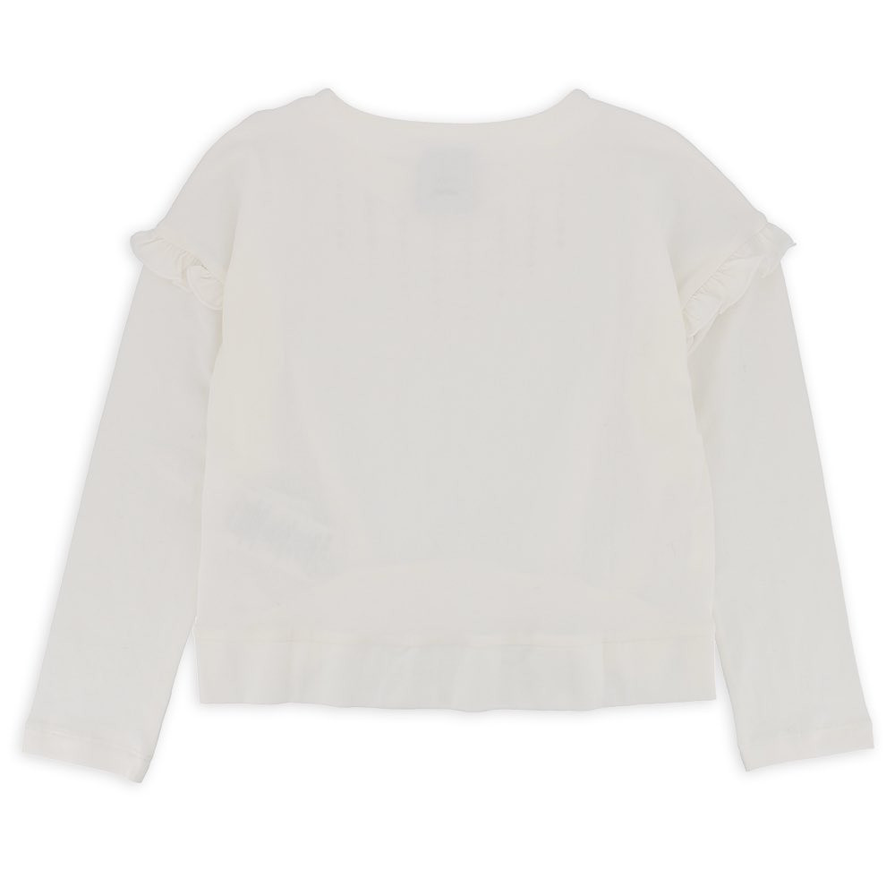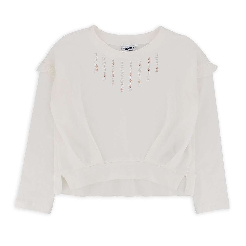 T-shirt in jersey, con ampio scollo rotondo, a maniche lunghe. Modello con pinces sul fondo e piccole rouches sulle maniche. Fondo con spacchetti laterali. Applicazioni termoadesive con finitura perlata e metallizzata sul davanti.