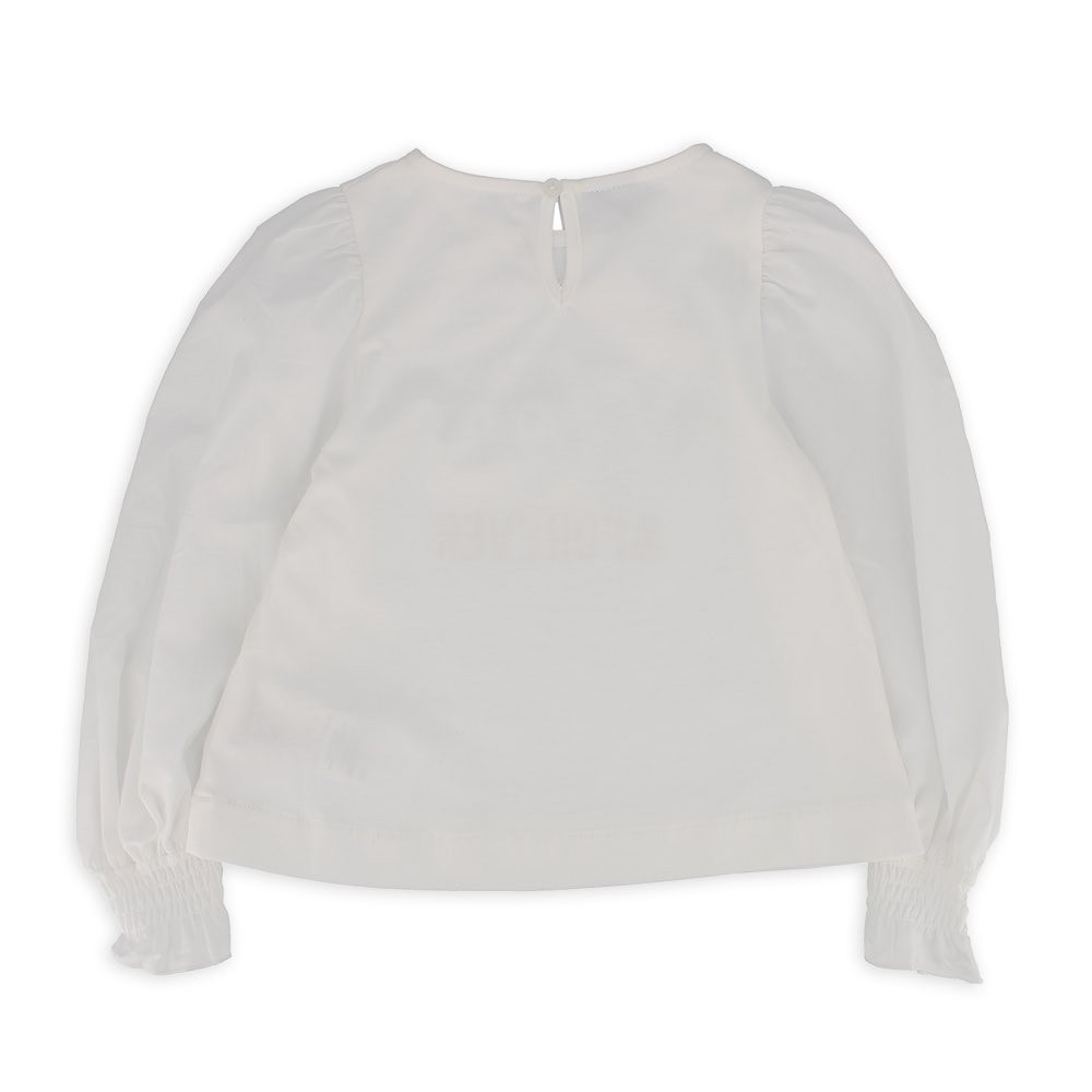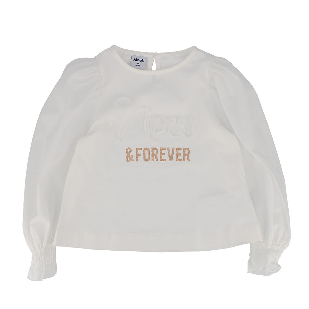T-shirt in jersey, girocollo, con maniche lunghe a palloncino in popeline di cotone. Modello svasato sul fondo. Chiusura a goccia con bottone posteriore. Stampa frontale glitter con applicazioni in tessuto.