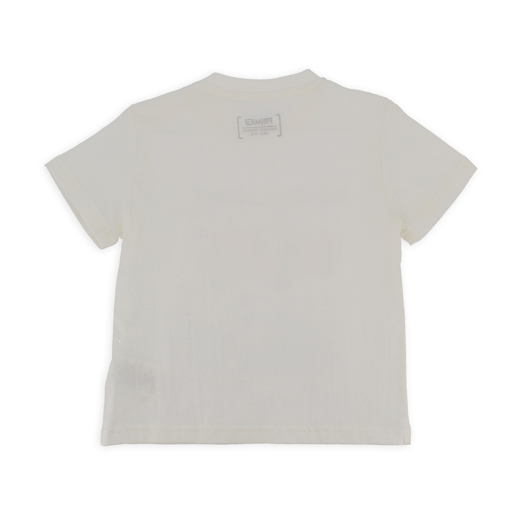 T-shirt girocollo a maniche corte, in jersey. Chiusura con bottoni automatici sulla spalla. Stampa frontale.