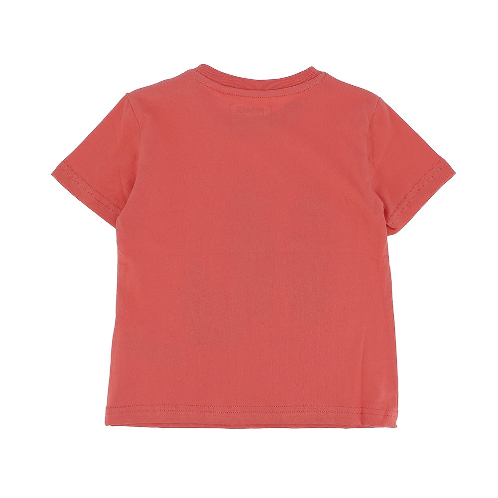 T-shirt girocollo a maniche corte, in jersey. Chiusura con bottoni automatici sulla spalla. Stampa frontale.