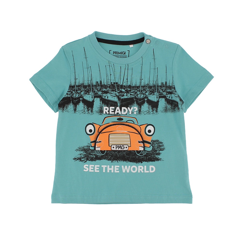 T-shirt girocollo a maniche corte, in jersey. Chiusura con bottoni automatici sulla spalla. Stampa frontale.