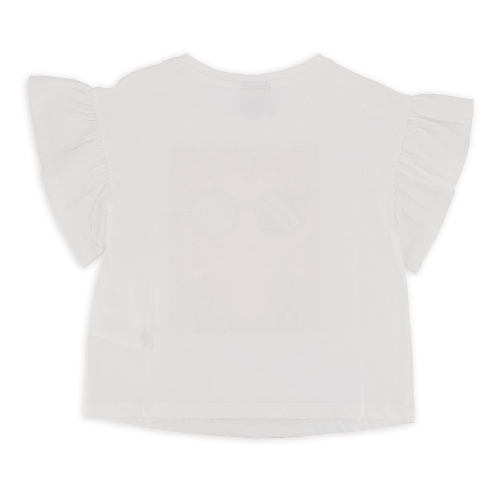 T-shirt boxy in jersey, girocollo, a maniche corte con volants. Stampa frontale con applicazioni in paillettes colorate.