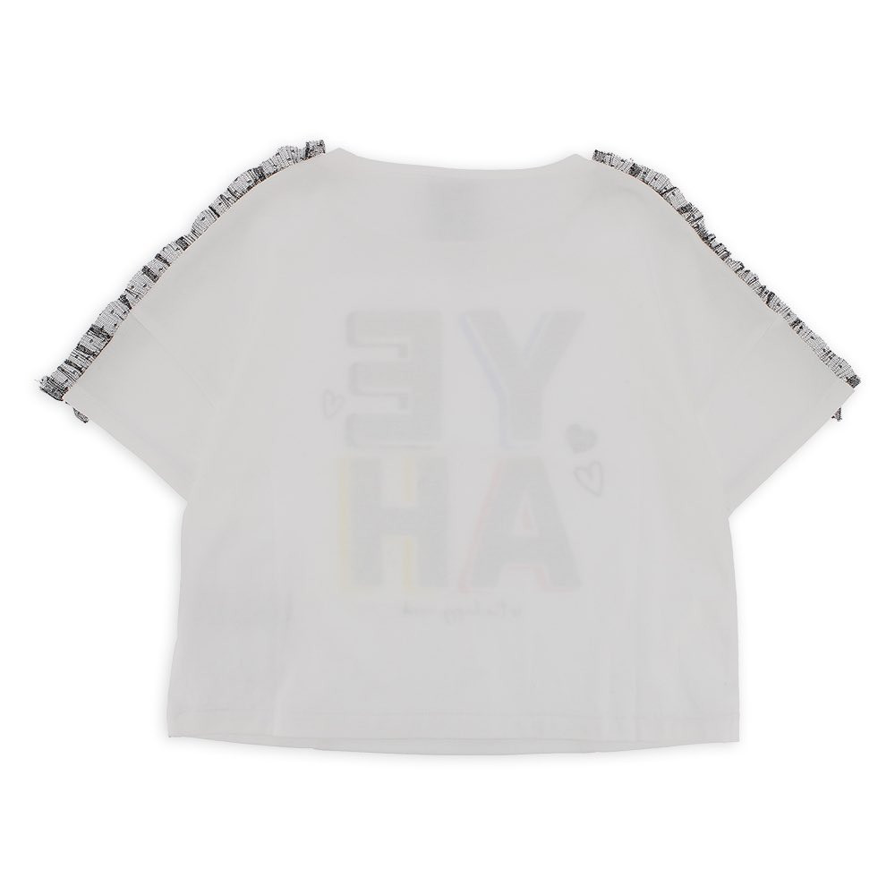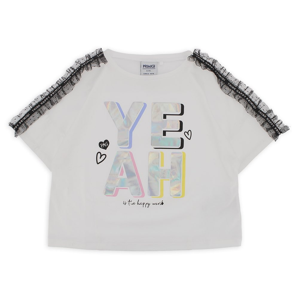 T-shirt boxy in jersey, girocollo, a maniche corte. Stampa frontale con scritte iridescenti e applicazione di rouches in tulle sulle maniche.