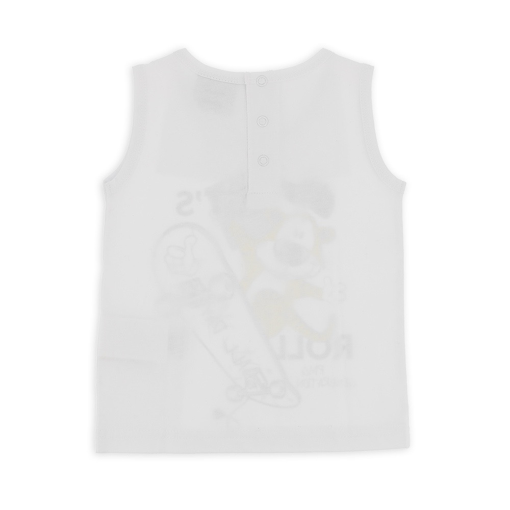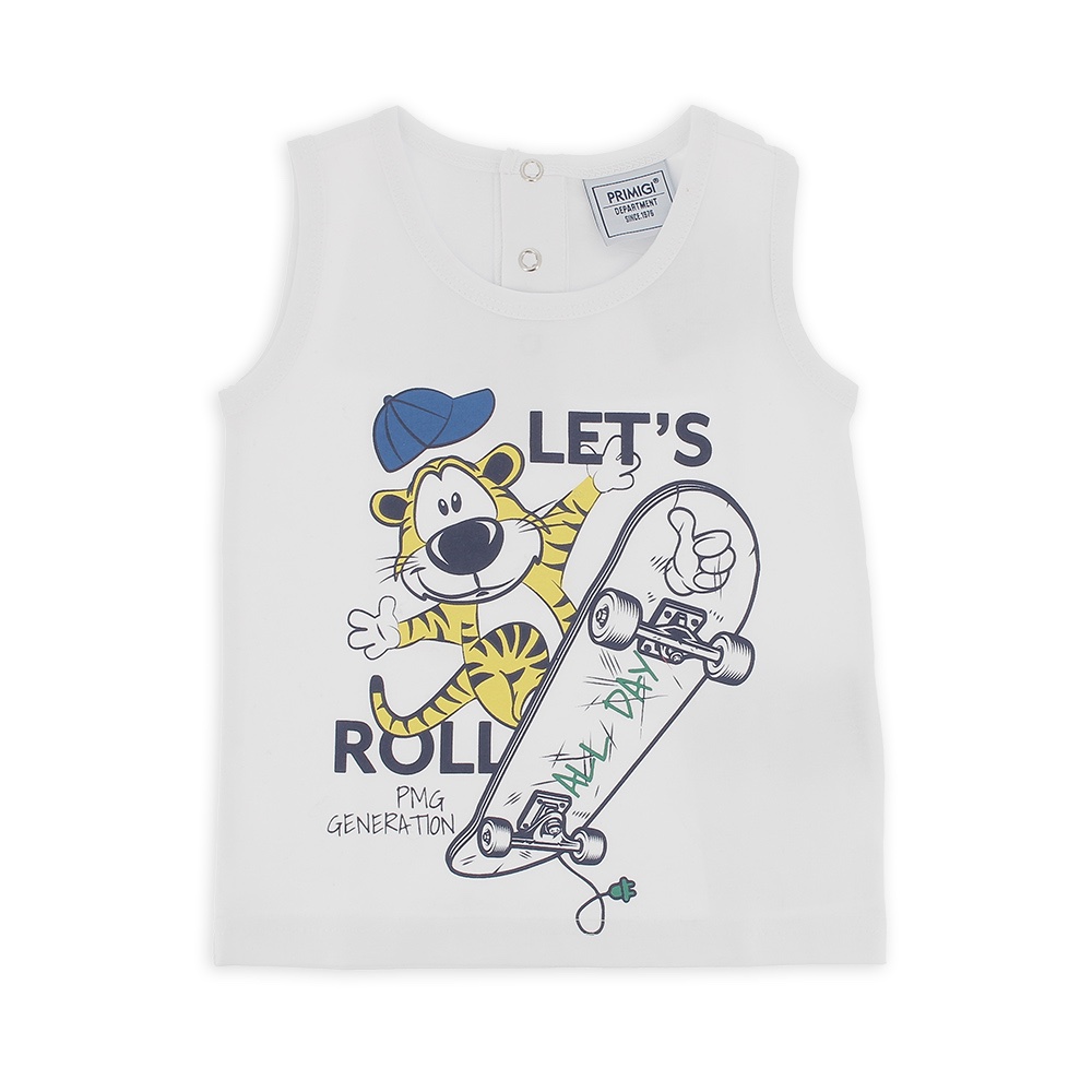 Canotta girocollo in jersey. Chiusura posteriore con bottoni automatici. Stampa frontale.