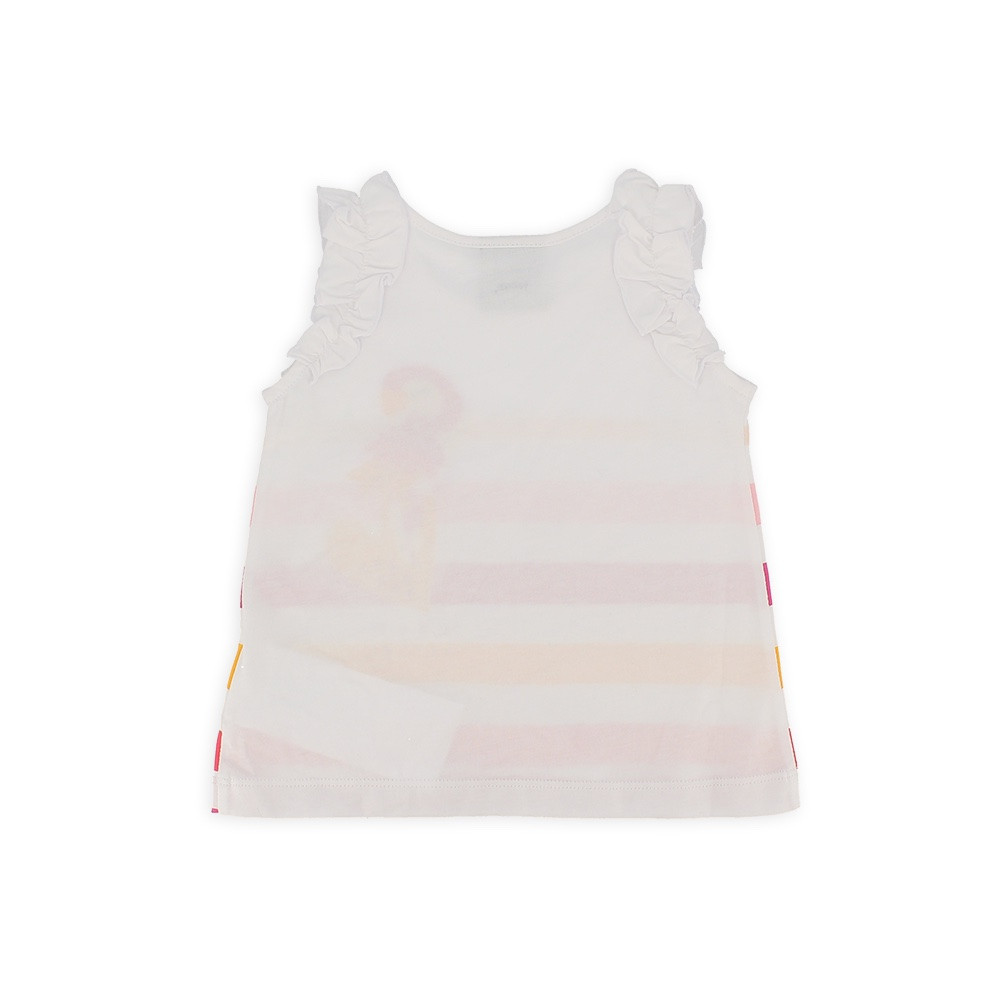 Canotta in jersey girocollo, con rouches sul giromanica. Stampa frontale con applicazione in tulle.