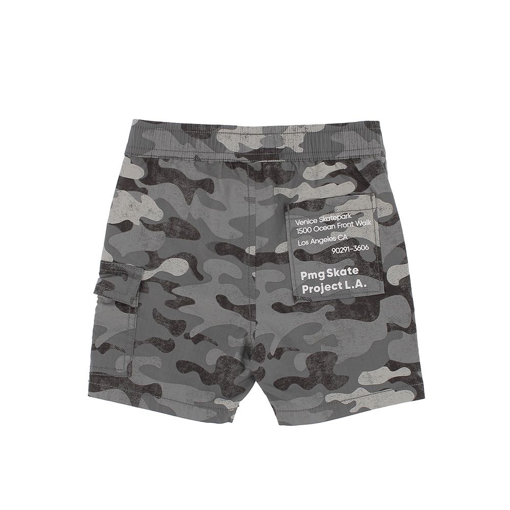 Bermuda in popeline comfort fit, vita elasticizzata con lacci frontali. Tasche alla francese e tascone laterale con laccetto elastico. Stampa all-over camouflage e stampa con scritte sulla tasca posteriore.