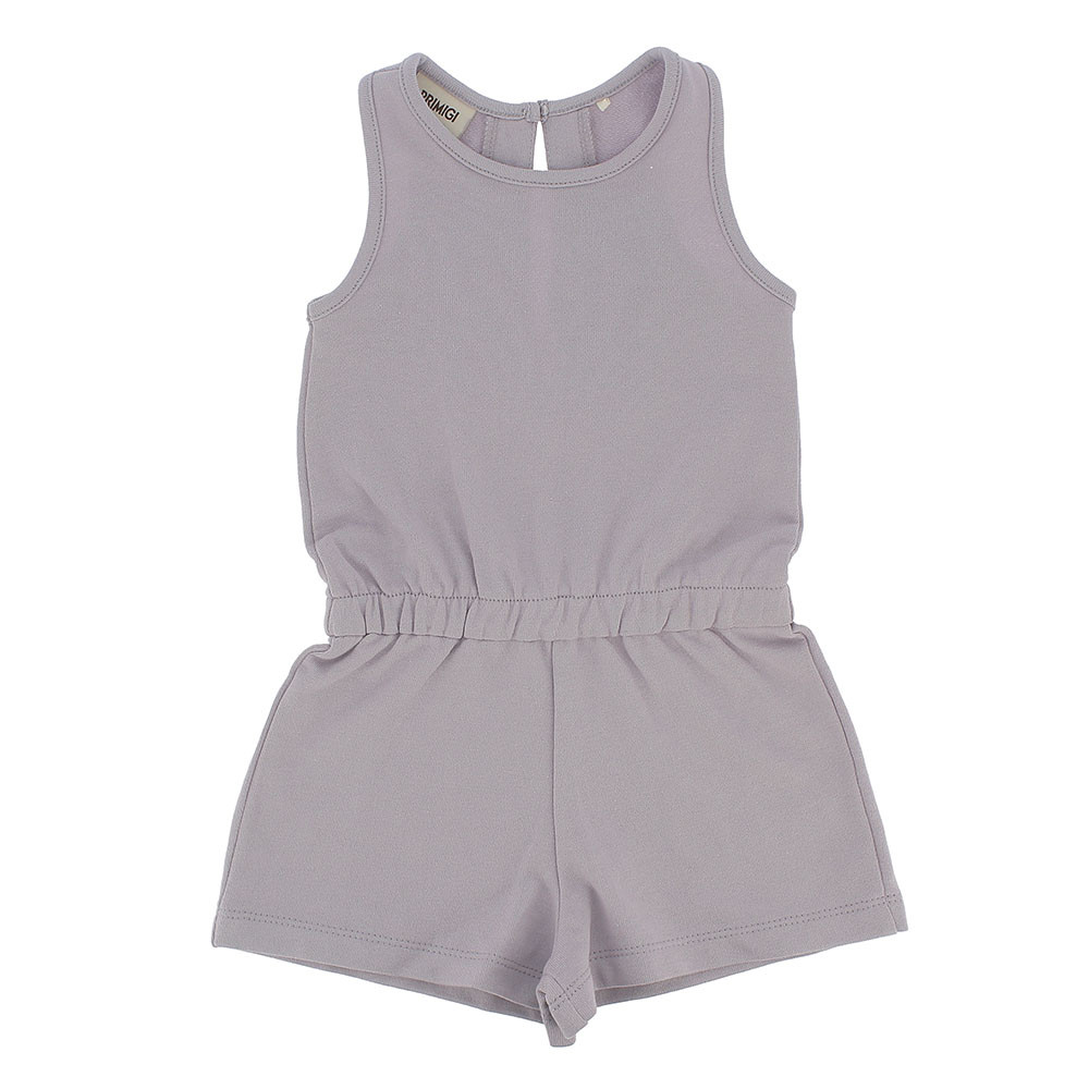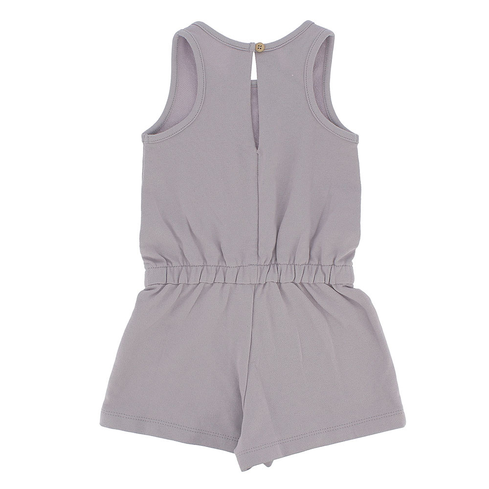 Salopette in felpa, girocollo, senza maniche. Chiusura posteriore a goccia con bottoncino in legno. Vita elasticizzata. Questo capo è ecosostenibile perché realizzato in puro cotone organico.