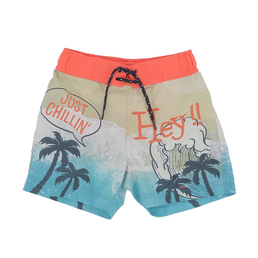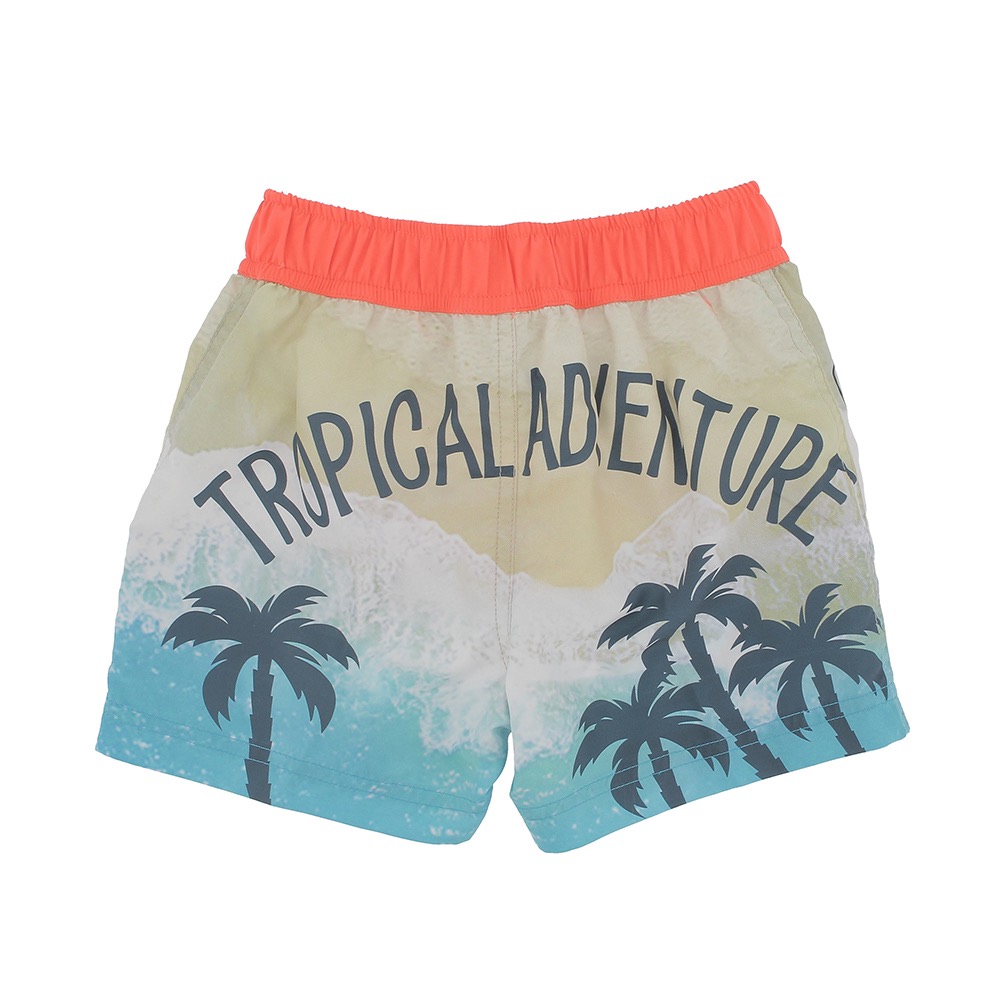 Pantaloncino mare con vita elasticizzata e lacci frontali. Stampe a tema tropical con scritte. Mutandina interna in micro-rete.