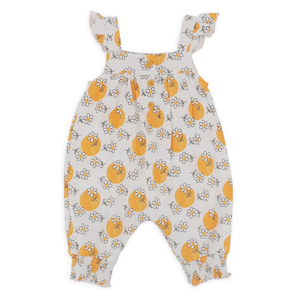 Pagliaccetto in jersey con bretelline con volants. Chiusura sul cavallo con bottoni automatici. Fondo arricciato e stampa all-over margherite.