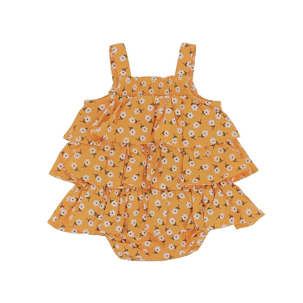 Pagliaccetto in jersey con volants e bretelline. Chiusura sul cavallo con bottoni automatici. Stampa all-over fiorellini.
