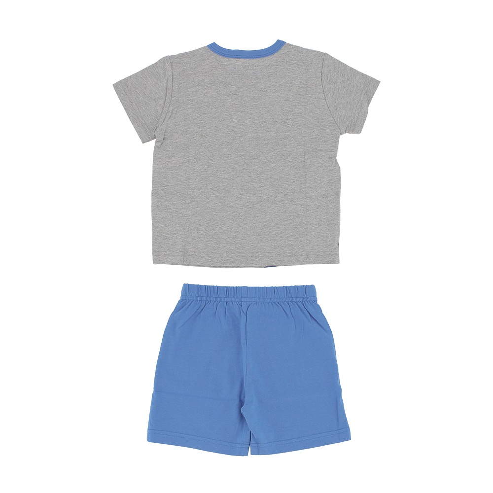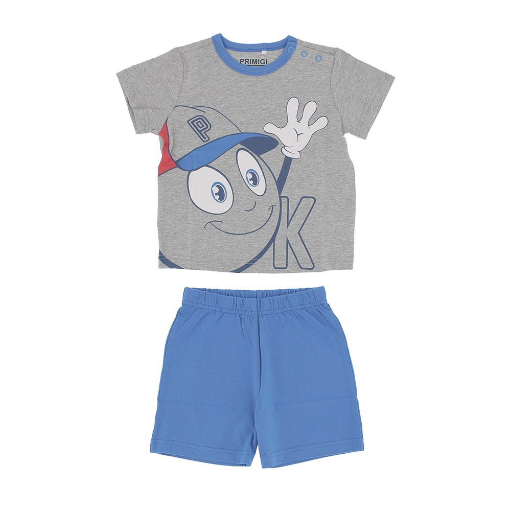 Completo pigiama in jersey. Maglia girocollo a maniche corte, chiusura con bottoni automatici sulla spalla. Bermuda con vita elasticizzata.