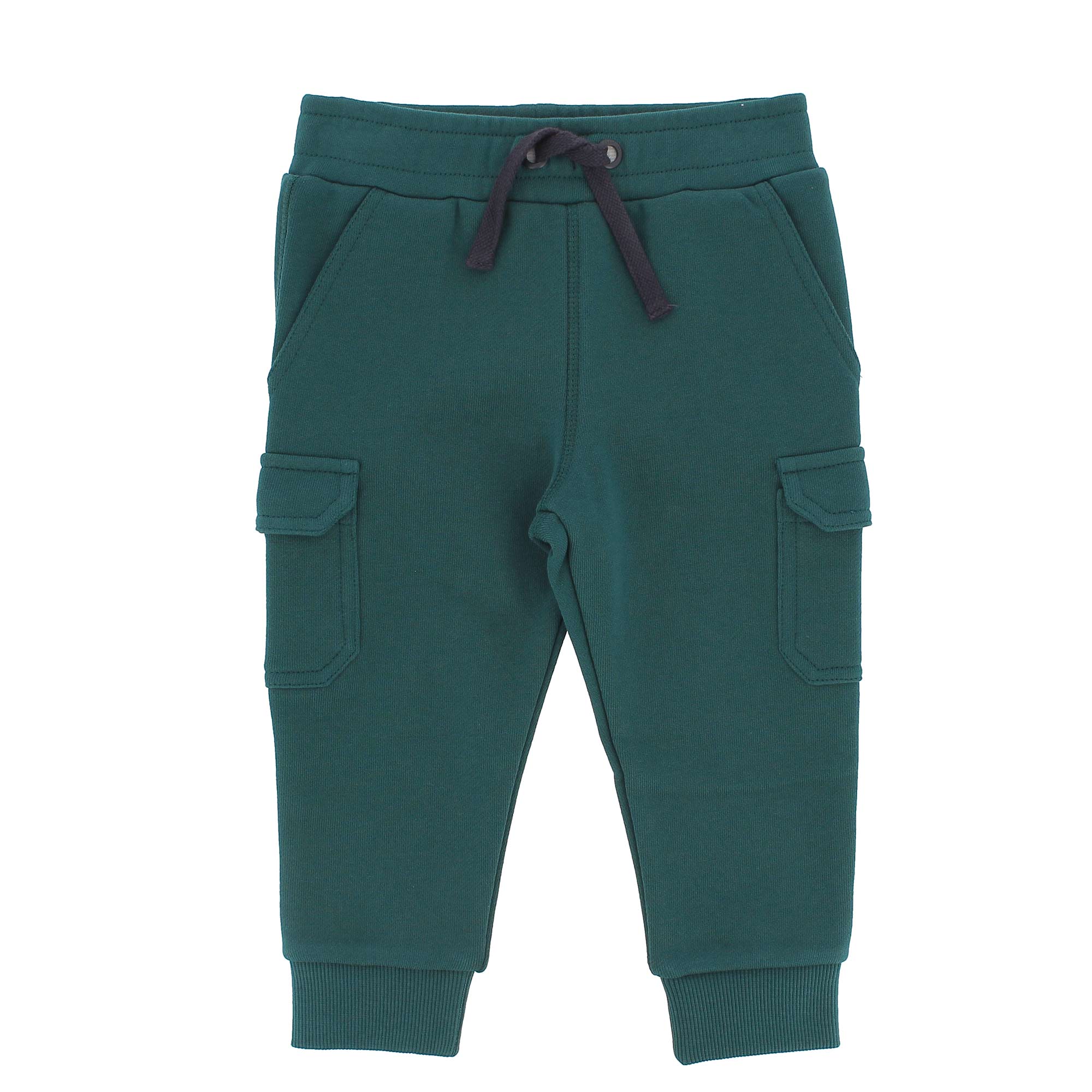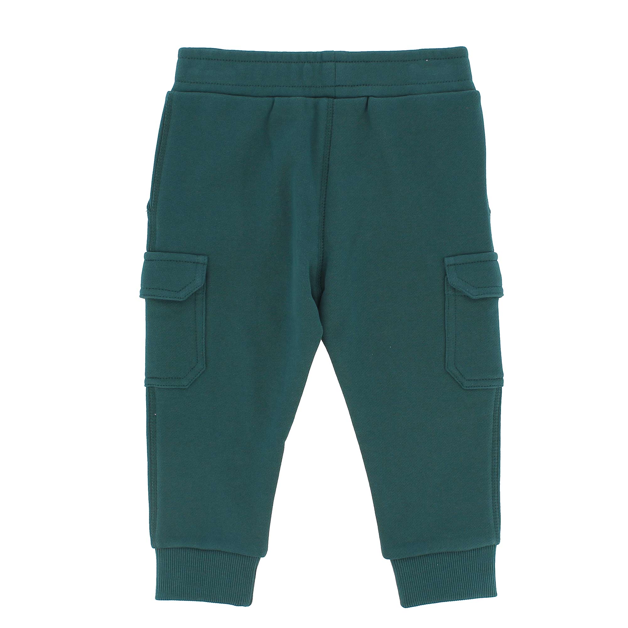 Pantalone in felpa con vita elasticizzata e lacci sul davanti. Tasche laterali, tasconi con pattina e fondo in costina.