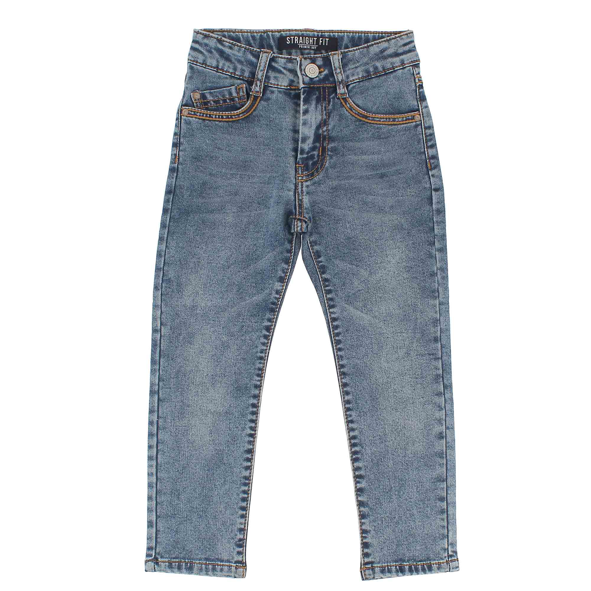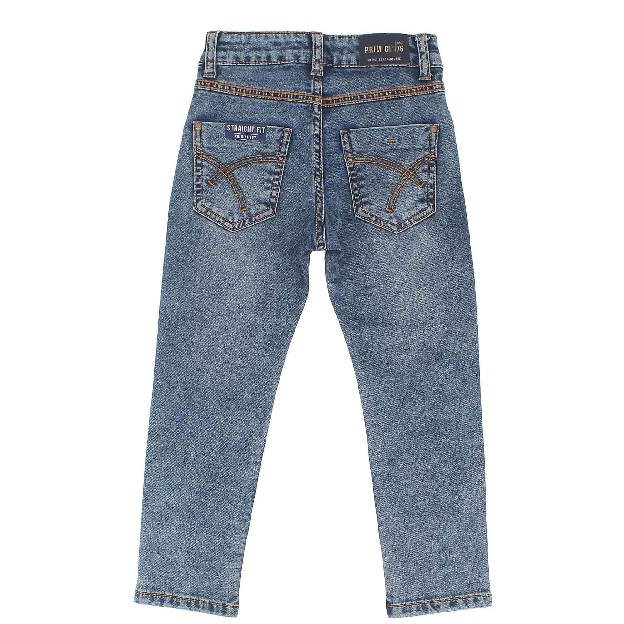 Pantalone straight fit, in jeans a maglia con vita regolabile all'interno. Chiusura con bottone di metallo e zip. Cinque tasche e passanti in vita.