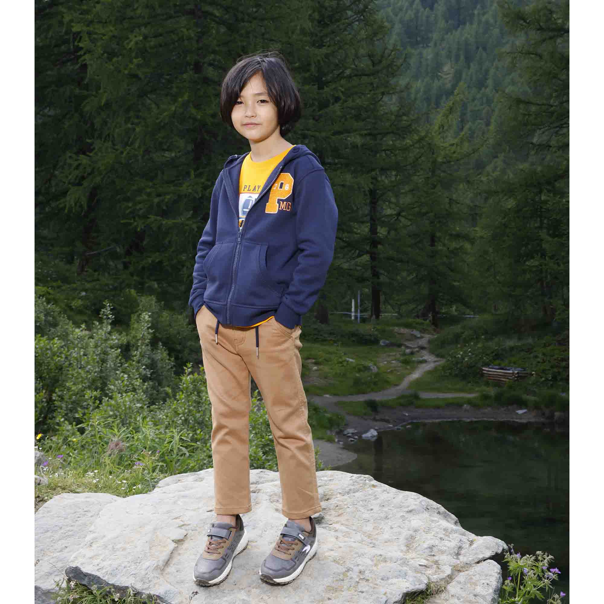 Pantalone in tessuto caldo ed elasticizzato con vita regolabile all'interno e lacci sul davanti. Chiusura con bottone e zip. Tasche laterali e tasche posteriori a filetto.