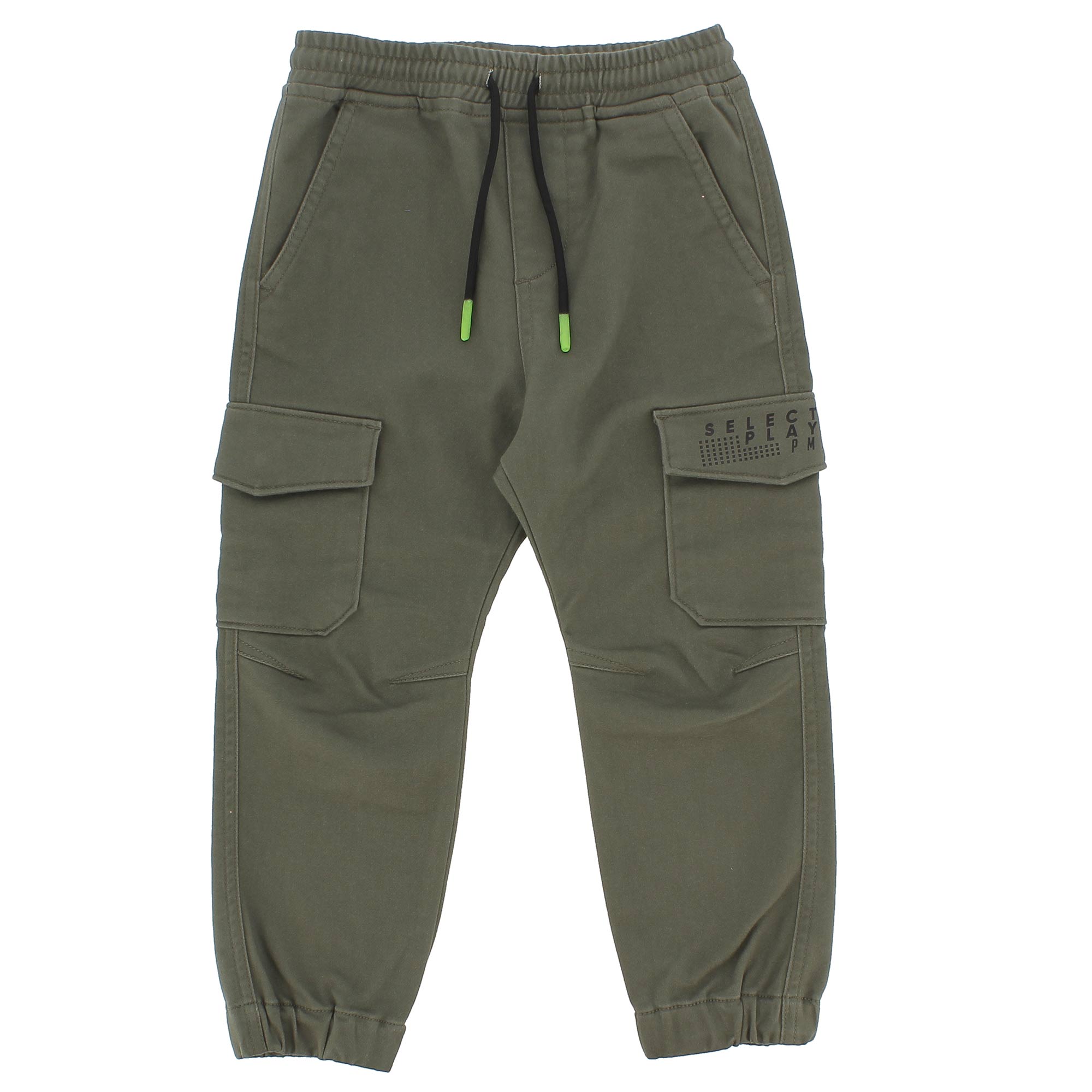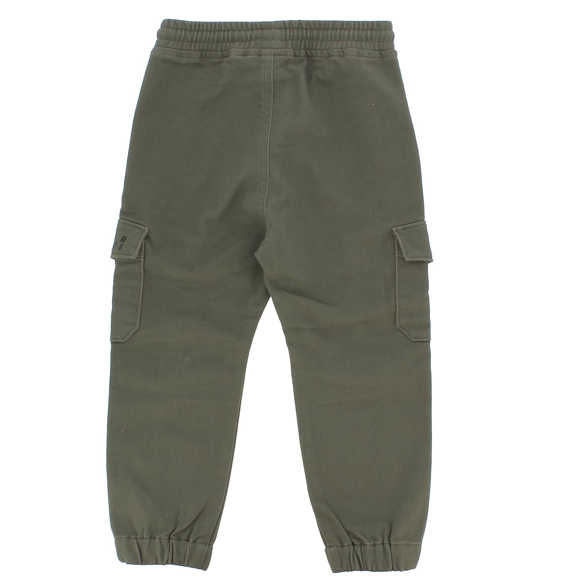 Pantalone con vita elasticizzata e lacci sul davanti. Tasche alla francese sul davanti e tasconi laterali con pattina. Stampa con scritte sulla pattina.