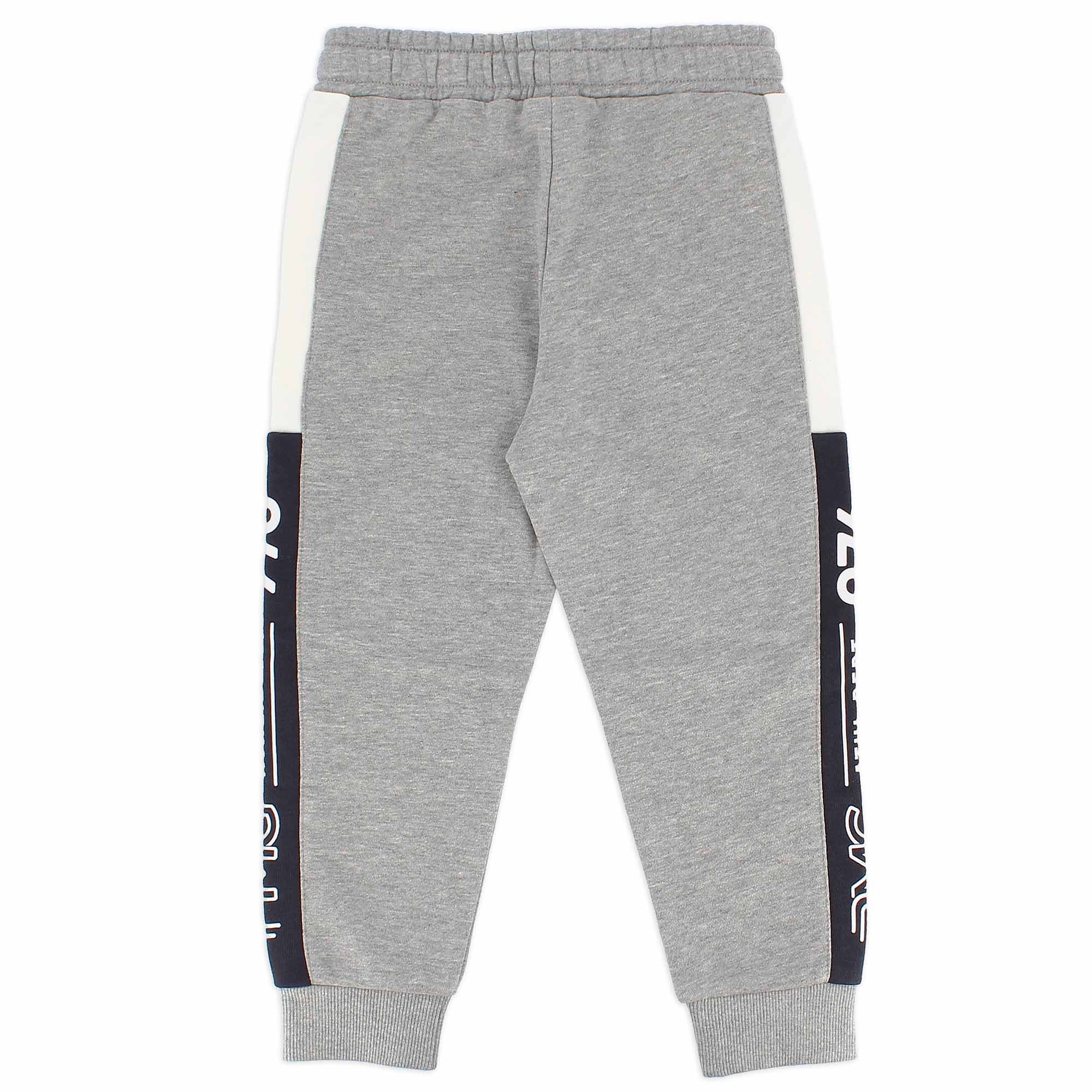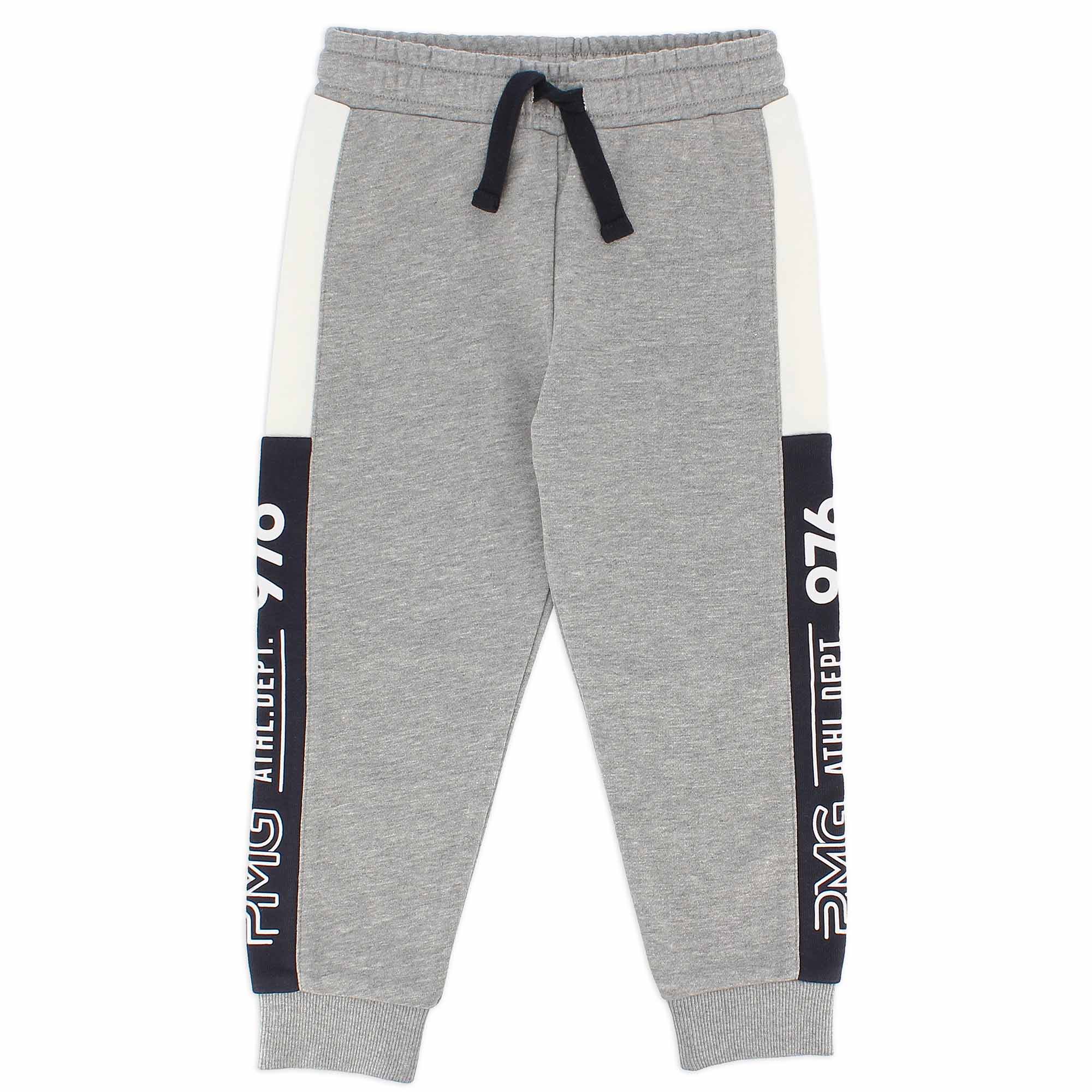 Pantalone in felpa con vita elasticizzata e lacci sul davanti. Bande laterali a contrasto con scritte stampate.