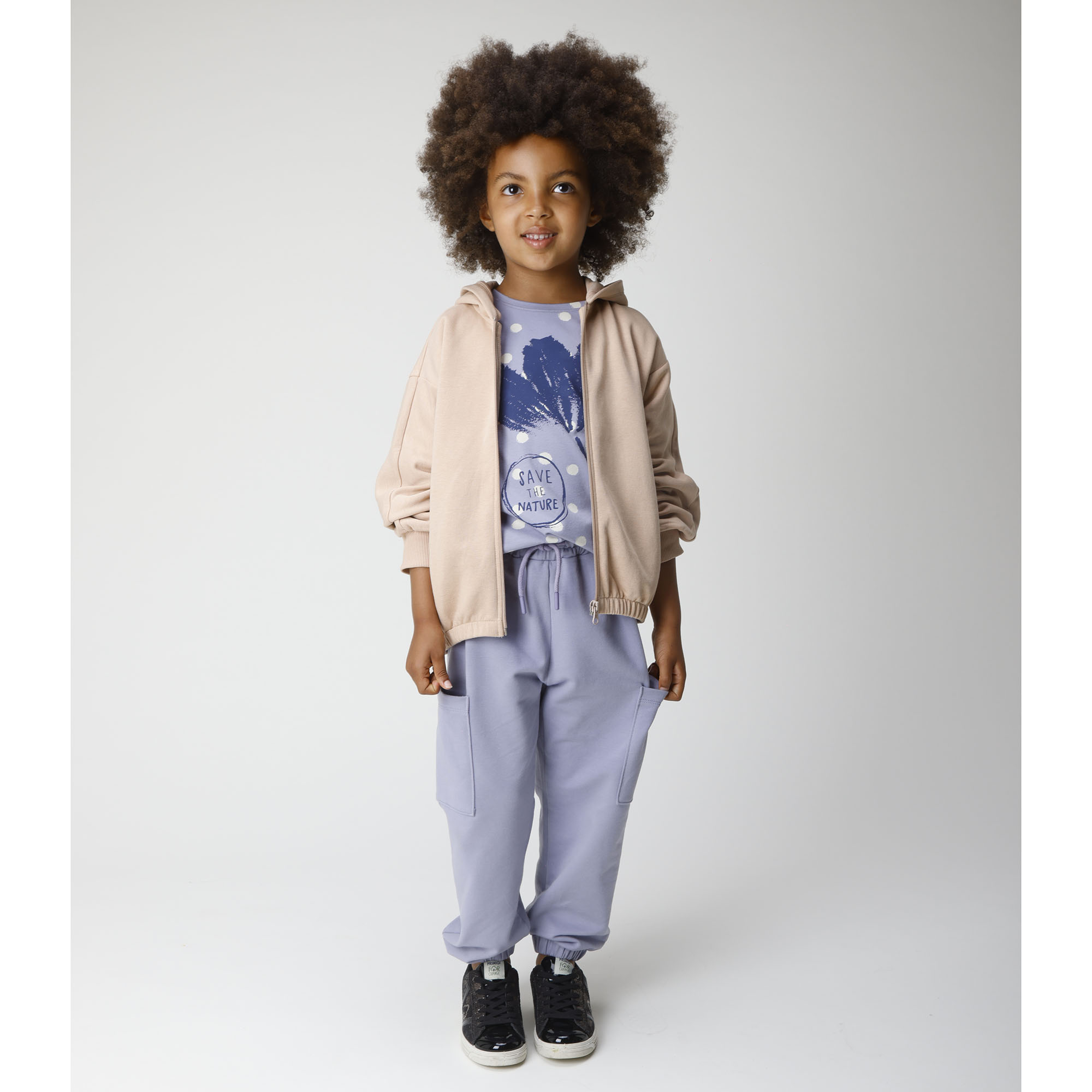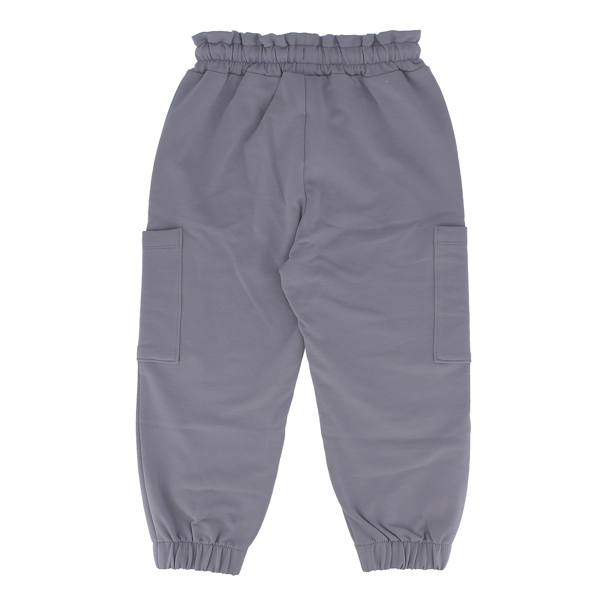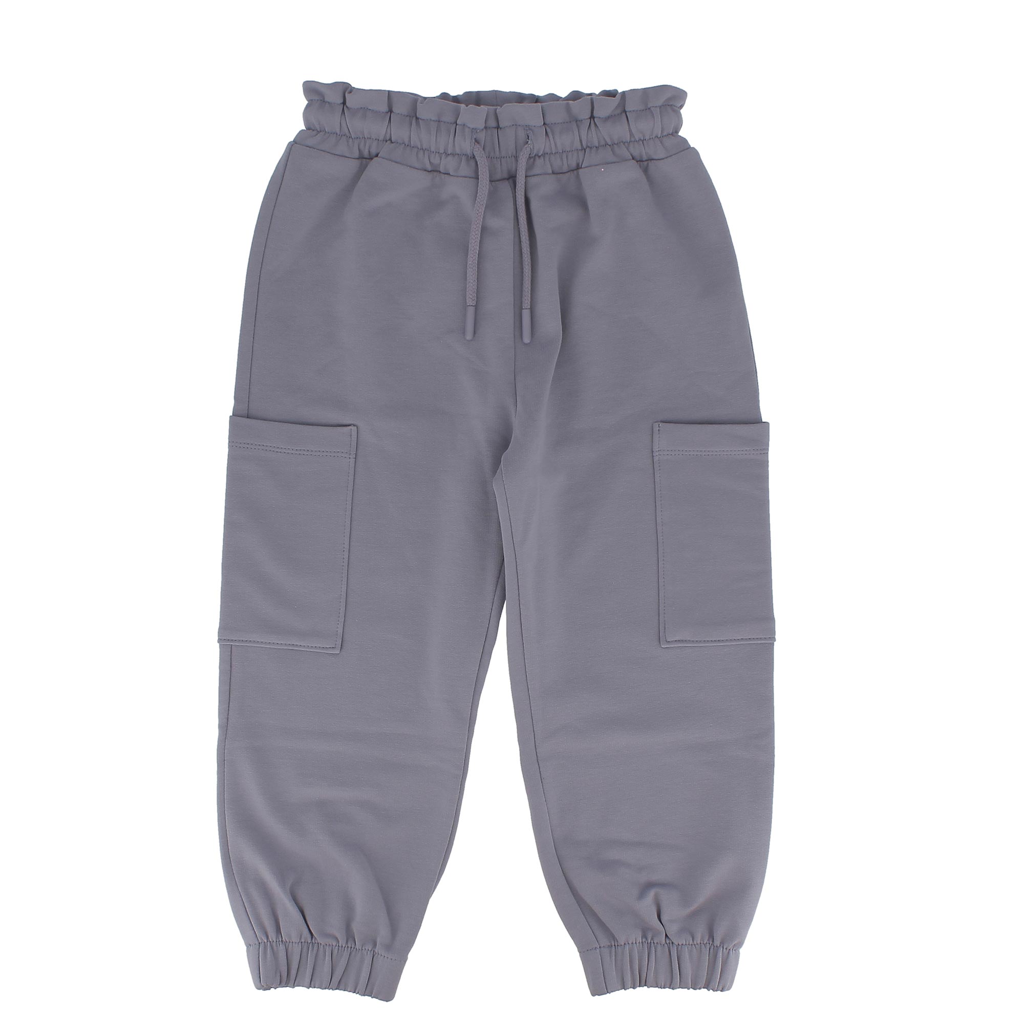 Pantalone in felpa con vita elasticizzata e lacci frontali. Tasconi laterali e fondo con elastico. Questo capo è ecosostenibile perché realizzato prevalentemente con cotone organico.