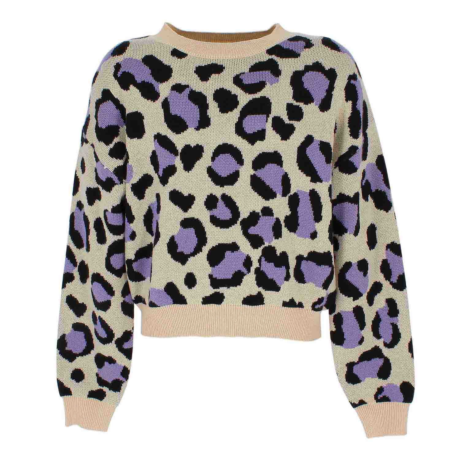 Pullover girocollo, a maniche lunghe. Fantasia animalier e profili in costina.