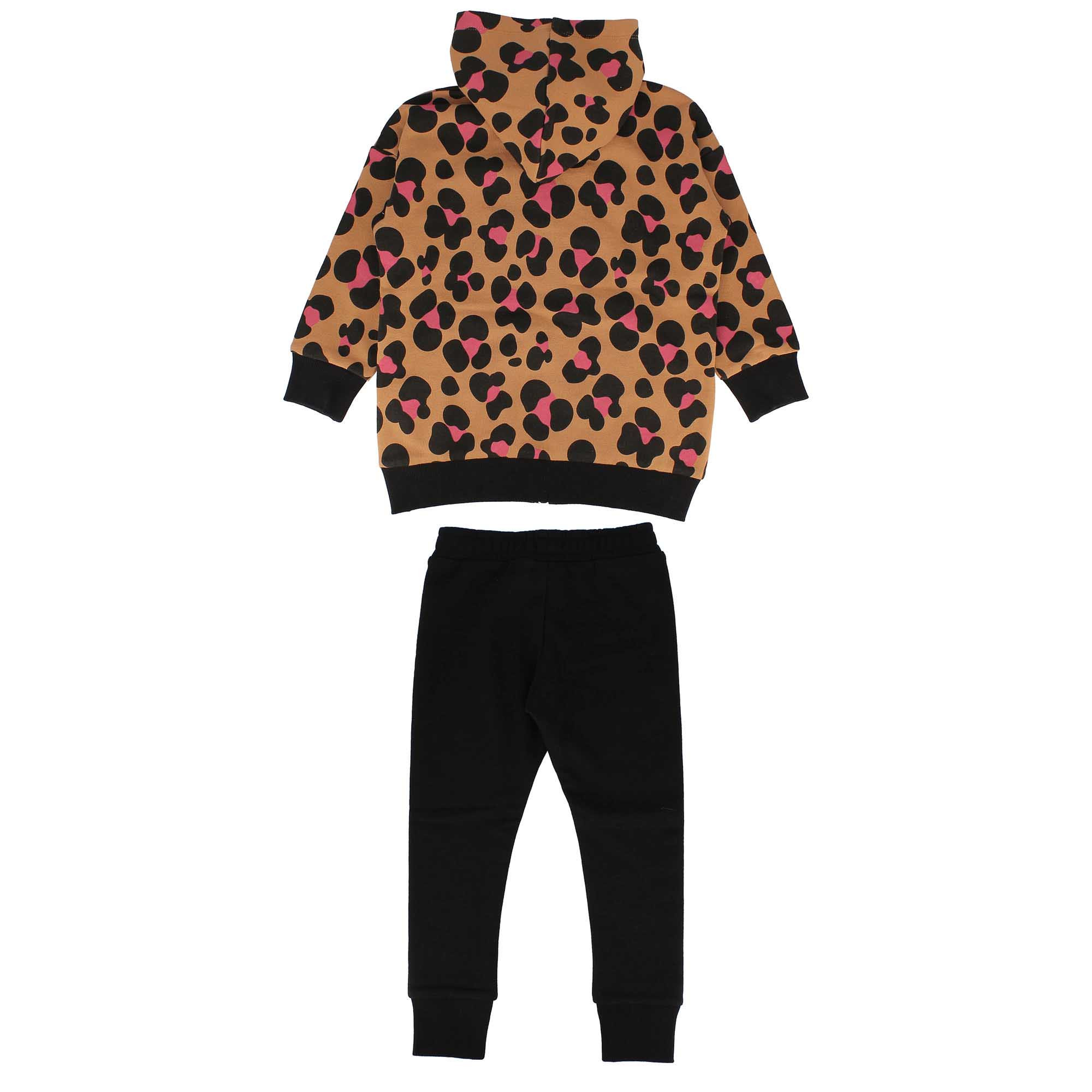 Tuta composta da due pezzi. Felpa con cappuccio, a maniche lunghe. Chiusura con zip sul davanti. Tasche laterali a scomparsa. Stampa all over animalier. Pantalone in felpa con vita elasticizzata. Bande laterali lurex e fondo in costina.