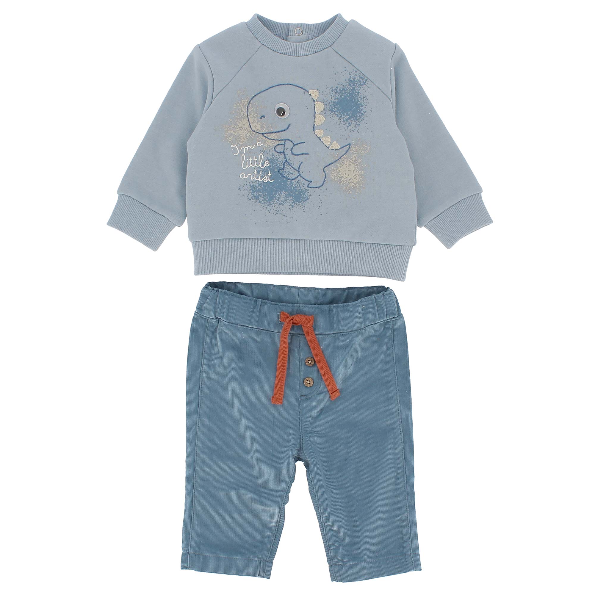 Completo composto da due pezzi. Felpa girocollo, a maniche lunghe. Chiusura posteriore con bottoni automatici. Dinosauro ricamato sul davanti. Pantalone in velluto a costine, con vita elasticizzata, lacci e bottoncini sul davanti.