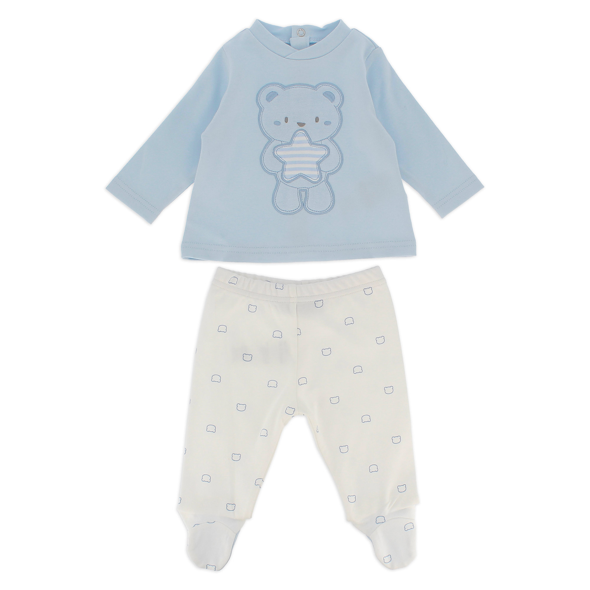 Completo composto da due pezzi. Maglietta in interlock girocollo, a maniche lunghe. Chiusura posteriore con bottoni automatici. Orsetto ricamato sul davanti. Ghettina in interlock con vita elasticizzata e piedini, stampa all-over con orsetti.