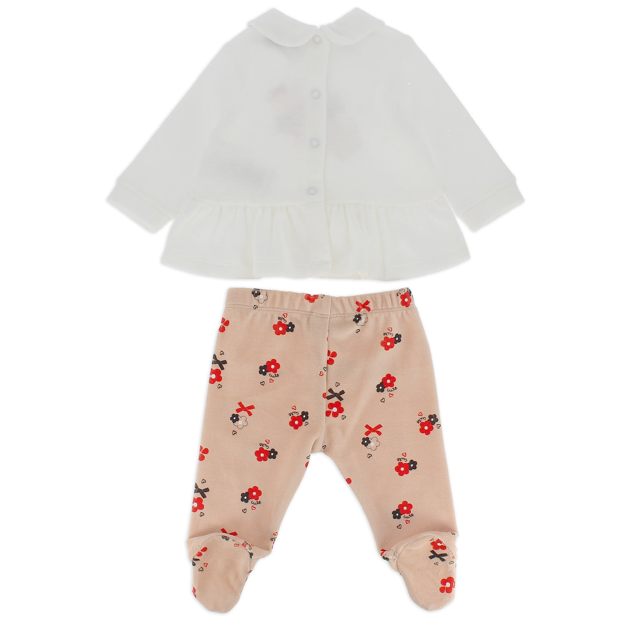 Completo composto da due pezzi. Maglietta in ciniglia con colletto, a maniche lunghe. Chiusura posteriore con bottoni automatici. Volant sul fondo e fiorellini ricamati sul davanti. Ghettina in ciniglia con vita elasticizzata e piedini. Stampa all-over con fiorellini.