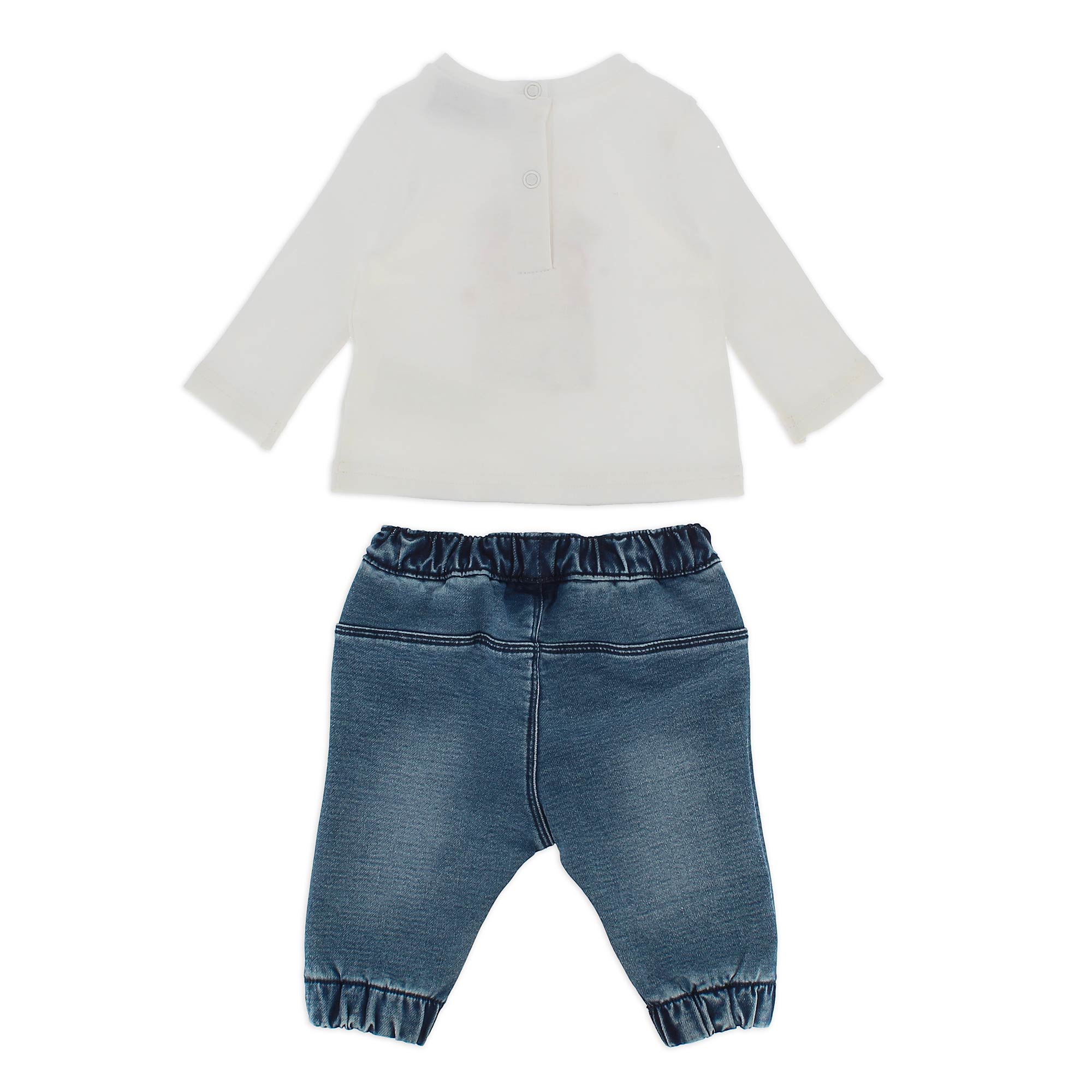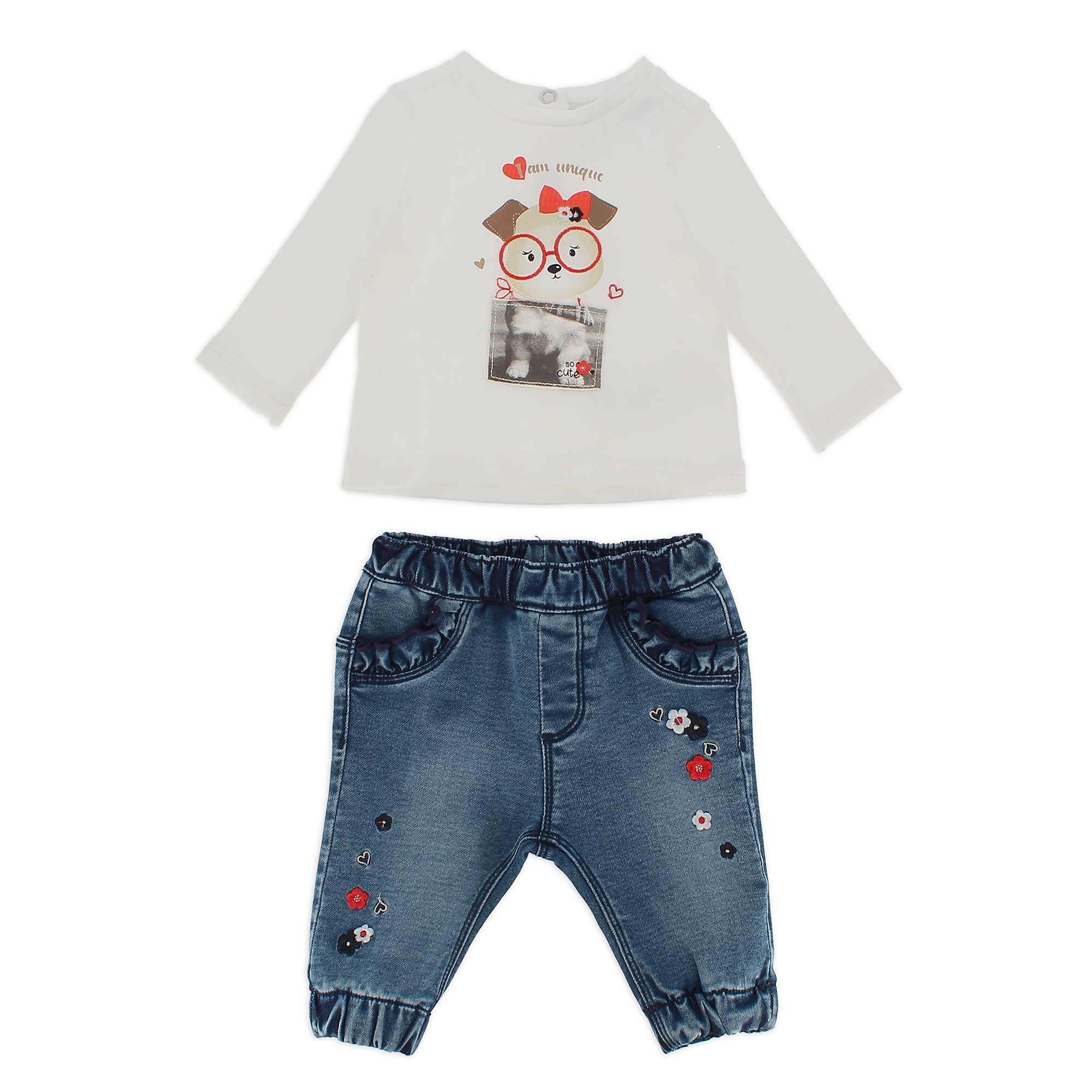 Completo composto da due pezzi. Maglietta in jersey, a maniche lunghe. Chiusura con bottoncini automatici sul retro. Cagnolino ricamato sul davanti. Pantalone in jeans a maglia, con vita elasticizzata. Fondo con elastico e tasche laterali con volants. Fiorellini ricamati sui lati.