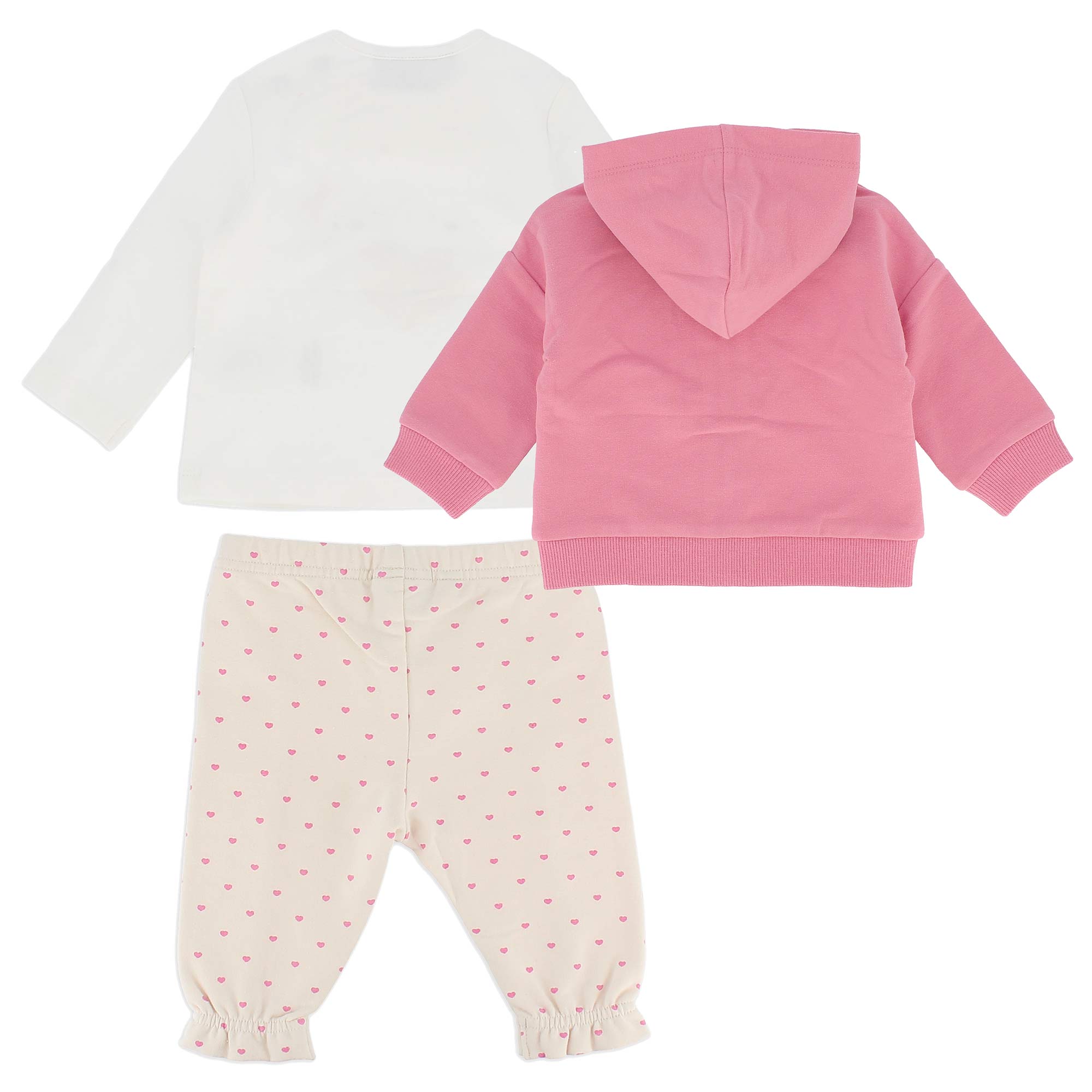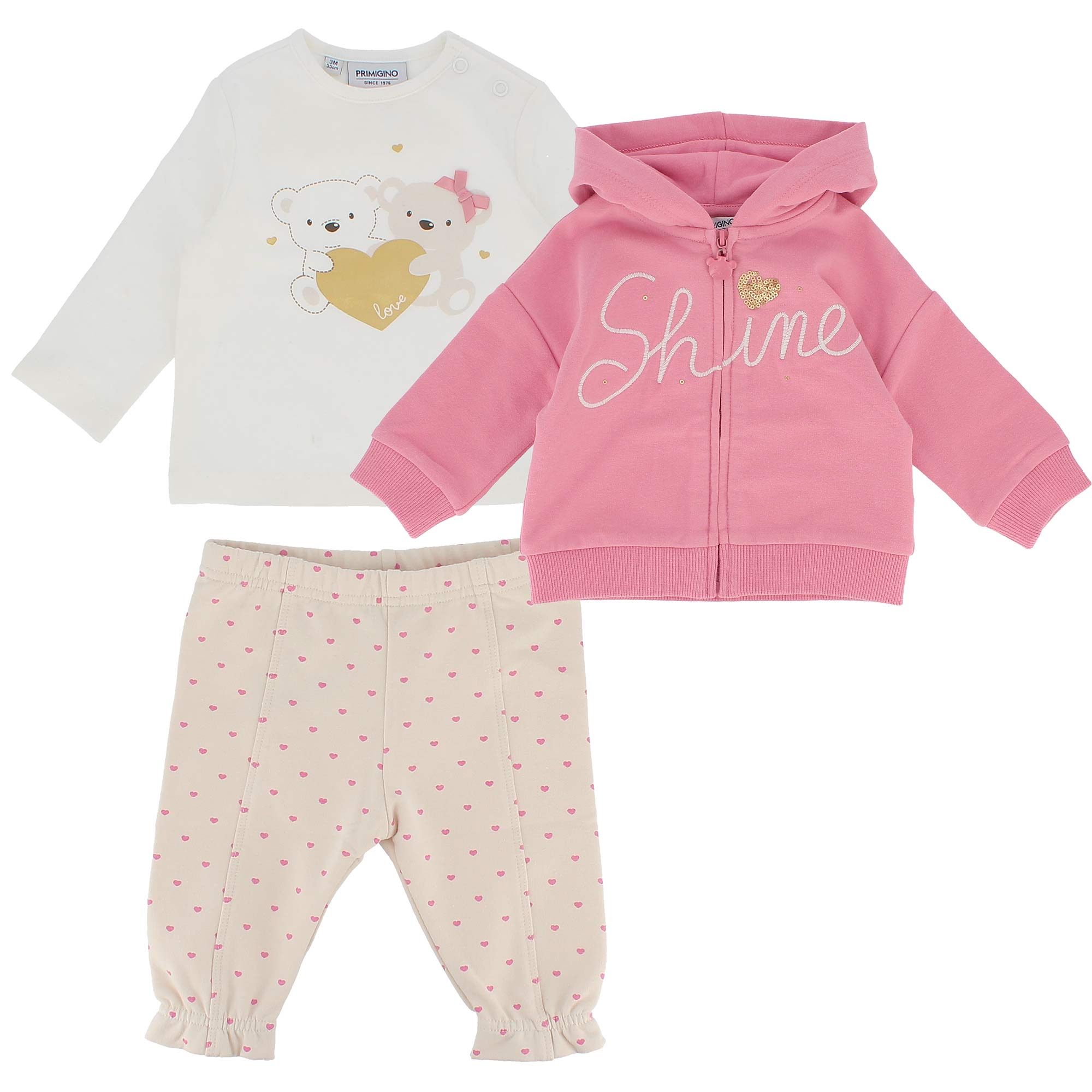 Completo composto da tre pezzi. Felpa aperta con cappuccio, a maniche lunghe. Chiusura con zip sul davanti. Scritta ricamata sul davanti, con cuore di paillettes. Maglietta un jersey girocollo, a maniche lunghe. Chiusura con bottoncini automatici sulla spalla. Stampa orsetti sul davanti. Pantalone in felpa, con vita elasticizzata. Stampa all over di cuoricini.