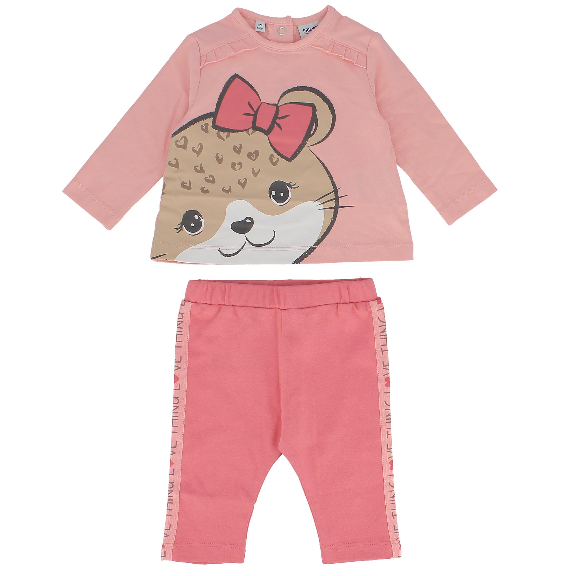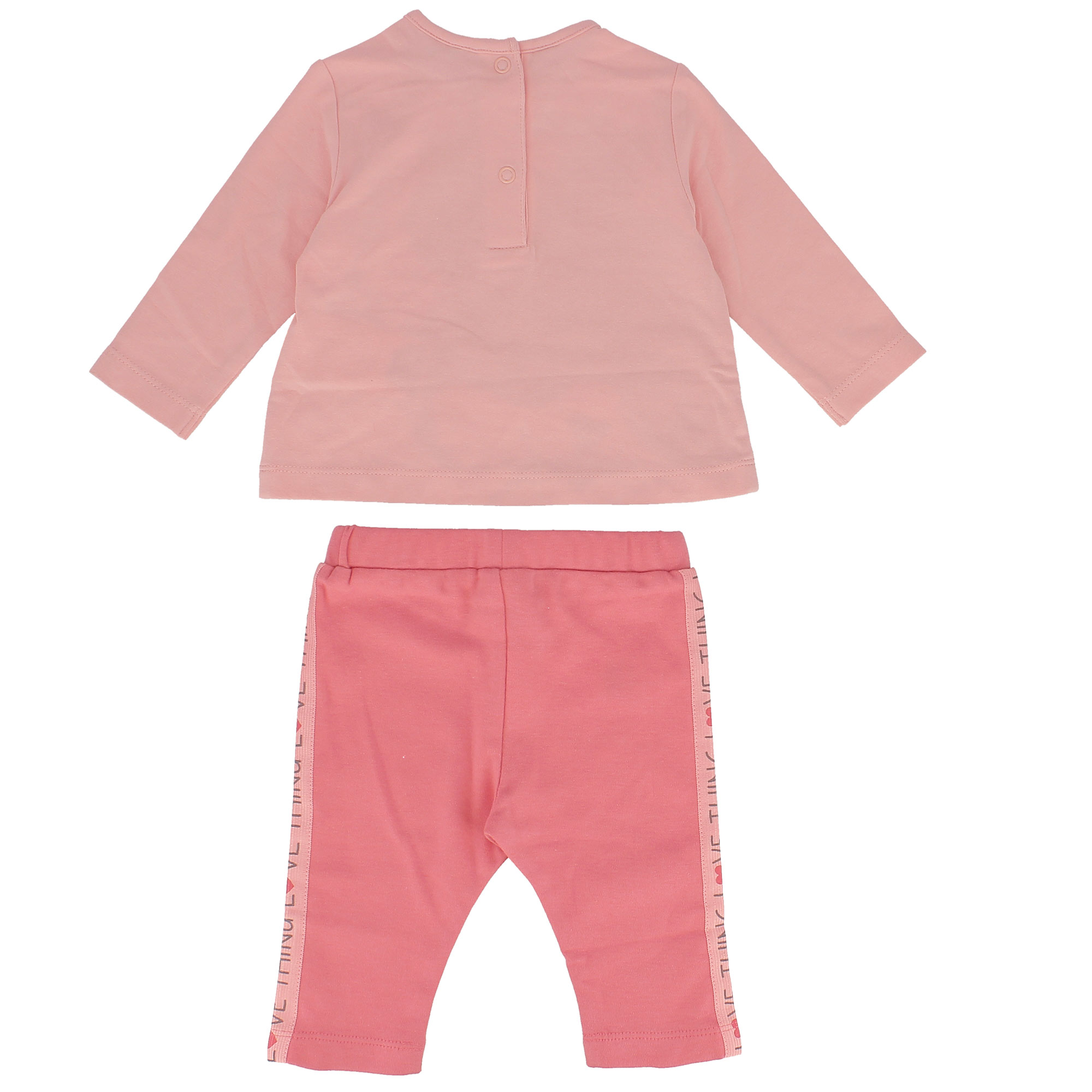 Completo composto da due pezzi. Maglietta in jersey, a maniche lunghe. Chiusura con bottoncini automatici sul retro. Stampa con animaletto e piccoli volant sul davanti. Leggings con vita elasticizzata. Banda laterale con scritte stampate.
