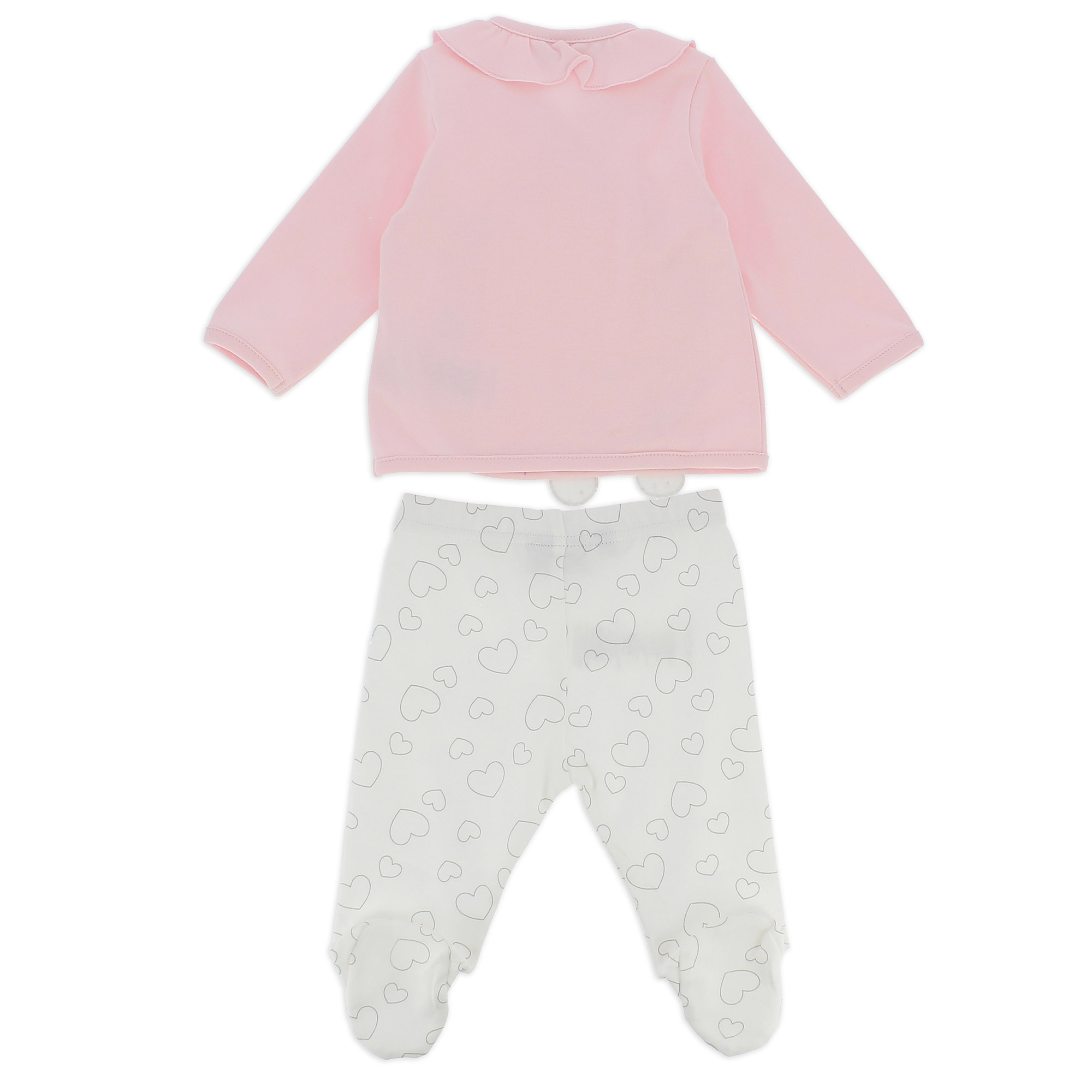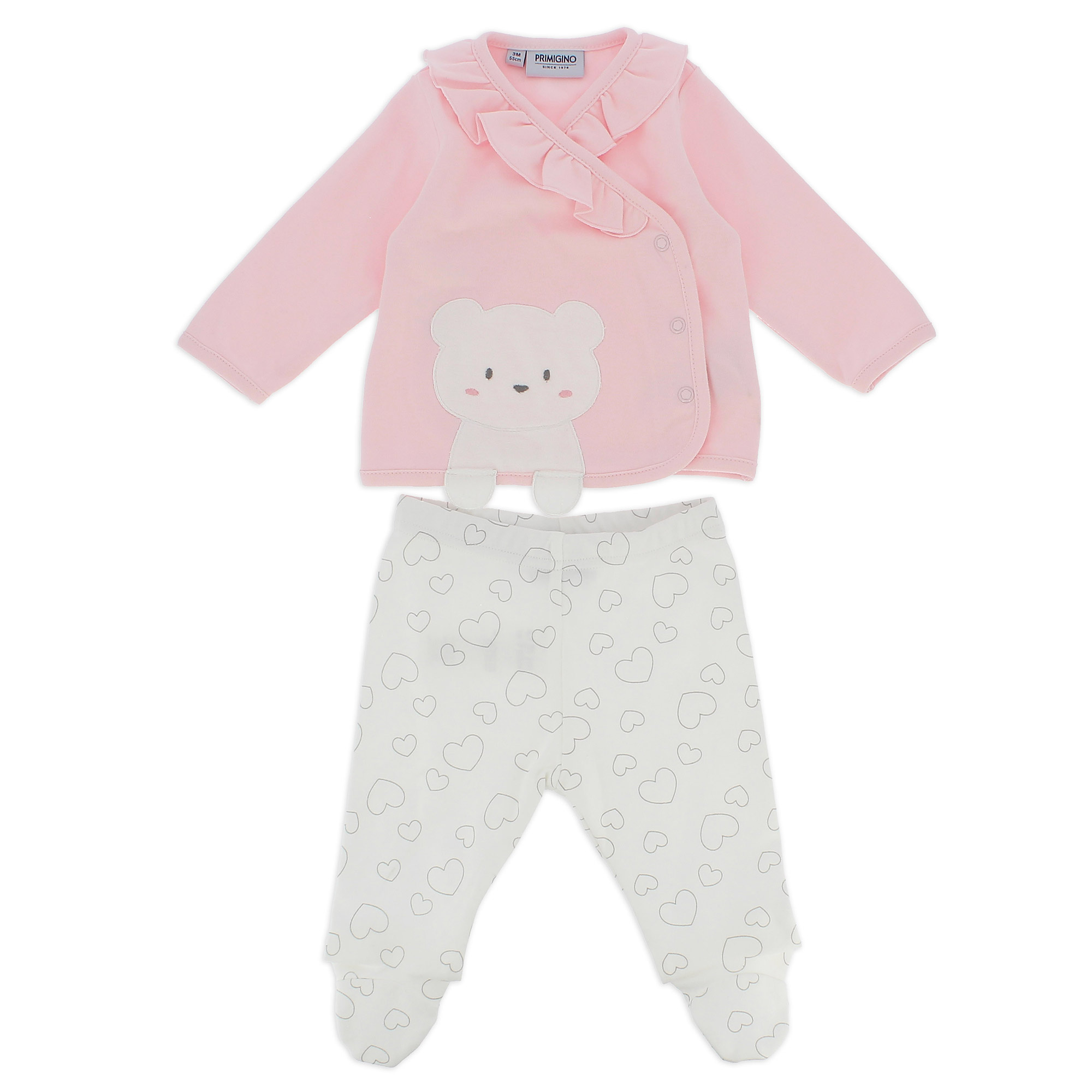 Completo composto da due pezzi. Maglietta in interlock con scollo a V, a maniche lunghe. Chiusura a kimono con bottoncini automatici sul fianco. Piccoli volants sullo scollo e orsetto ricamato sul davanti. Ghettina in interlock con vita elasticizzata e piedini, stampa all-over con cuoricini.