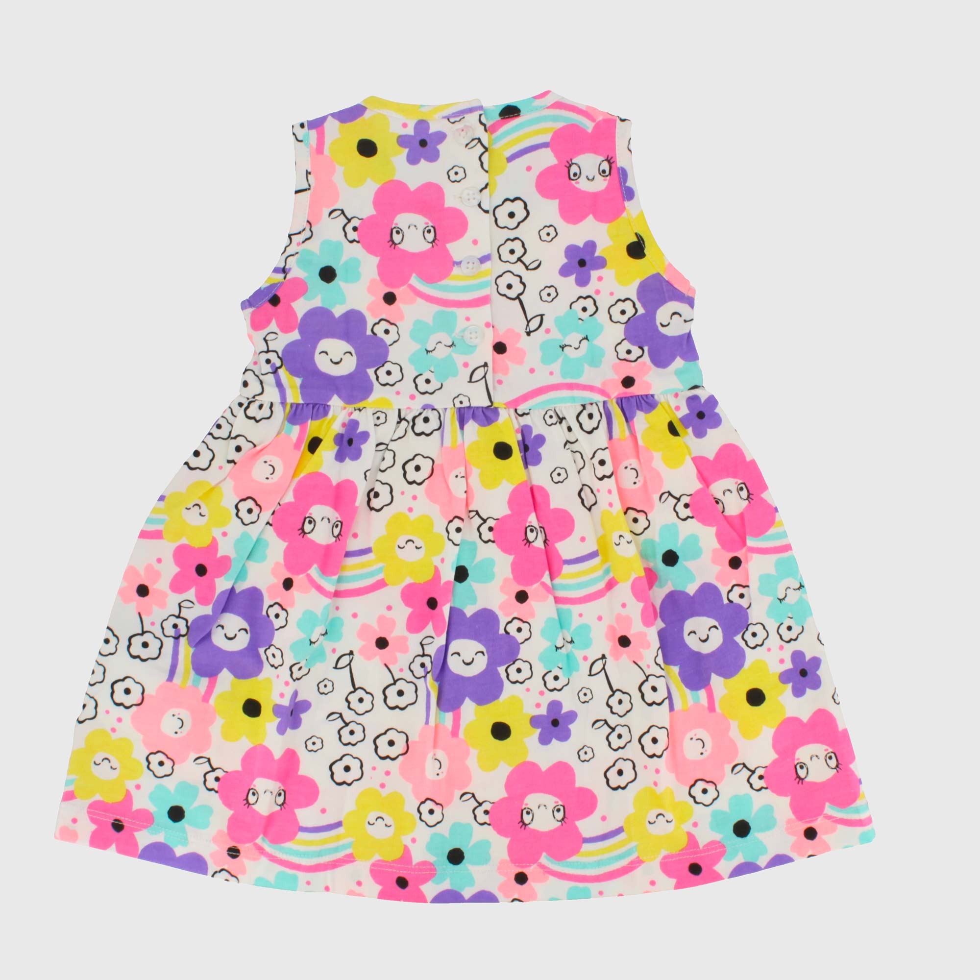 Copricostume in jersey, girocollo, senza maniche. Chiusura posteriore con bottoni. Stampa all-over con fiori e arcobaleni.