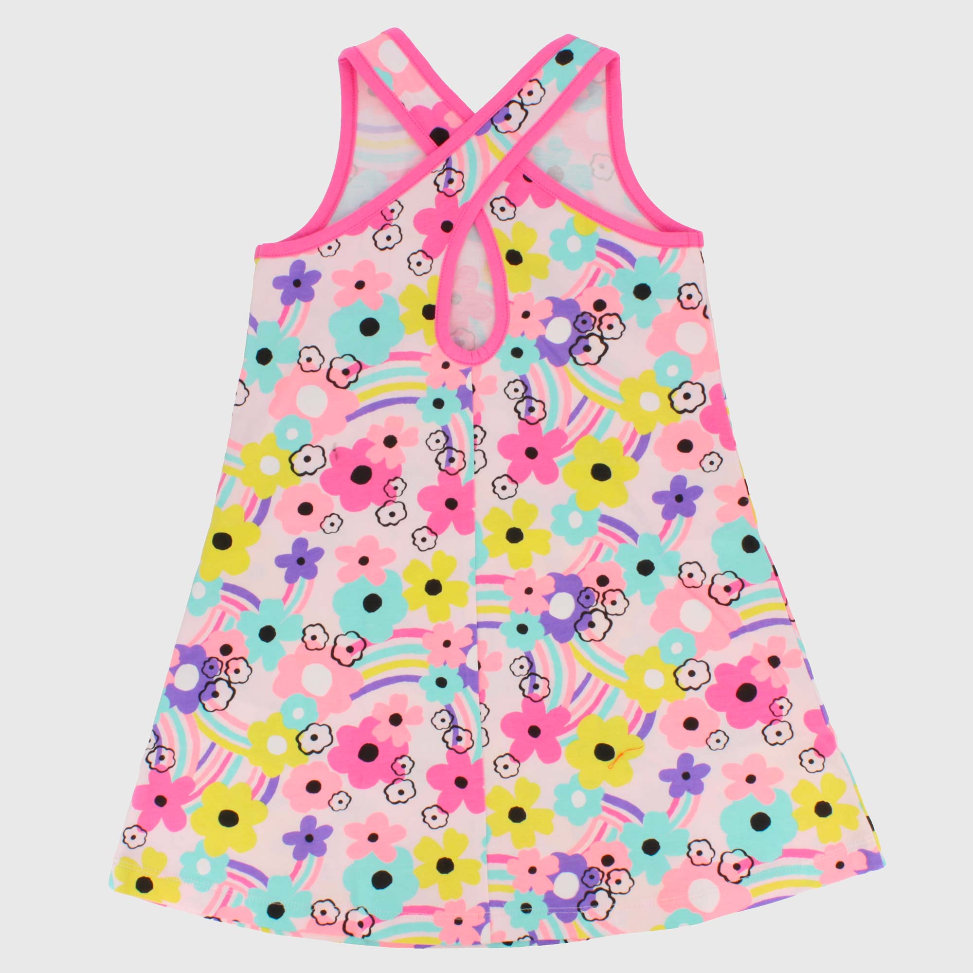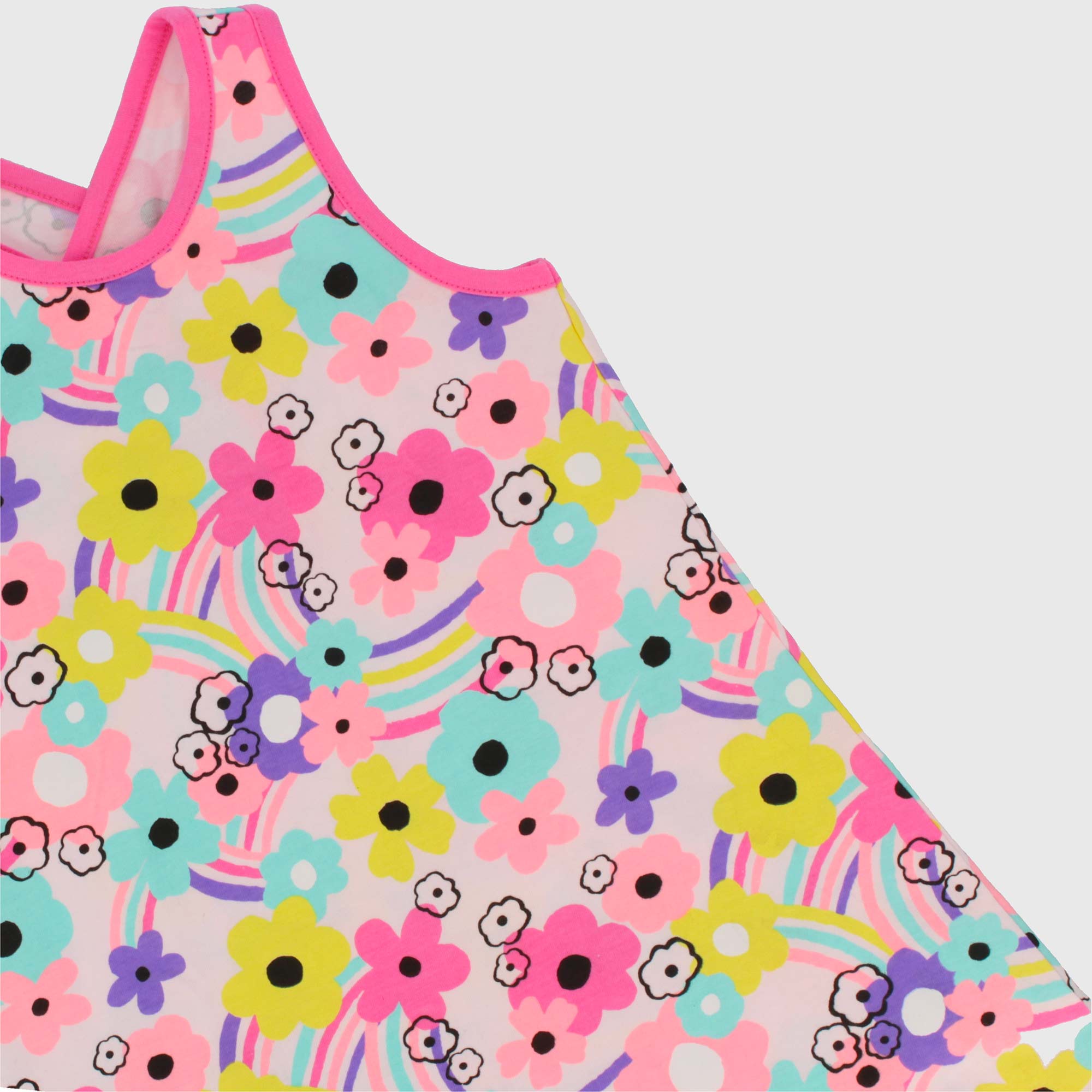 Copricostume in jersey. Bretelline incrociate sul retro e profili a contrasto. Stampa all-over con fiori e arcobaleni.