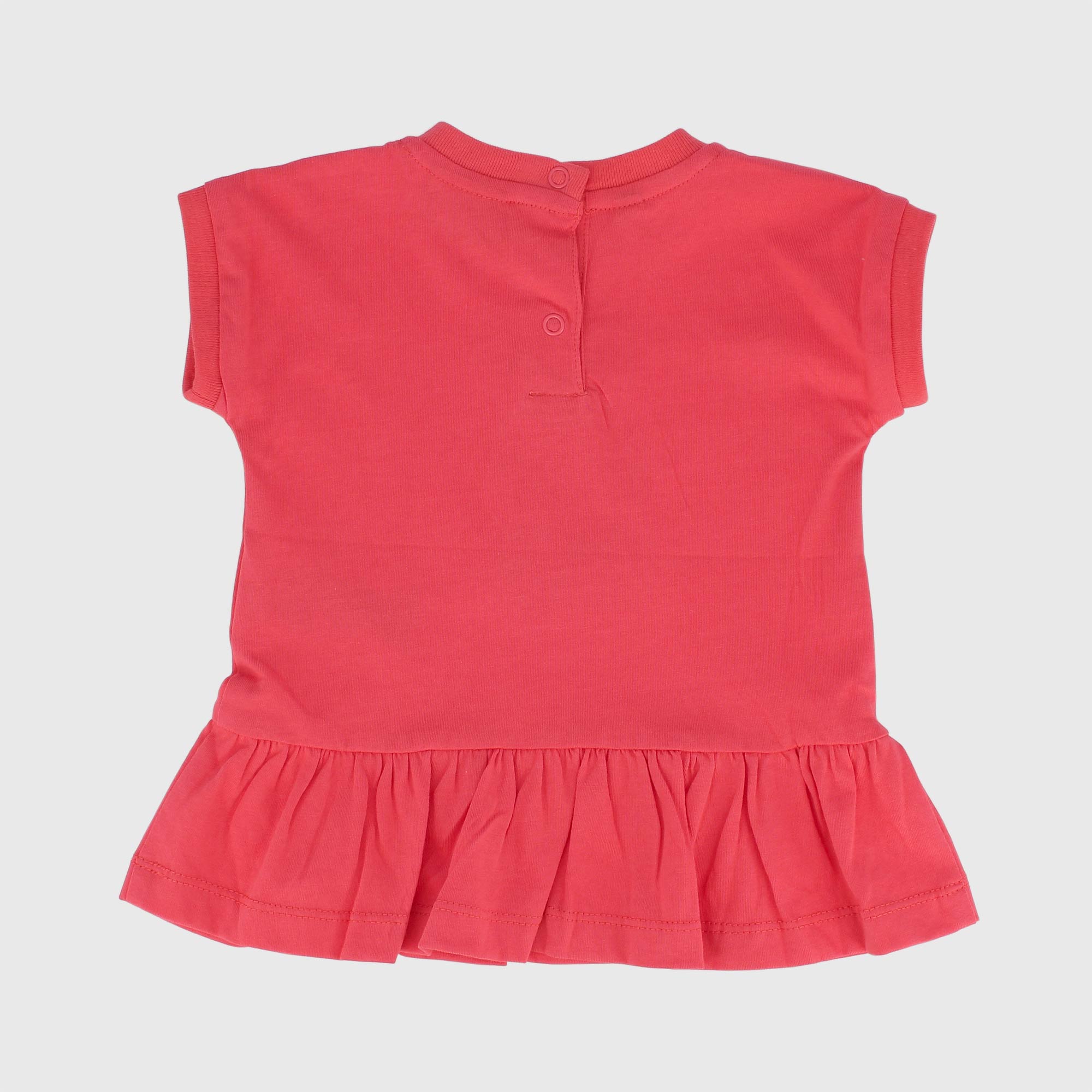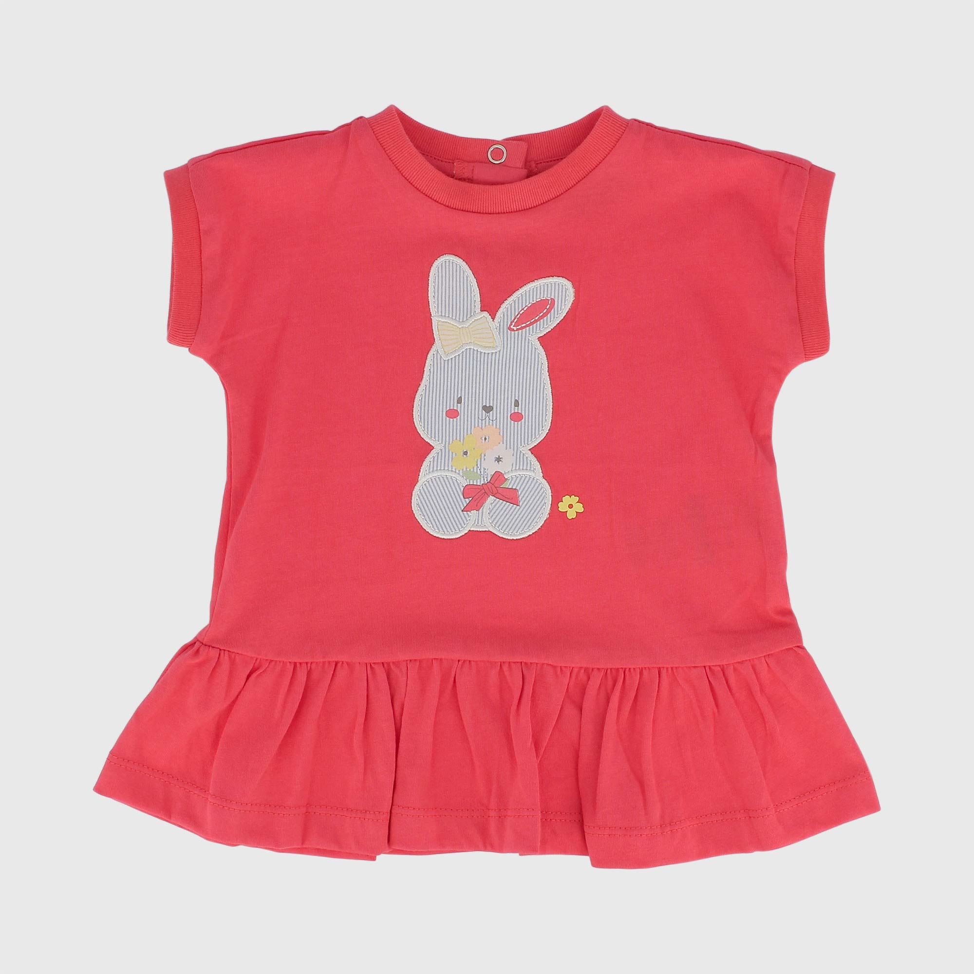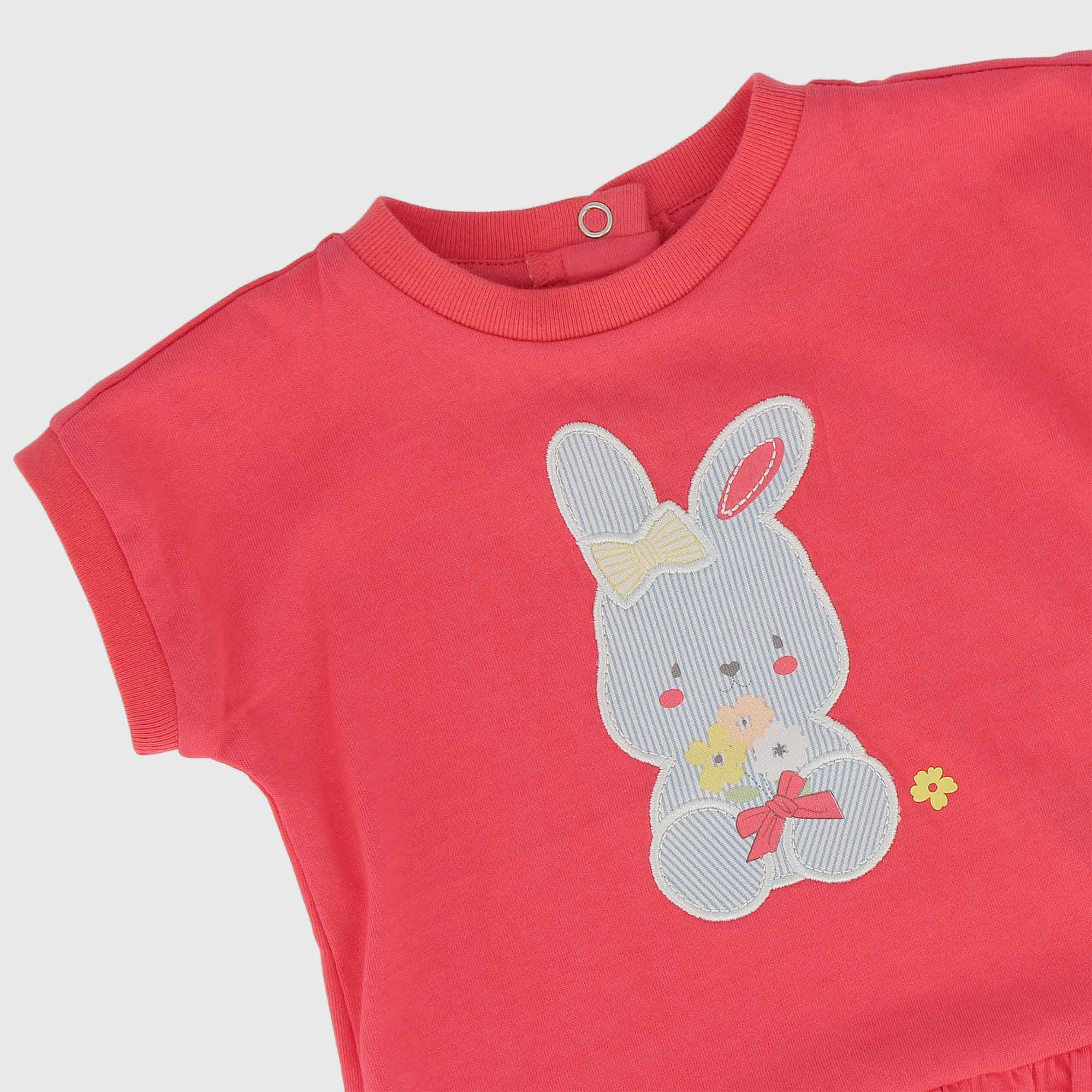 Vestito in jersey girocollo, a maniche corte. Chiusura posteriore con bottoni automatici. Gonna con volants e motivo "coniglietto" sul davanti.