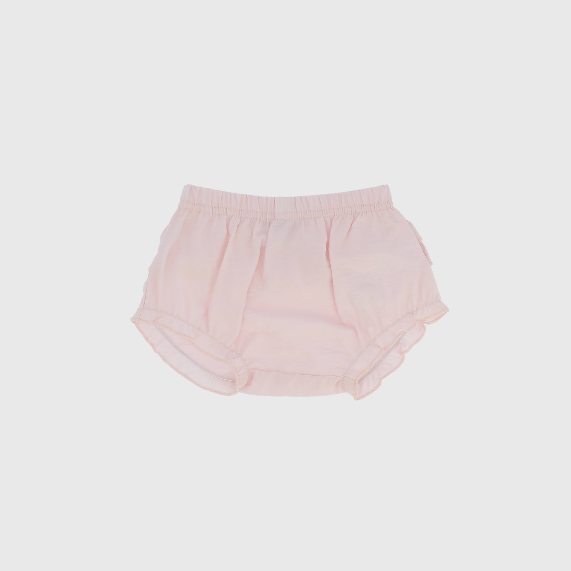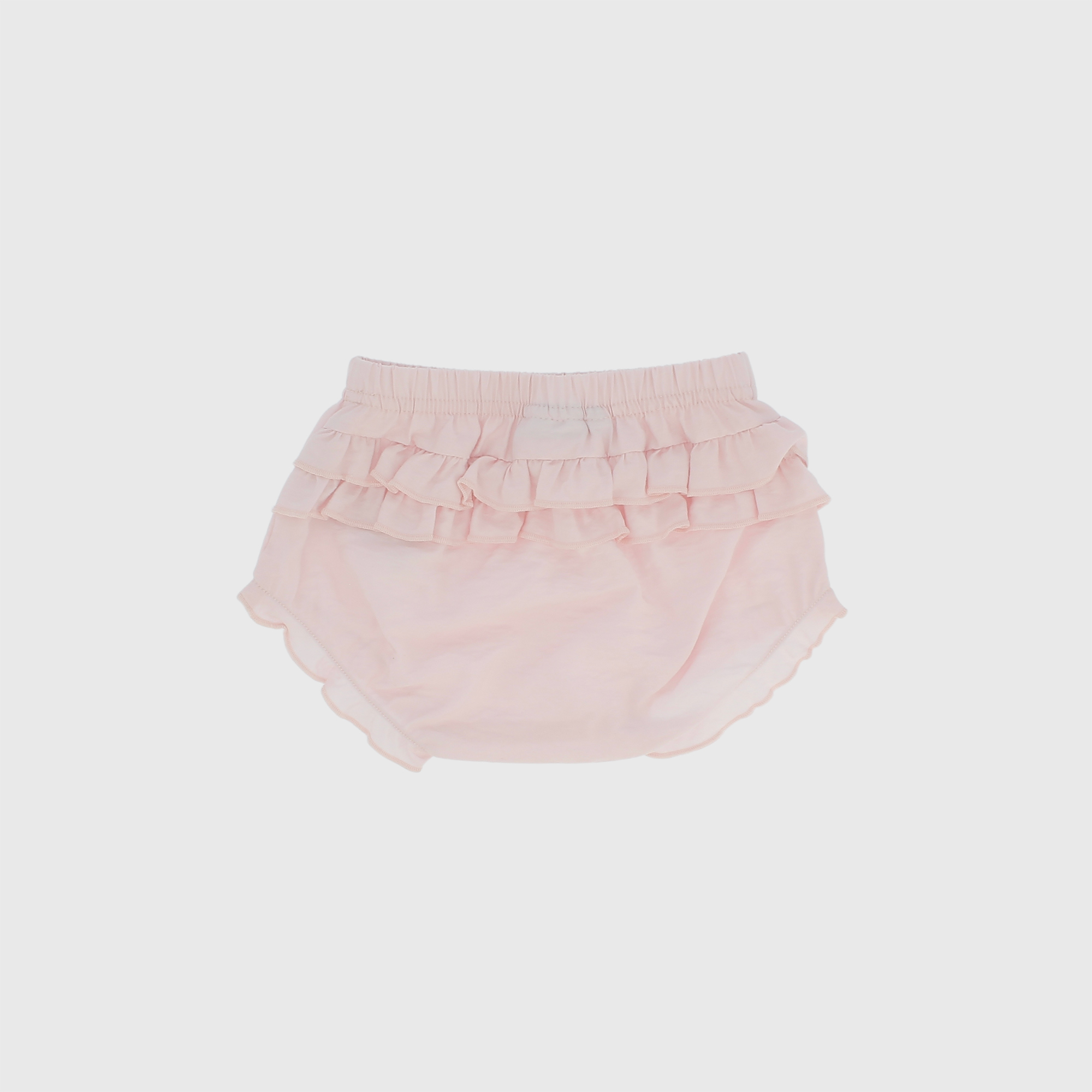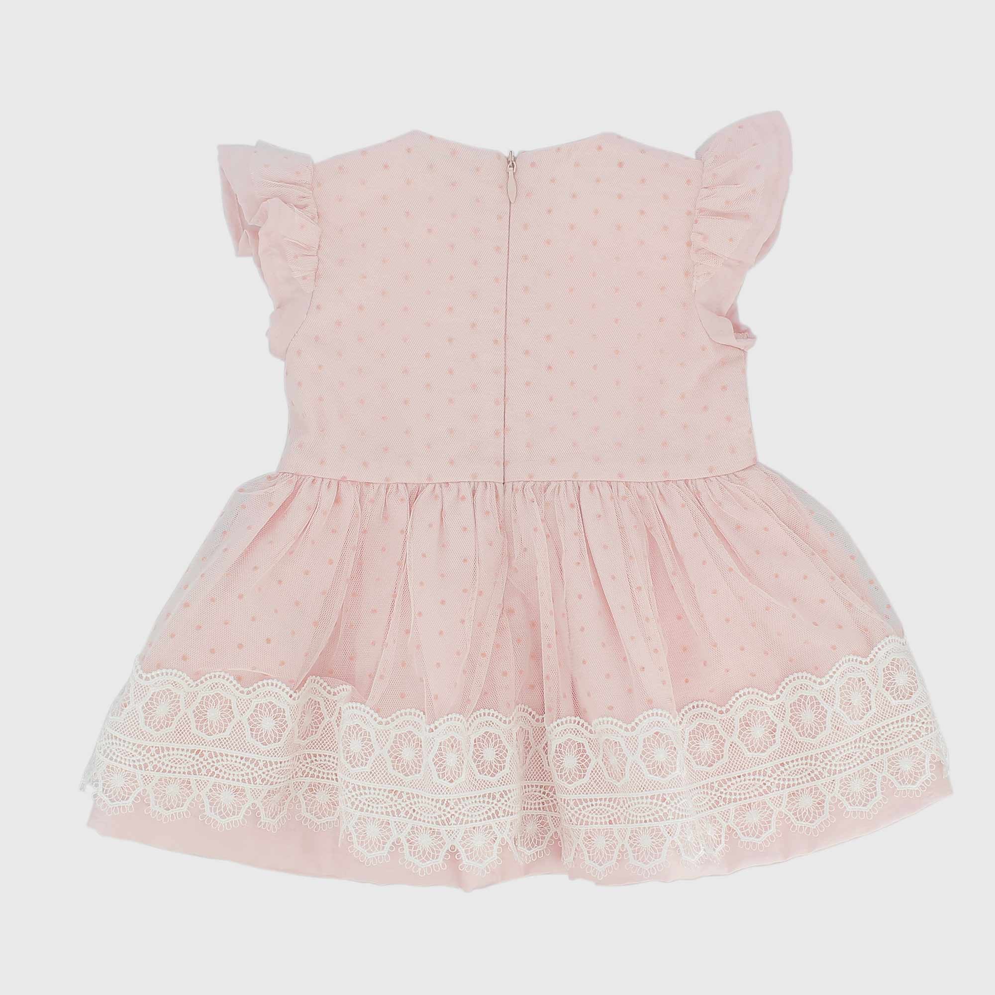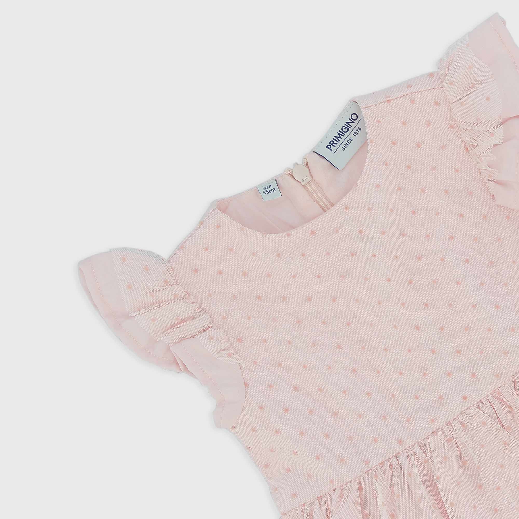 Vestito in viscosa doppiato in tulle con stampa micro-pois, con applicazione di pizzo sul fondo. Scollo rotondo e maniche corte con volants. Culotte abbinata, con vita elasticizzata e rouches sul retro.