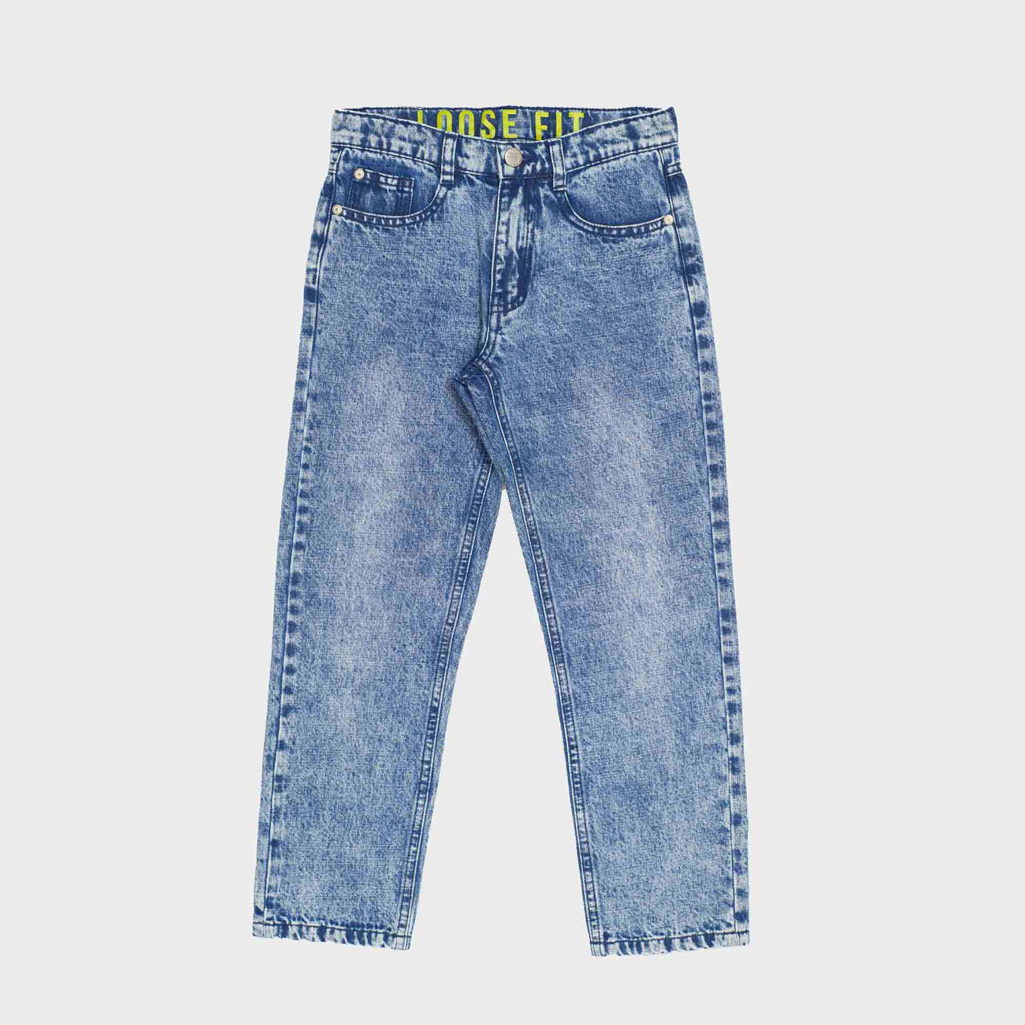 Pantalone in jeans con vita regolabile all'interno. Chiusura con bottone e zip. Cinque tasche. Loose fit.