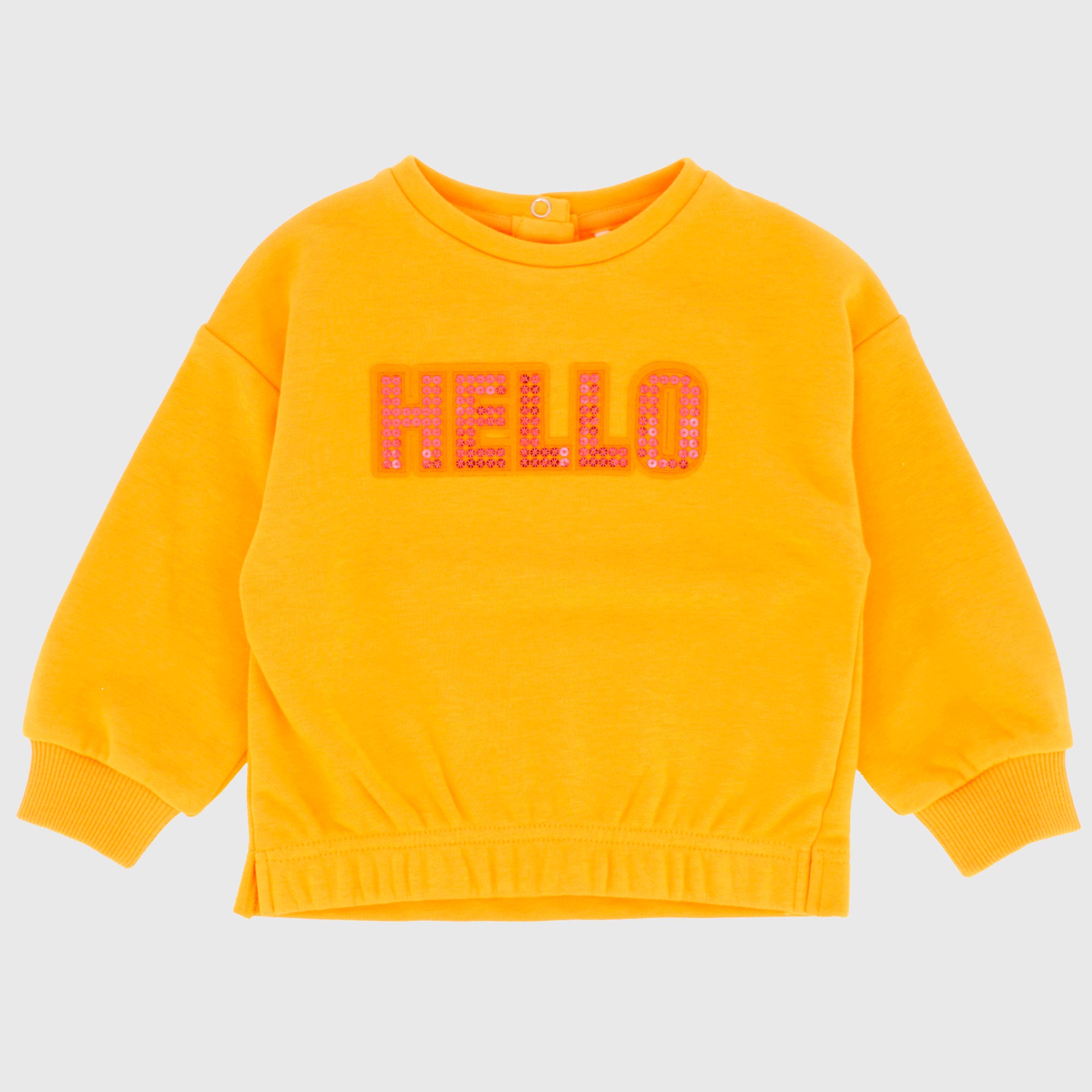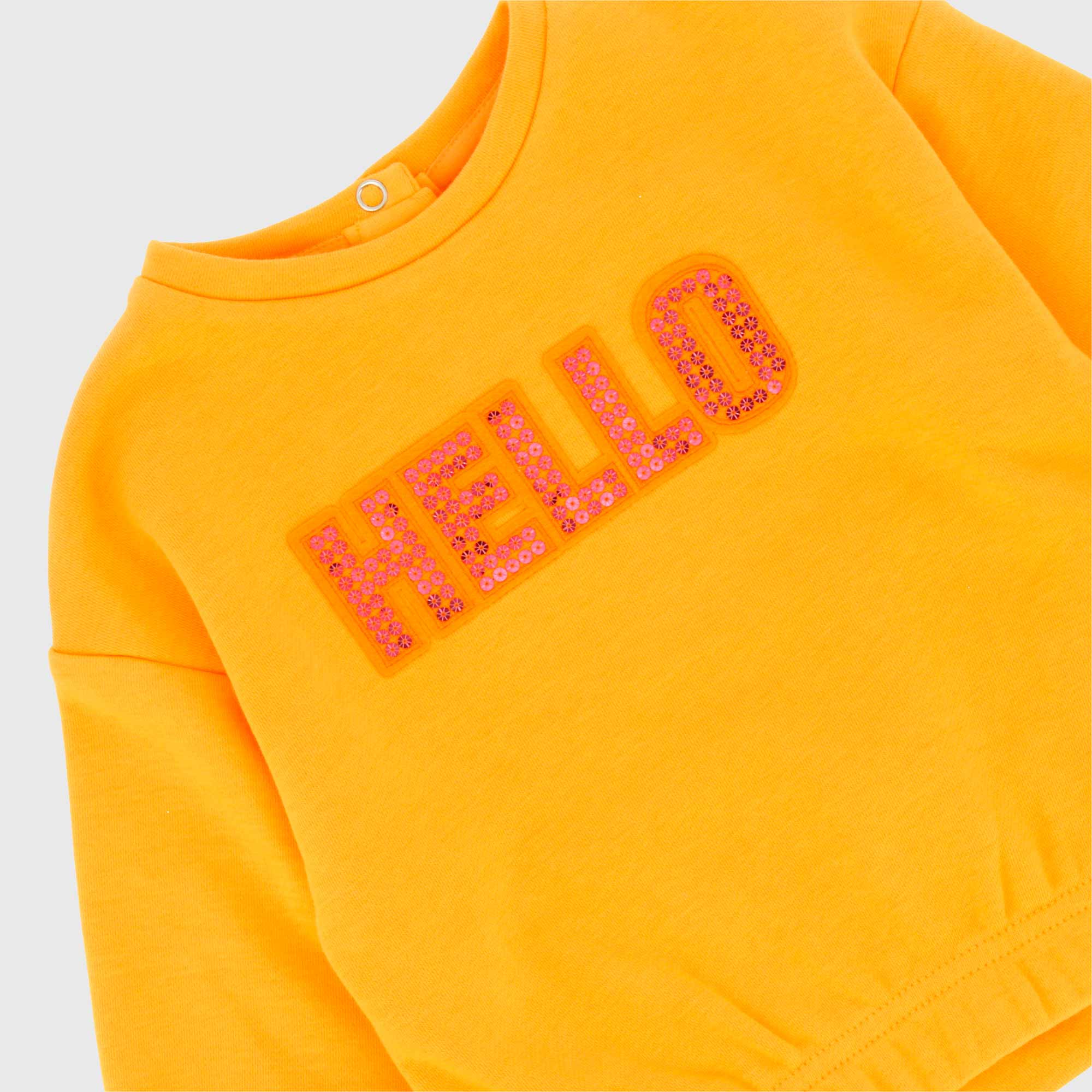 Felpa girocollo a maniche lunghe. Chiusura posteriore con bottoni automatici. Patch con scritta di paillettes davanti. Fondo in elastico.