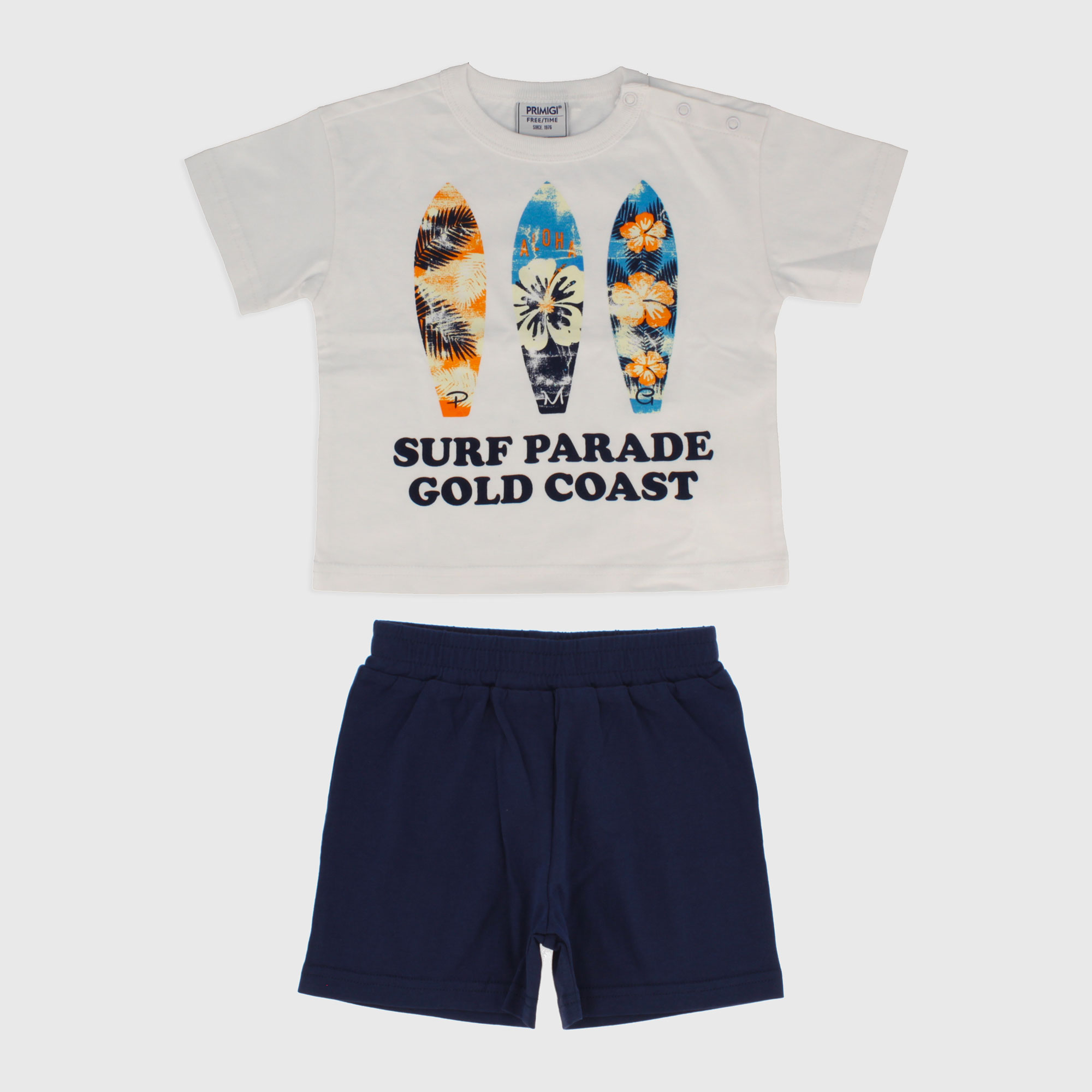 Completo composto da due pezzi. Maglietta in jersey girocollo, a maniche corte. Chiusura con bottoni automatici sulla spalla. Stampa frontale. Bermuda in jersey con vita elasticizzata.