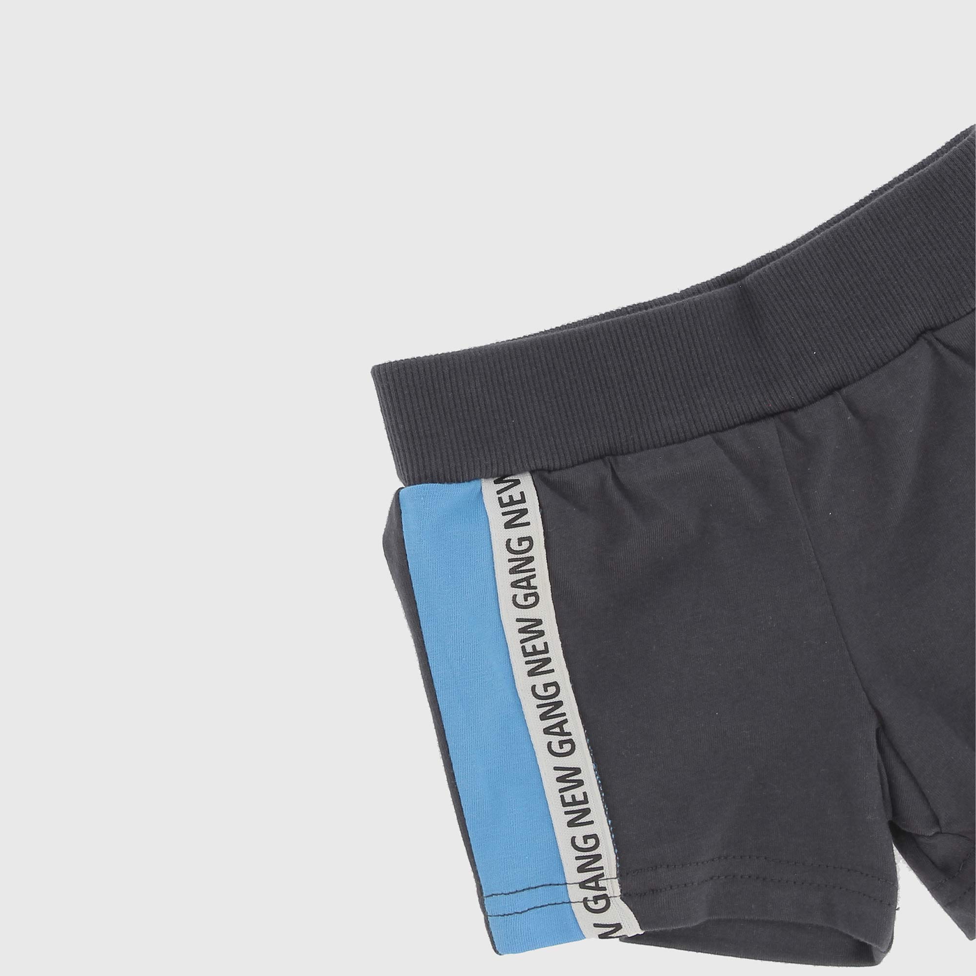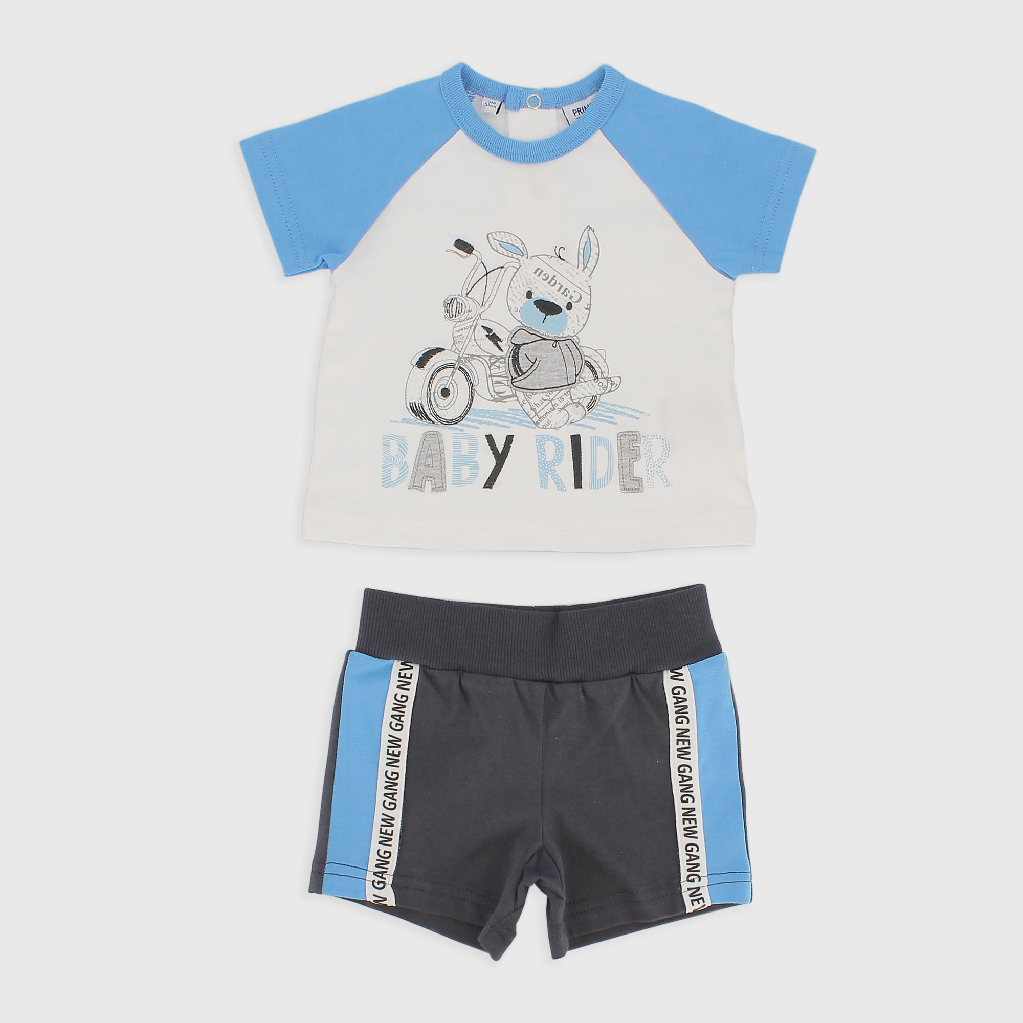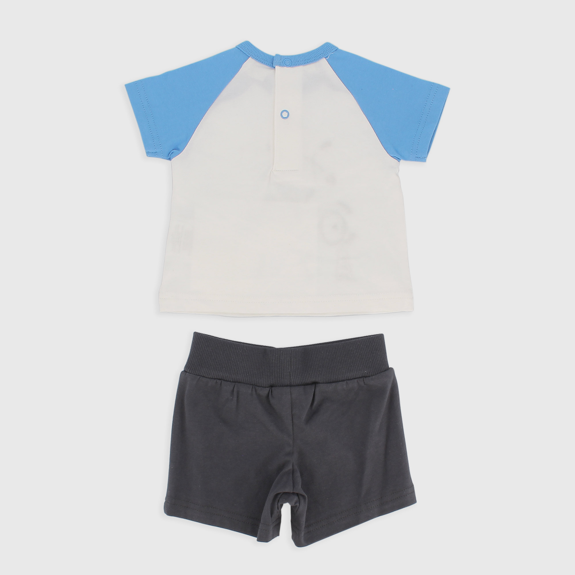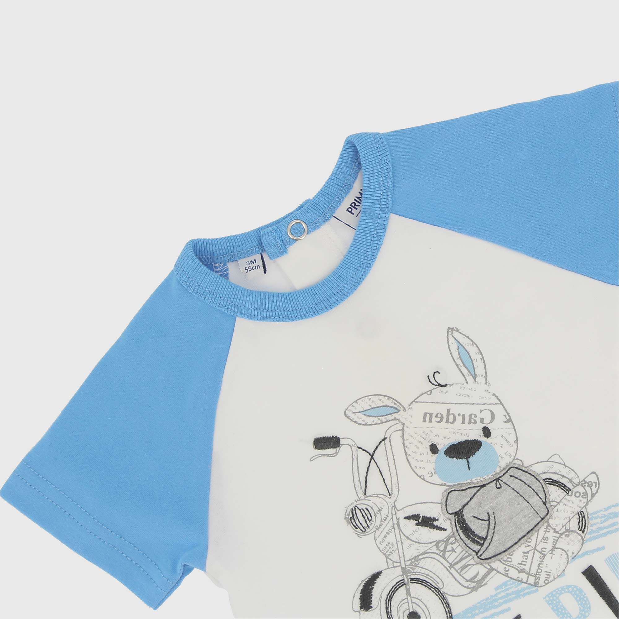 Completo composto da due pezzi. Maglietta in jersey girocollo, a maniche corte. Chiusura posteriore con bottoni automatici. Stampa frontale con coniglietto ricamato. Pantaloncino in jersey con vita elasticizzata. Banda laterale a contrasto con scritte.