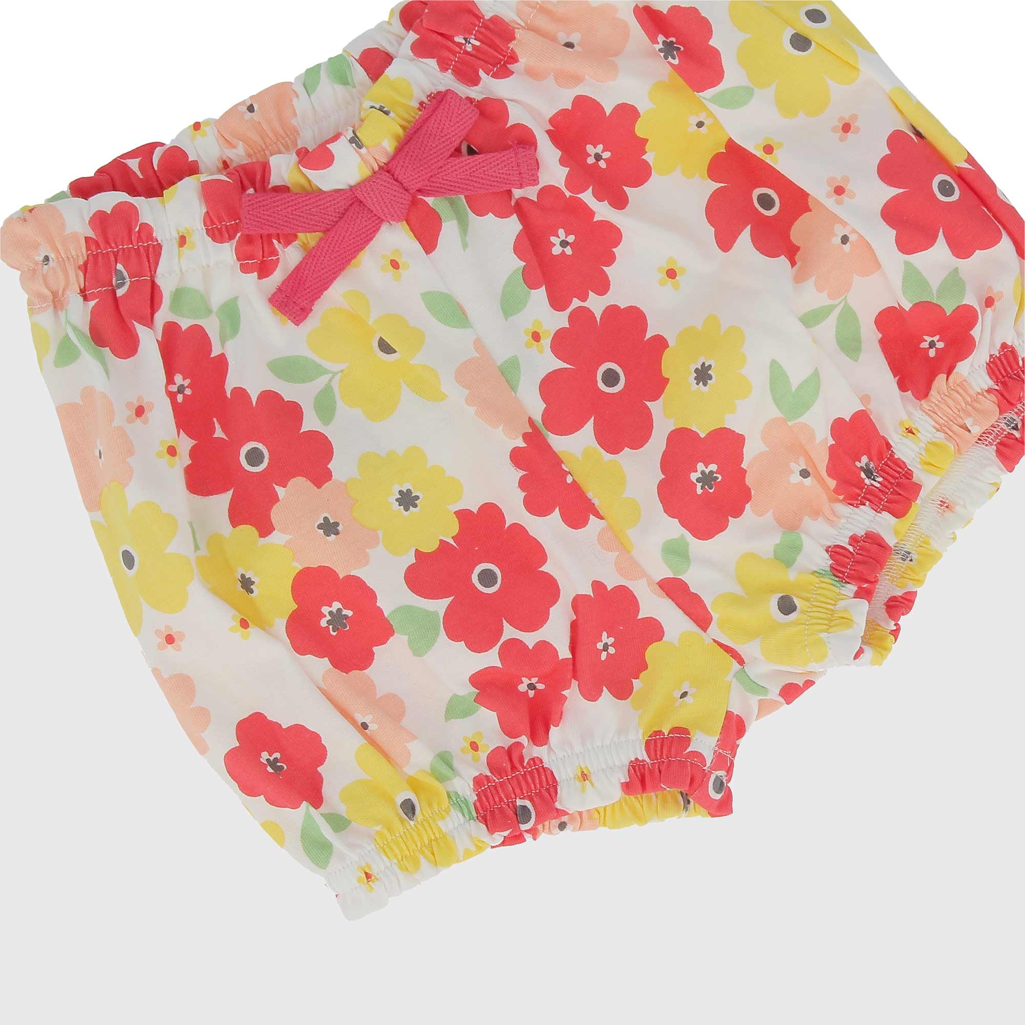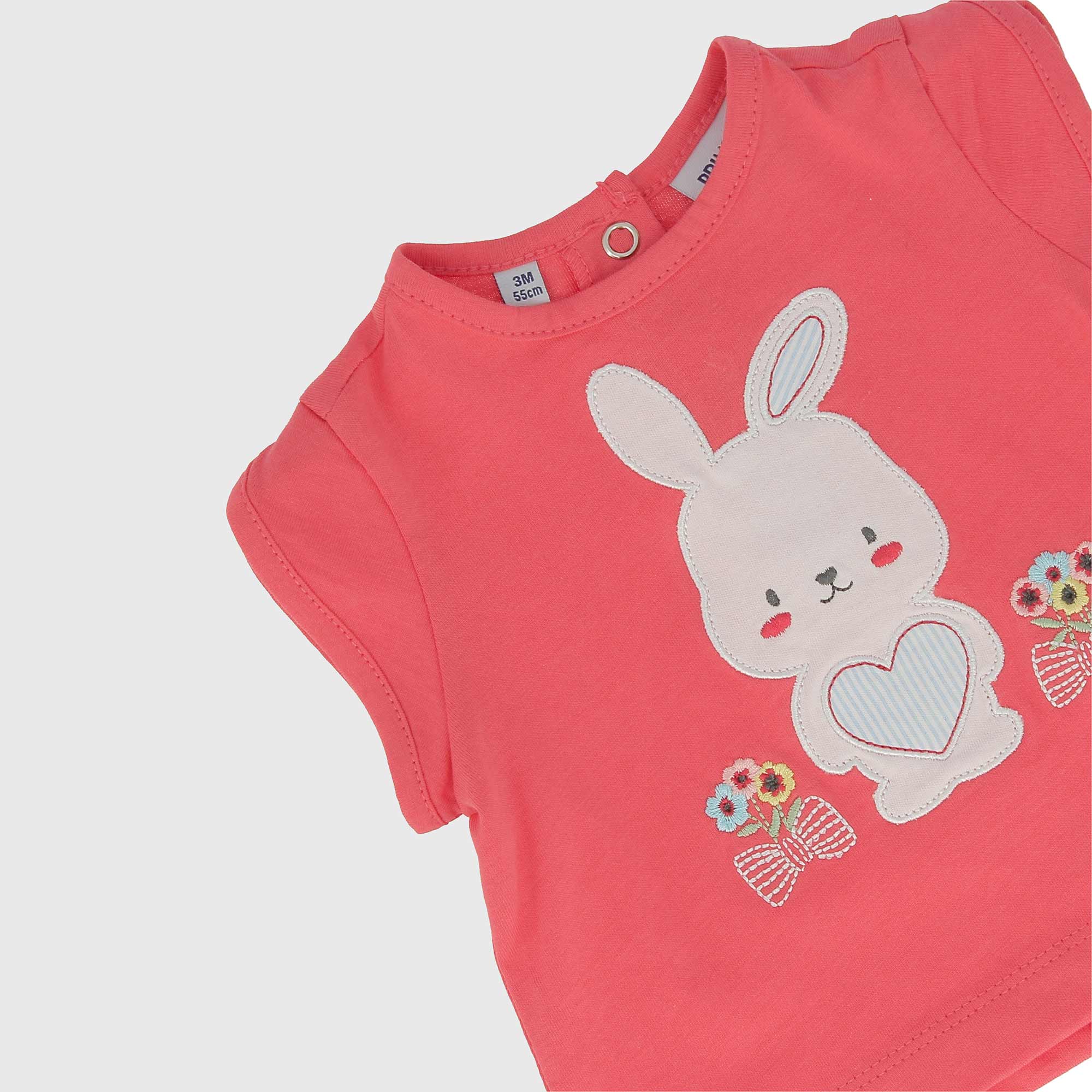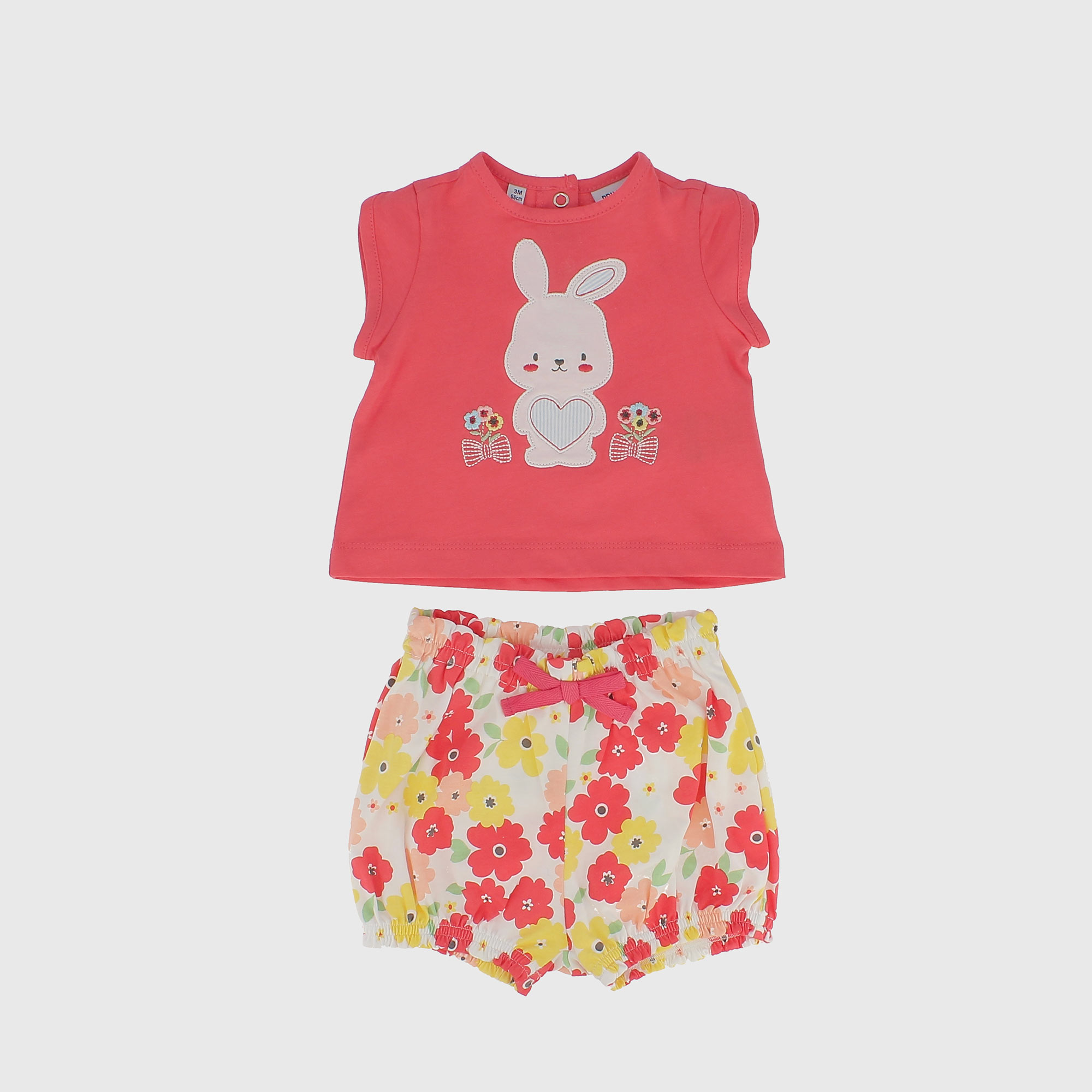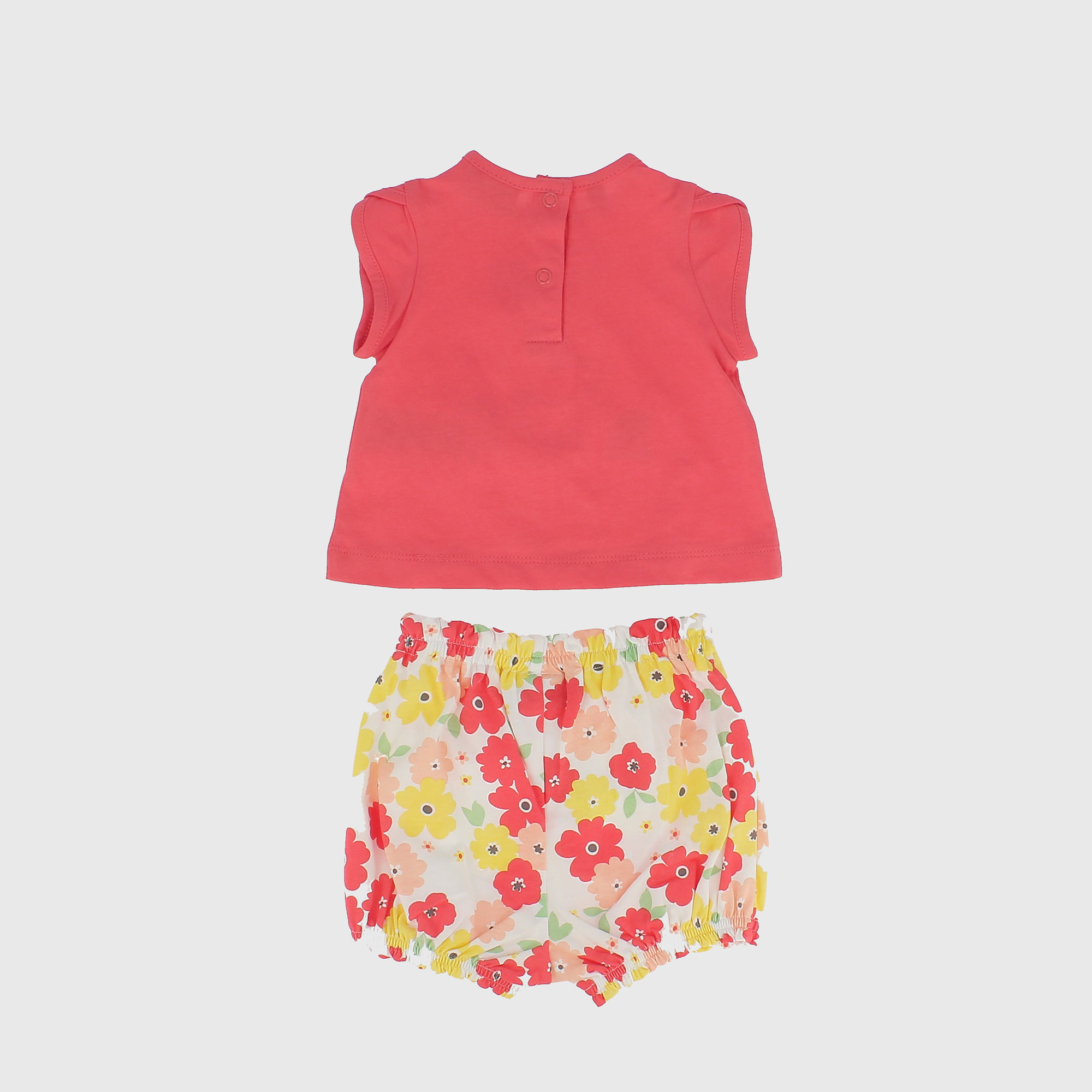 Completo composto da due pezzi. Maglietta in jersey girocollo, a maniche corte. Chiusura posteriore con bottoni automatici. Ricamo coniglietto frontale. Pantaloncino in jersey a palloncino con vita elasticizzata e fiocchetto. Stampa all-over di fiori.