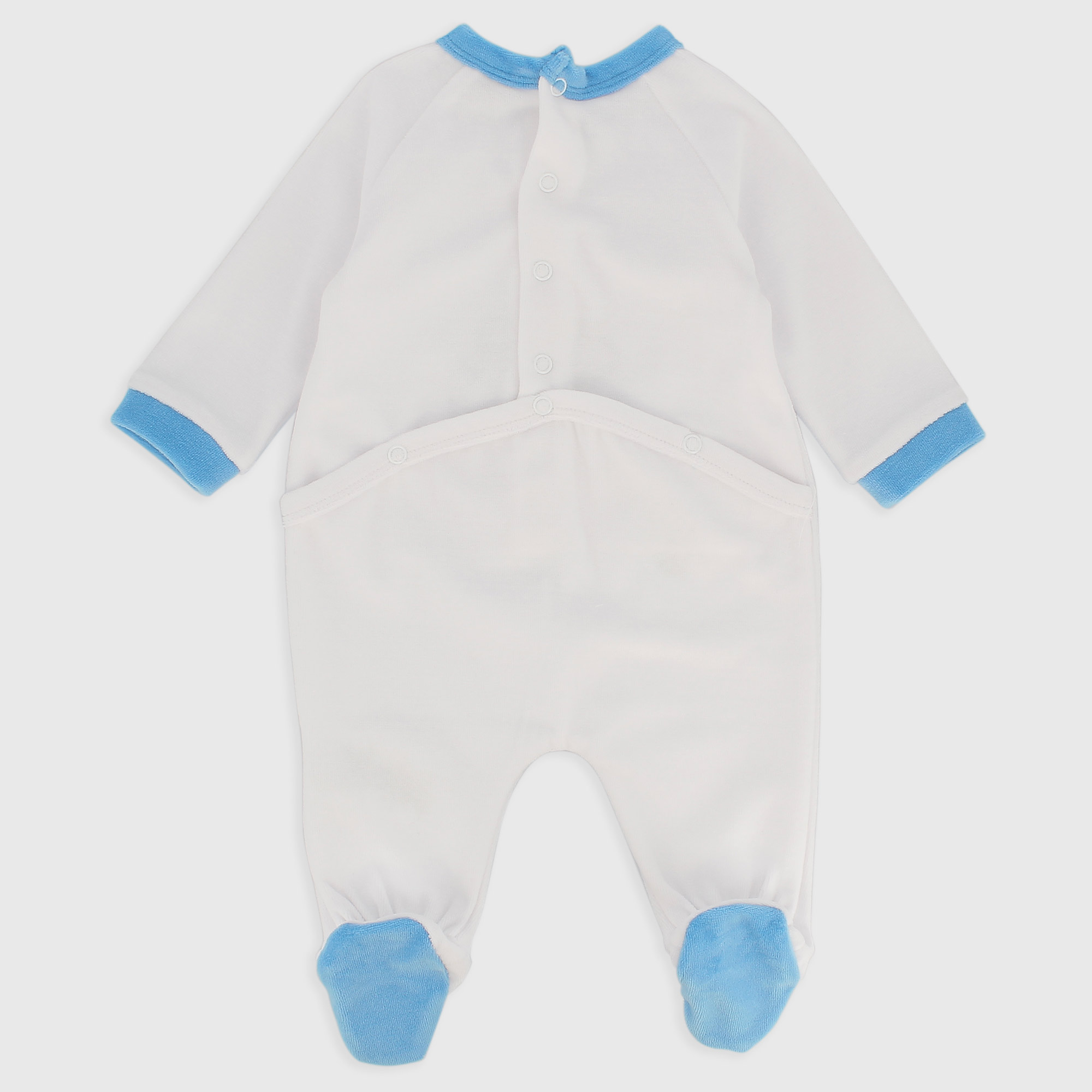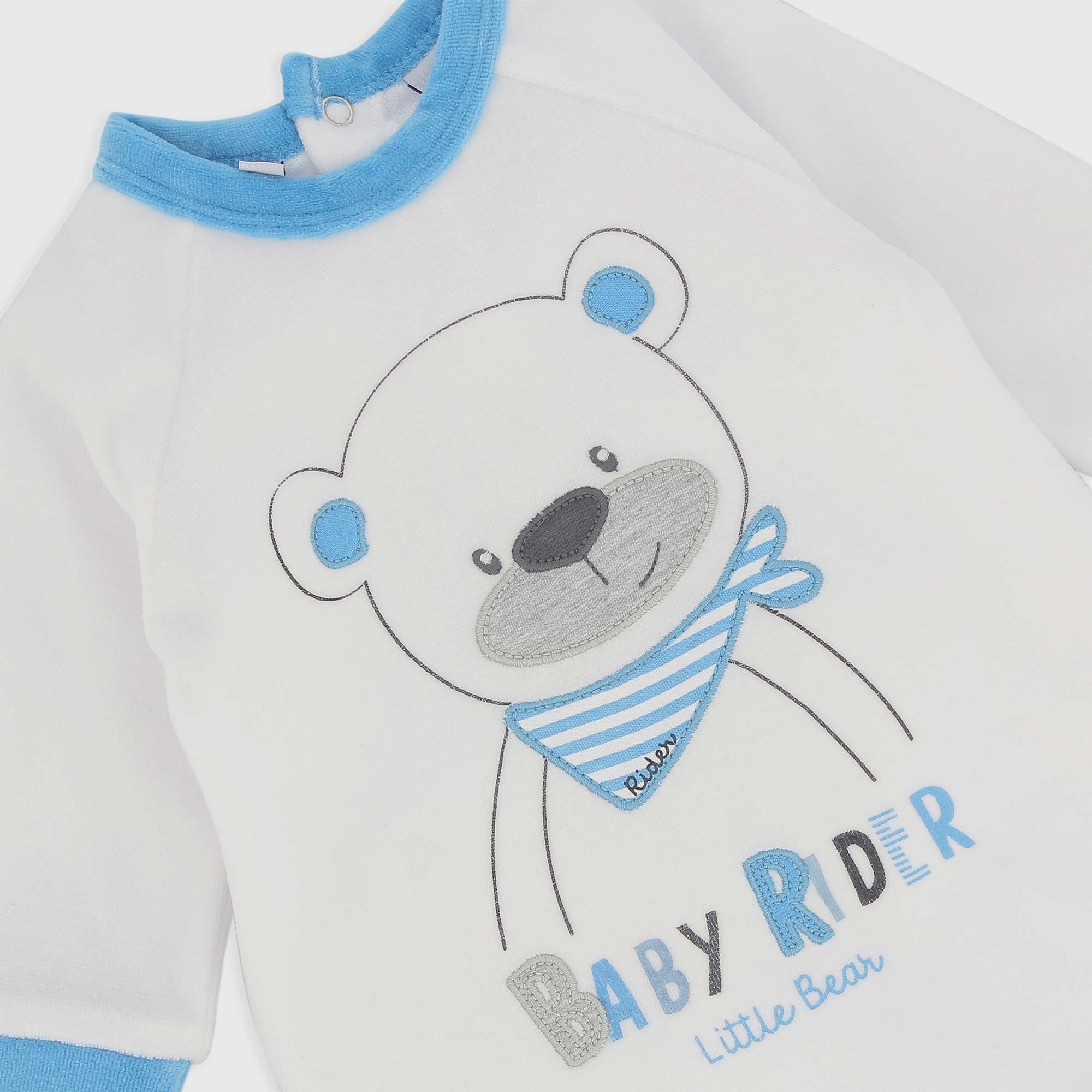 Tutina in ciniglia girocollo a maniche lunghe. Chiusura con abbottonatura posteriore. Orsetto stampato con ricami sul davanti. Profili a contrasto.