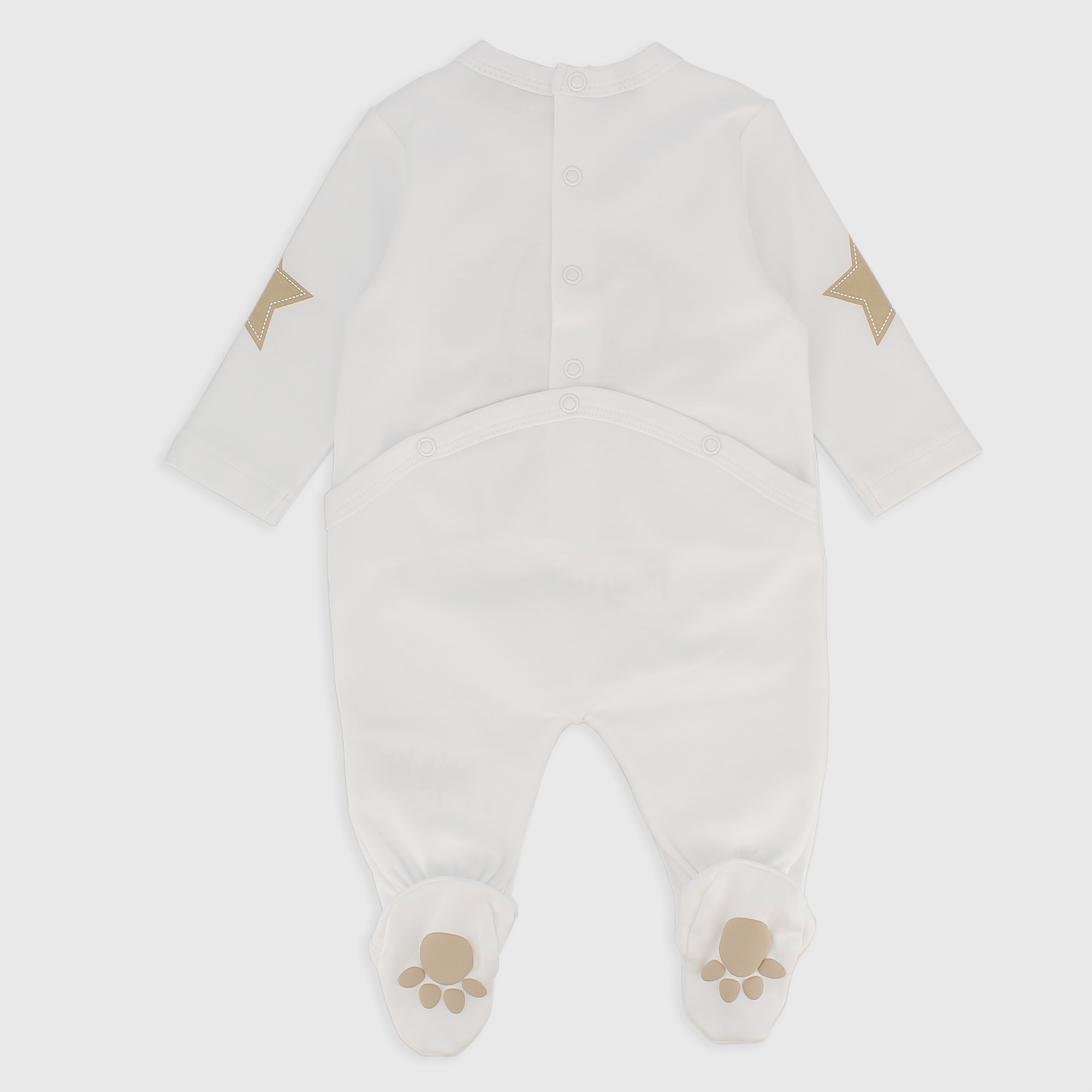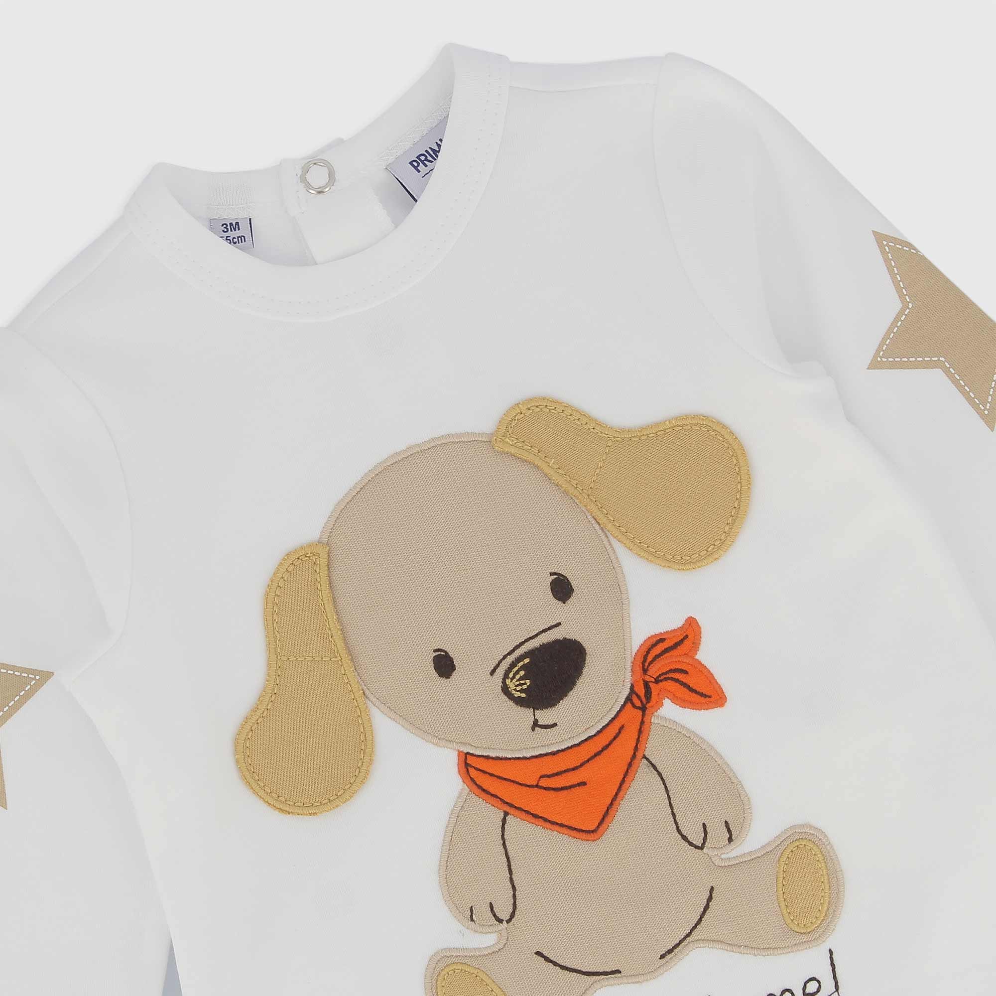 Tutina in cotone con collo rotondo, a maniche lunghe. Chiusura posteriore con bottoni automatici. Patch cagnolino sul davanti. Stelle stampate sui gomiti, e stampa gommata sui piedini.