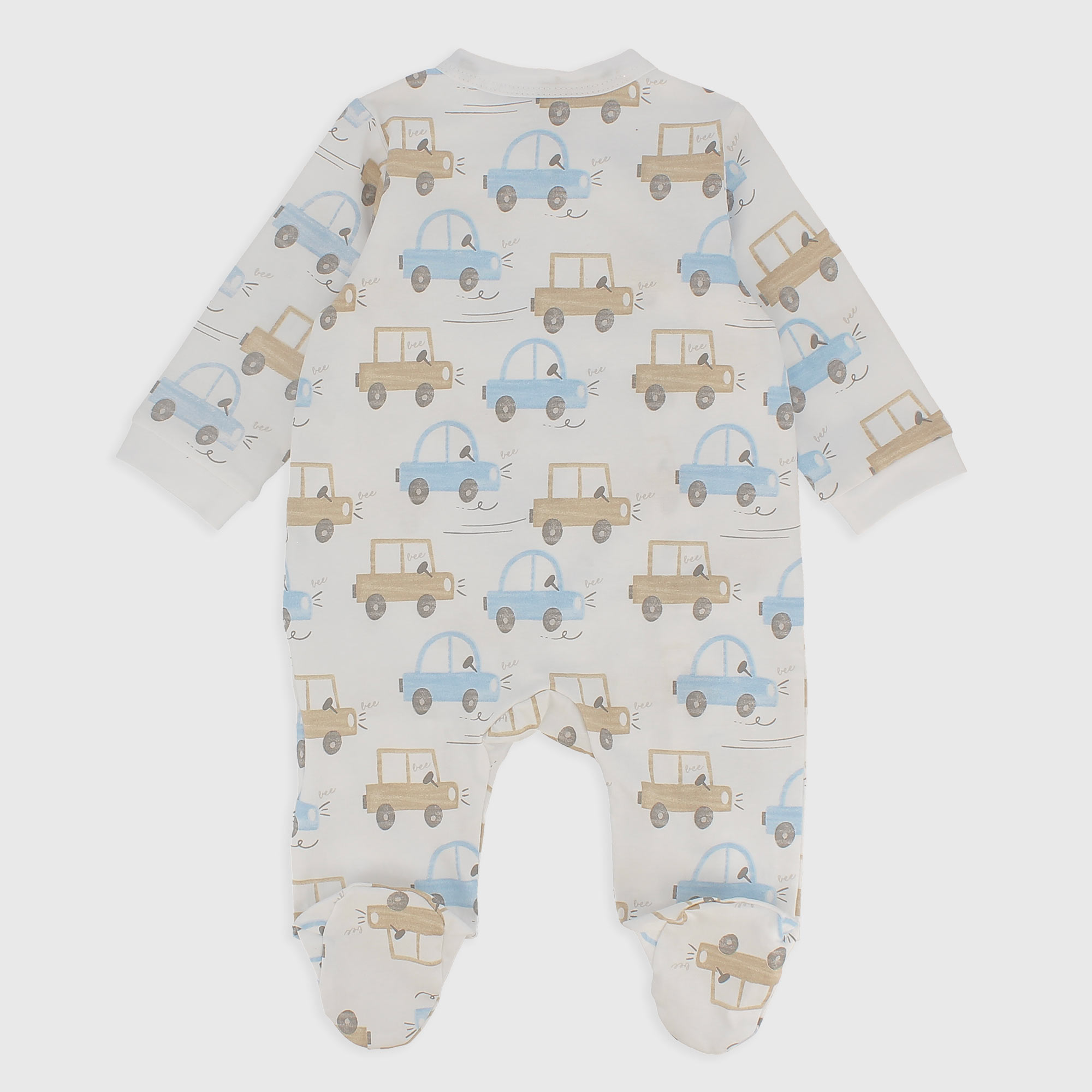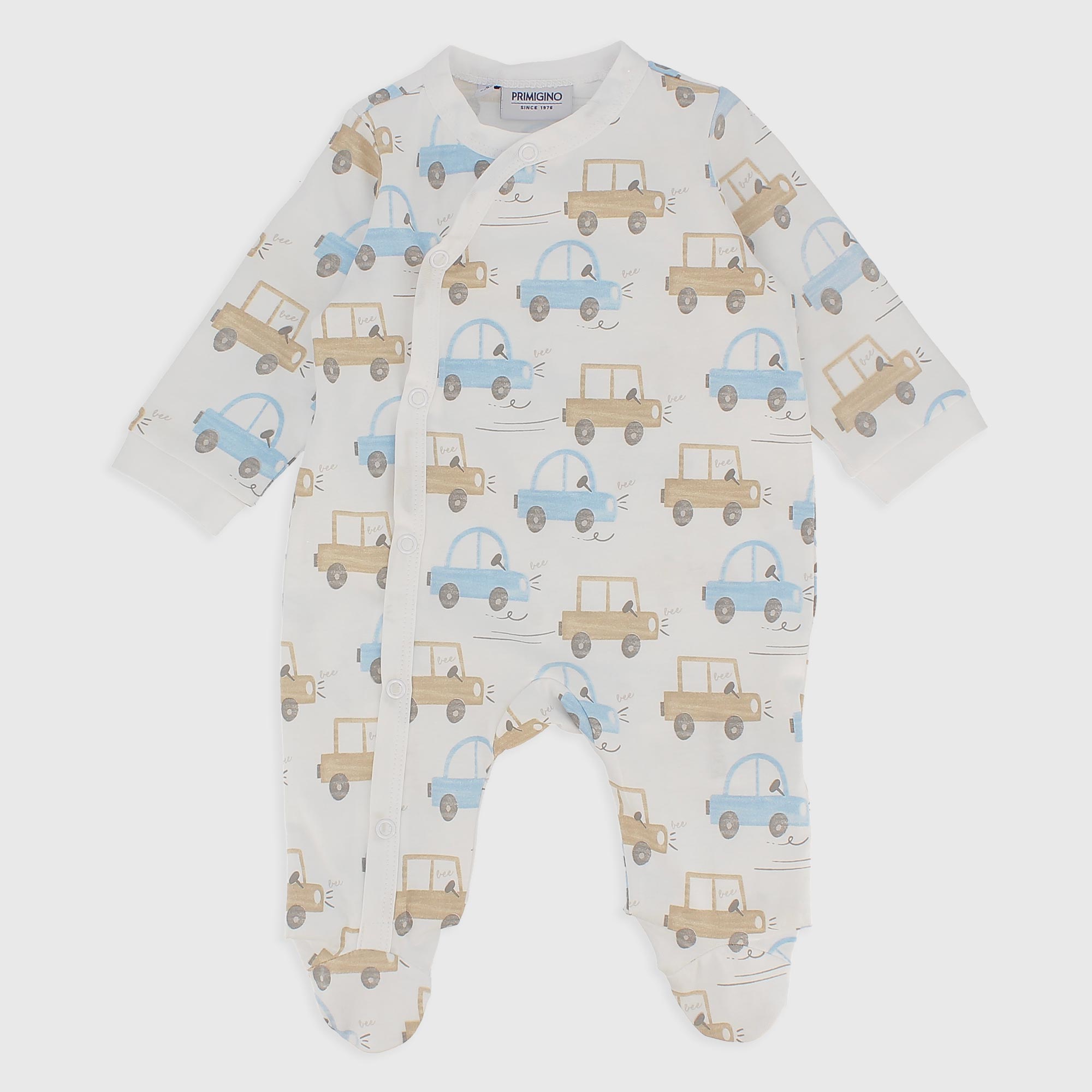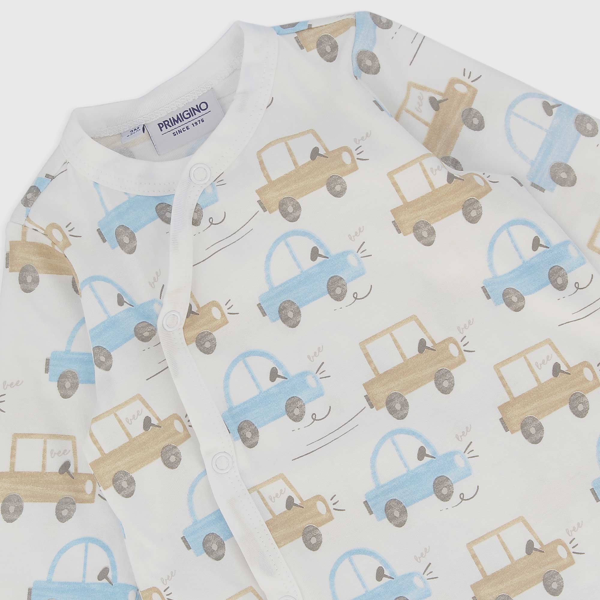 Tutina in jersey con collo rotondo, a maniche lunghe. Chiusura a kimono con bottoni automatici. Stampa macchinine all-over.