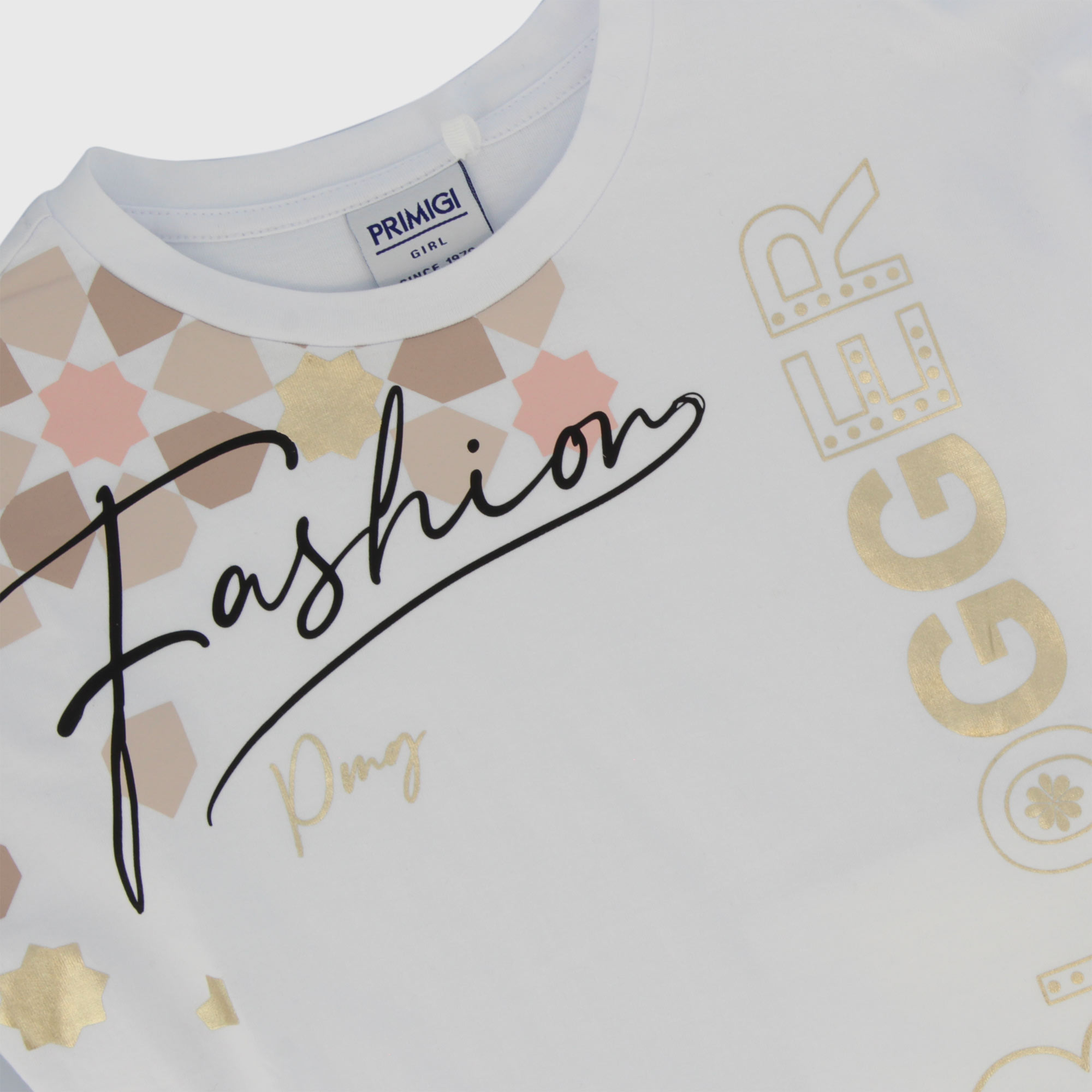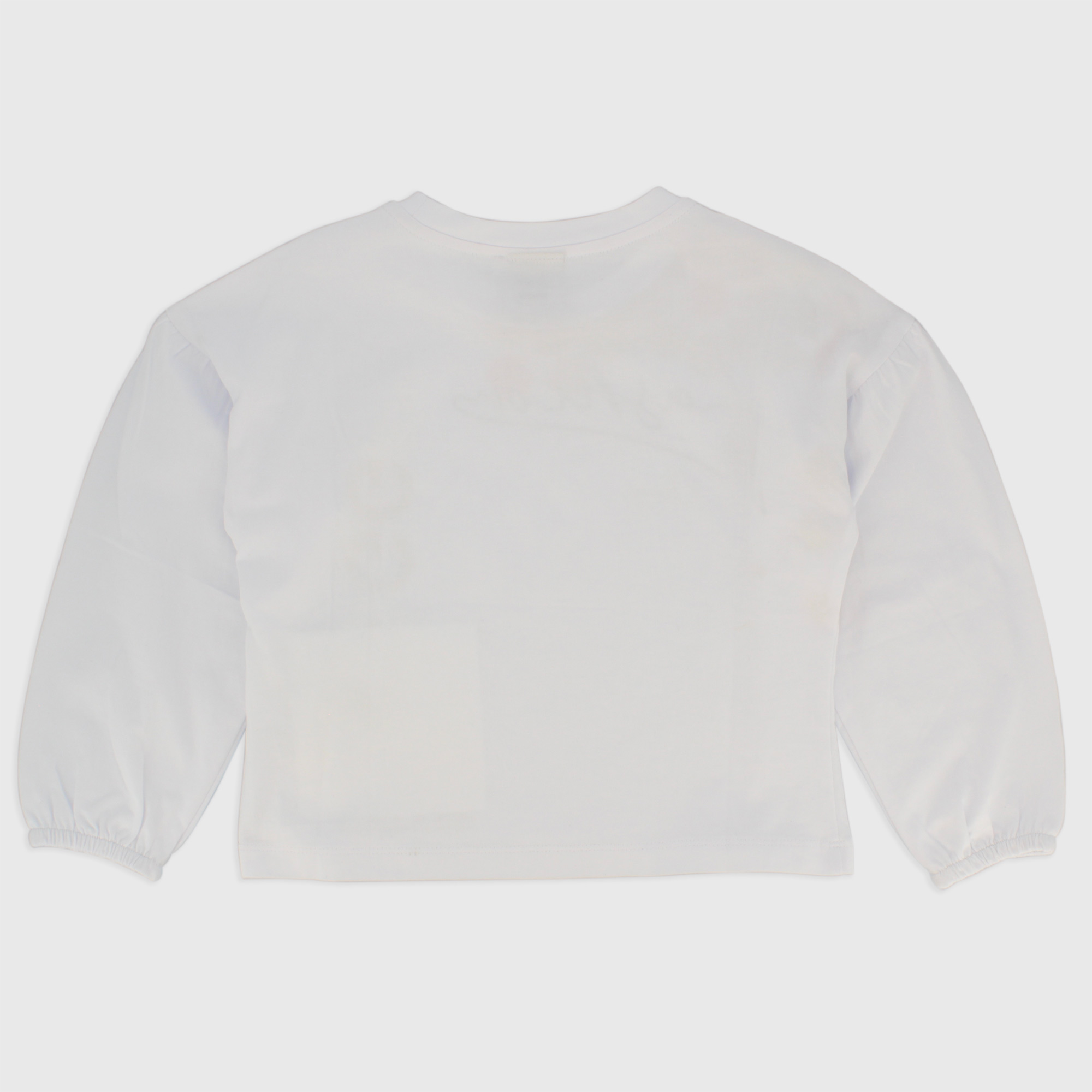 Maglietta in jersey, girocollo, a maniche lunghe a palloncino. Stampa con dettagli laminati sul davanti.