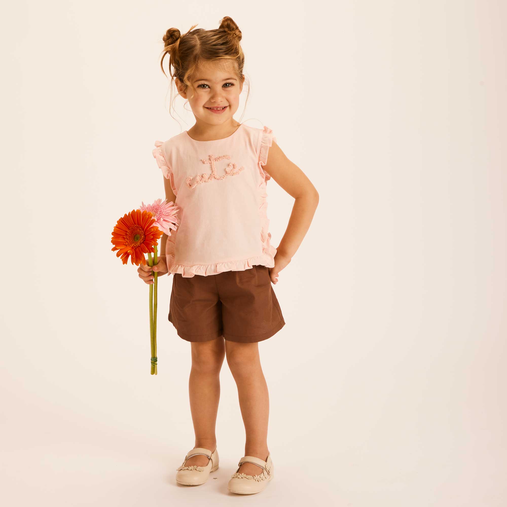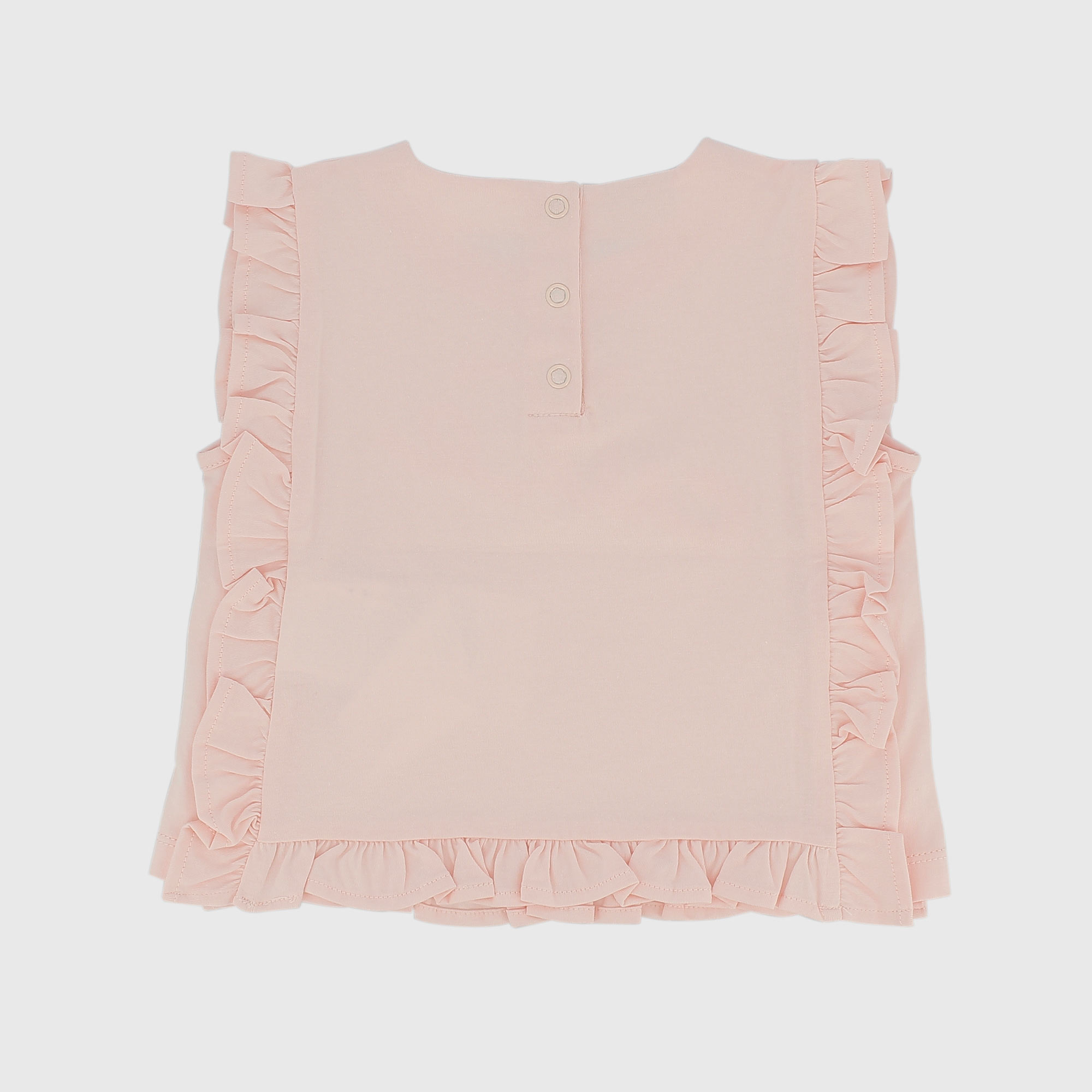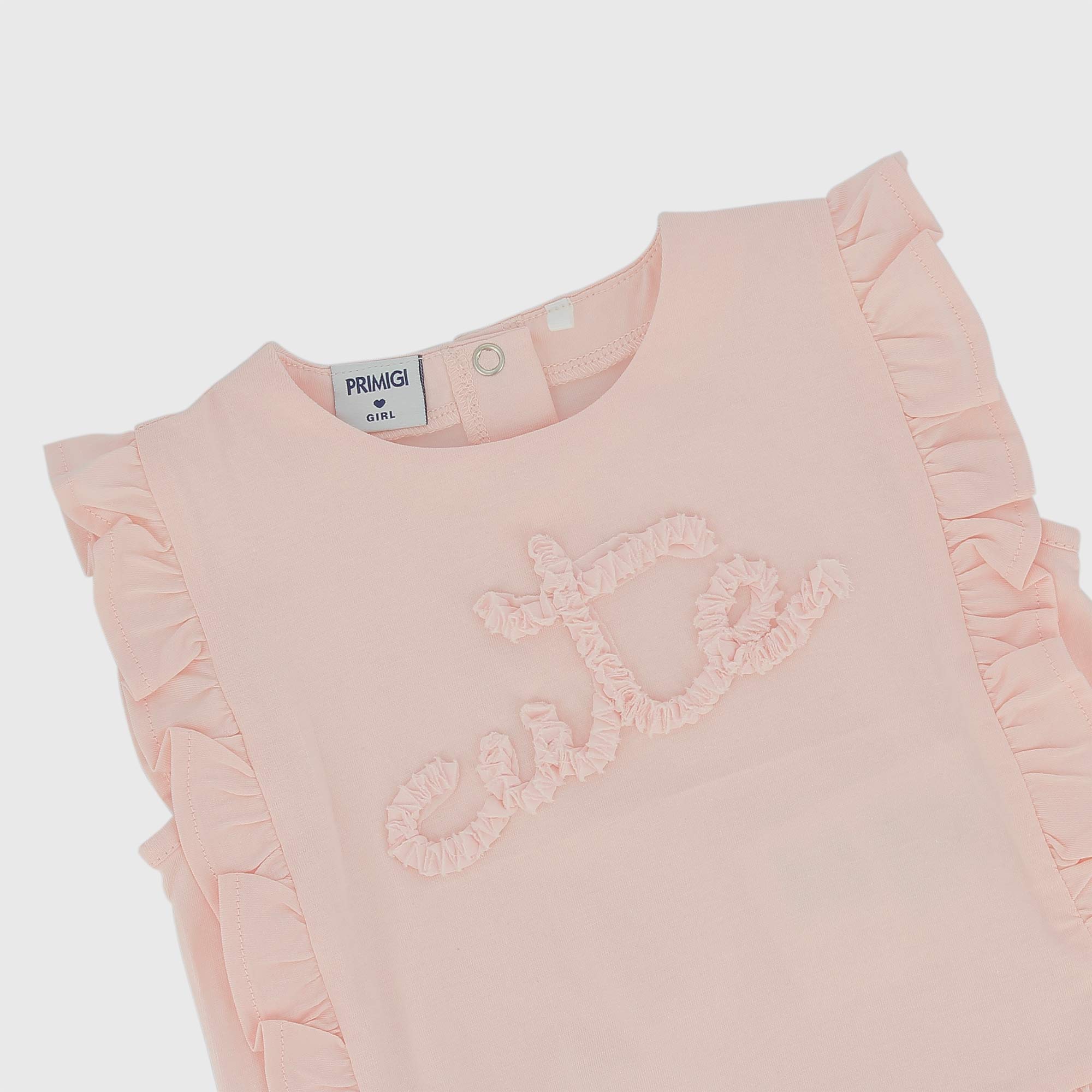 Maglietta in jersey, girocollo, a maniche corte. Chiusura posteriore con bottoni automatici. Ricamo con scritta sul davanti e grandi volants.