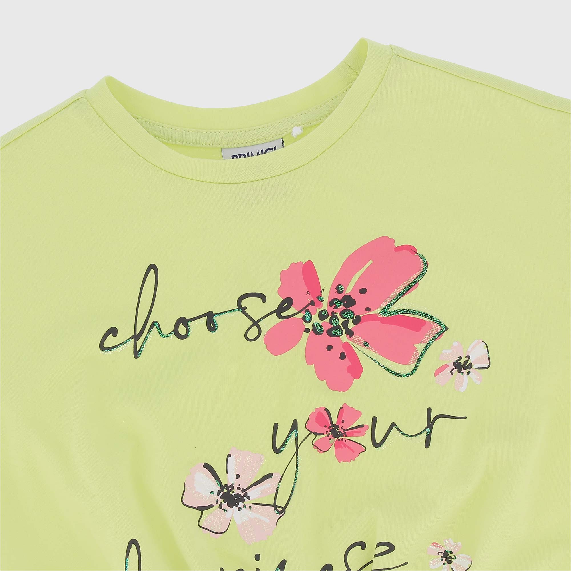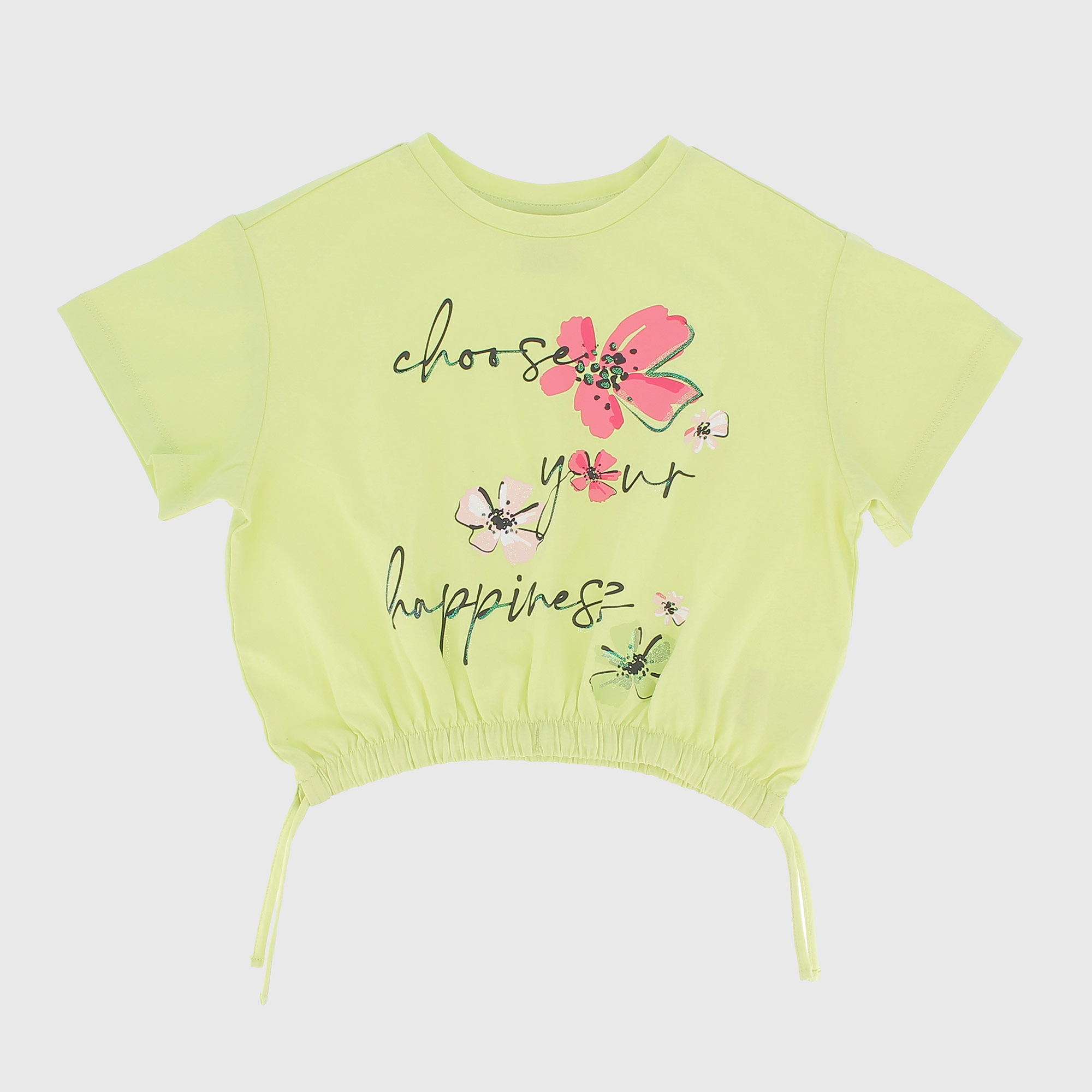 Maglietta in jersey modello boxy, girocollo, a maniche corte. Stampa frontale con dettagli lurex. Fondo con elastico e laccetti laterali.