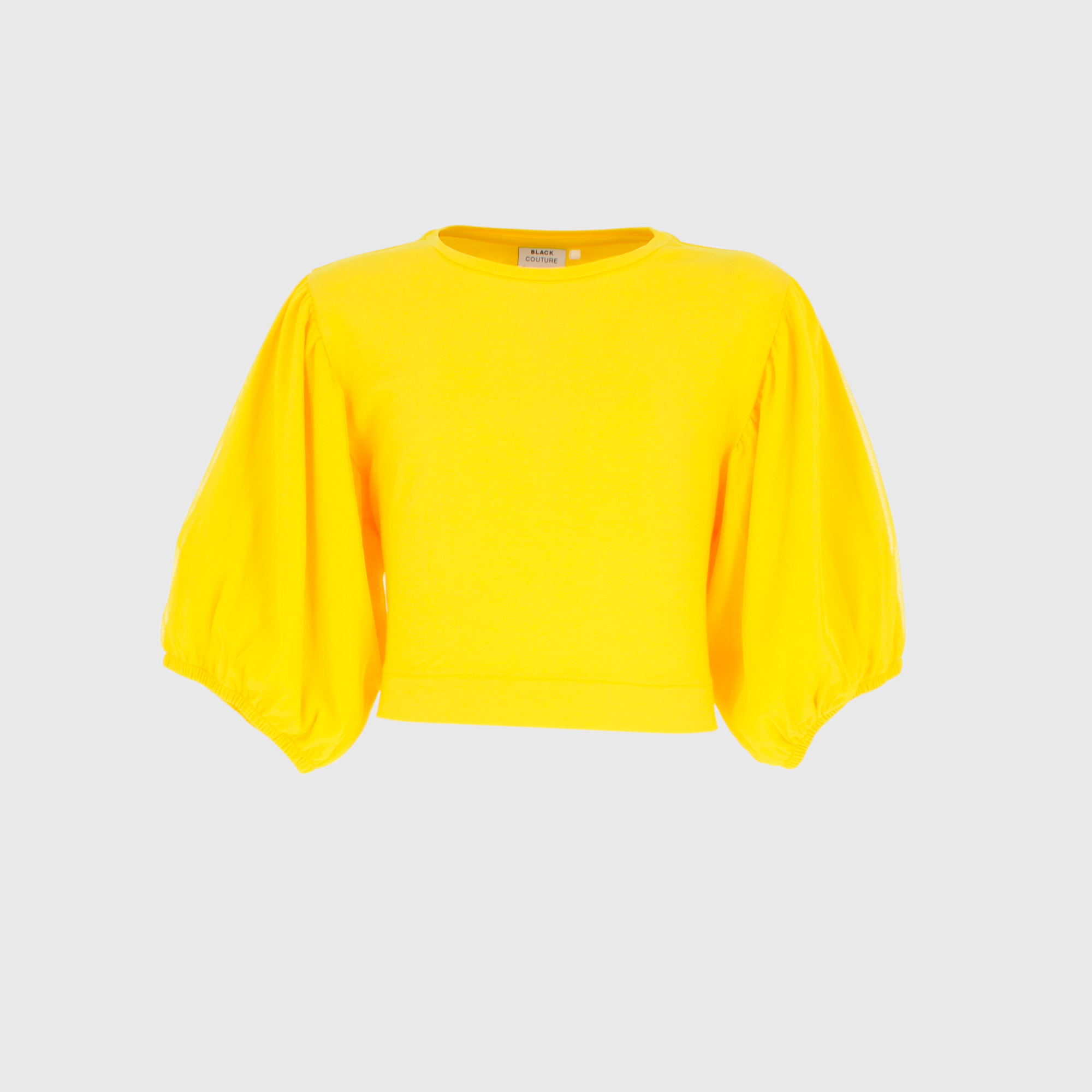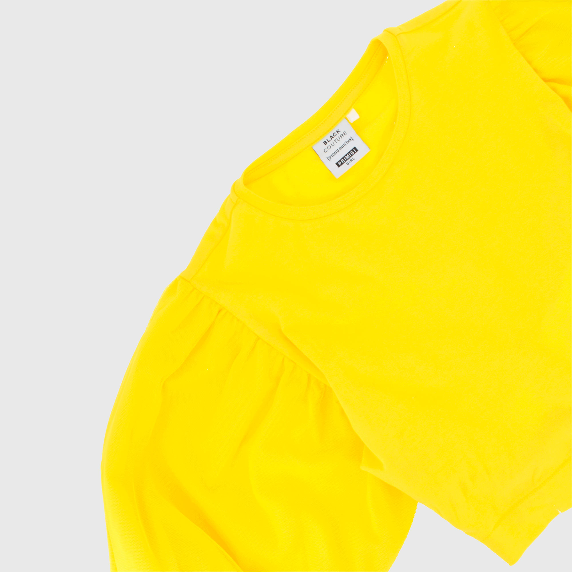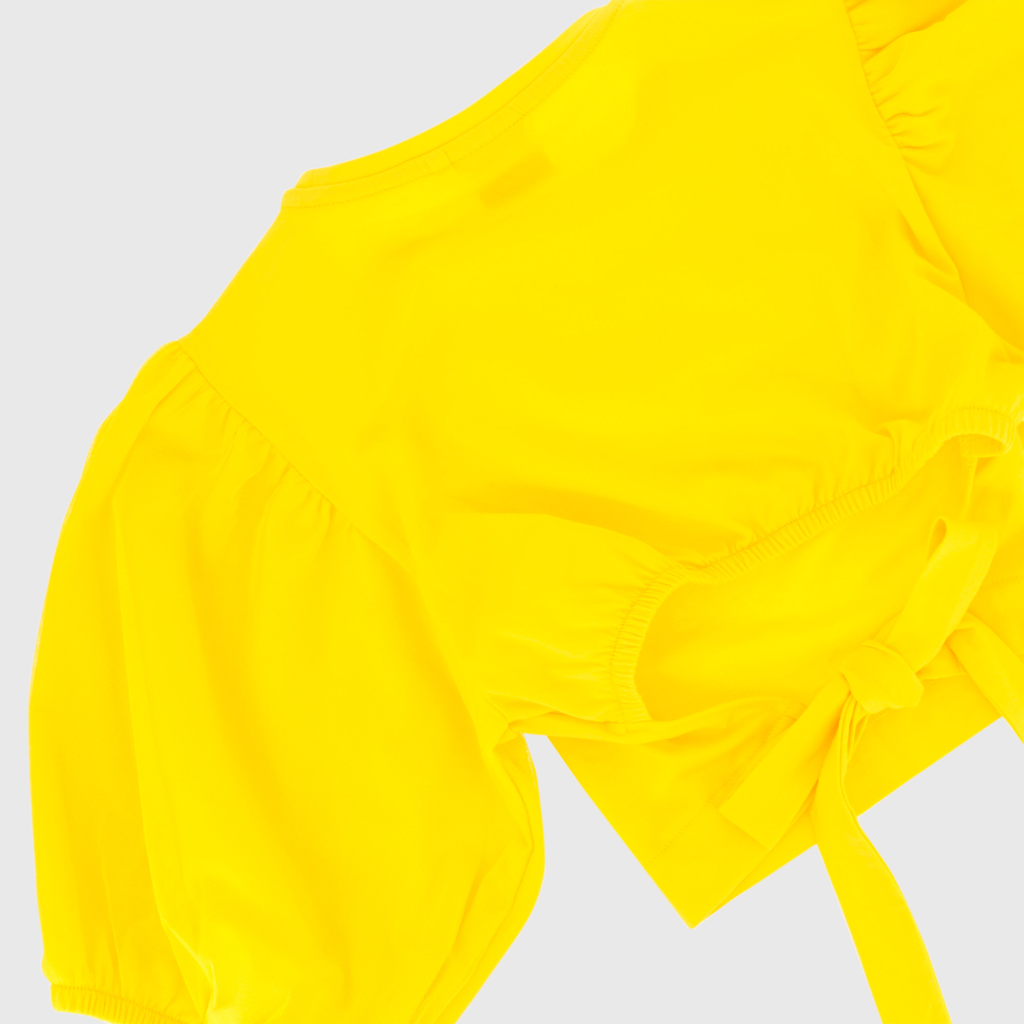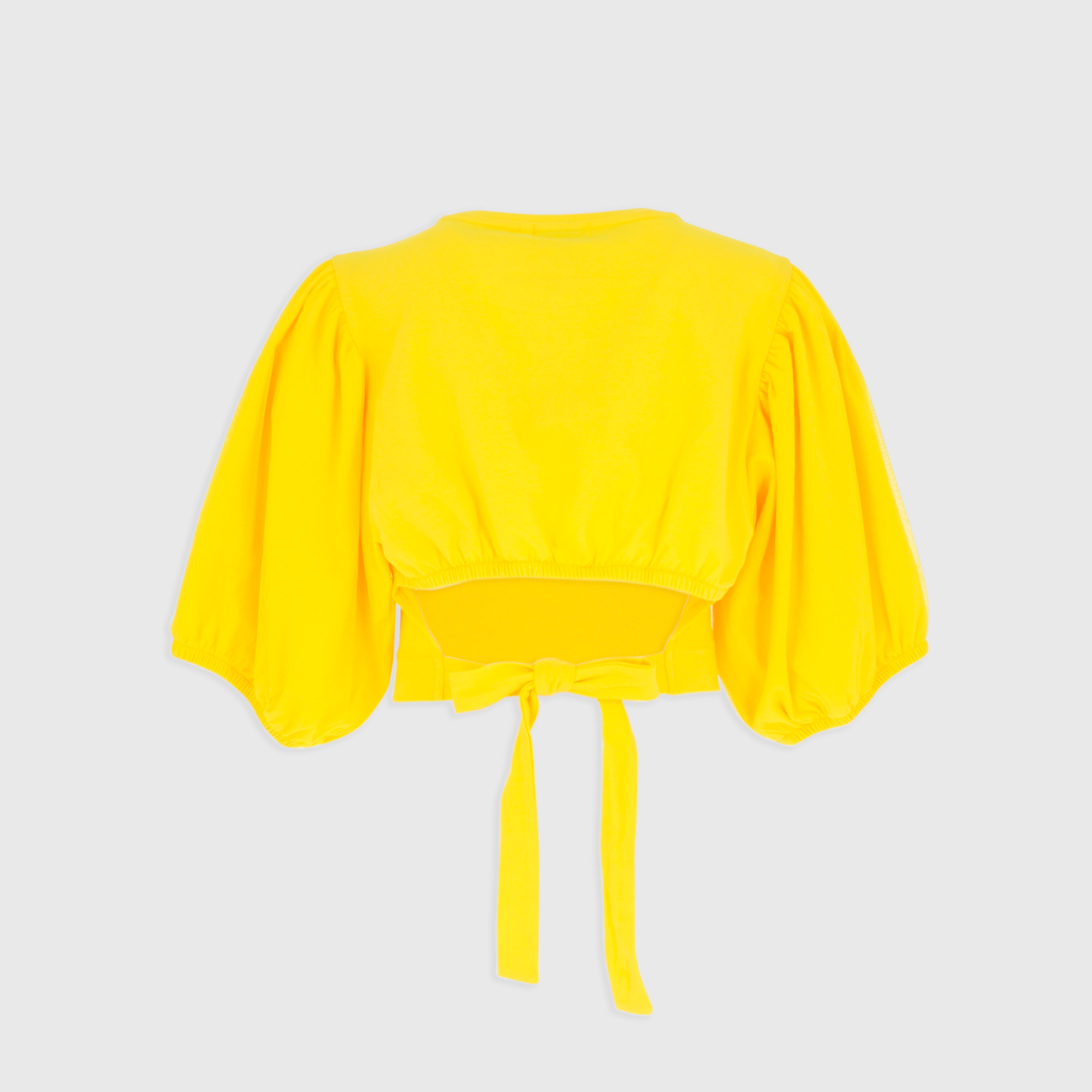 Maglietta in jersey, girocollo, a maniche corte balloon con applicazione di tulle. Fondo sul retro elasticato con lacci per fiocco.