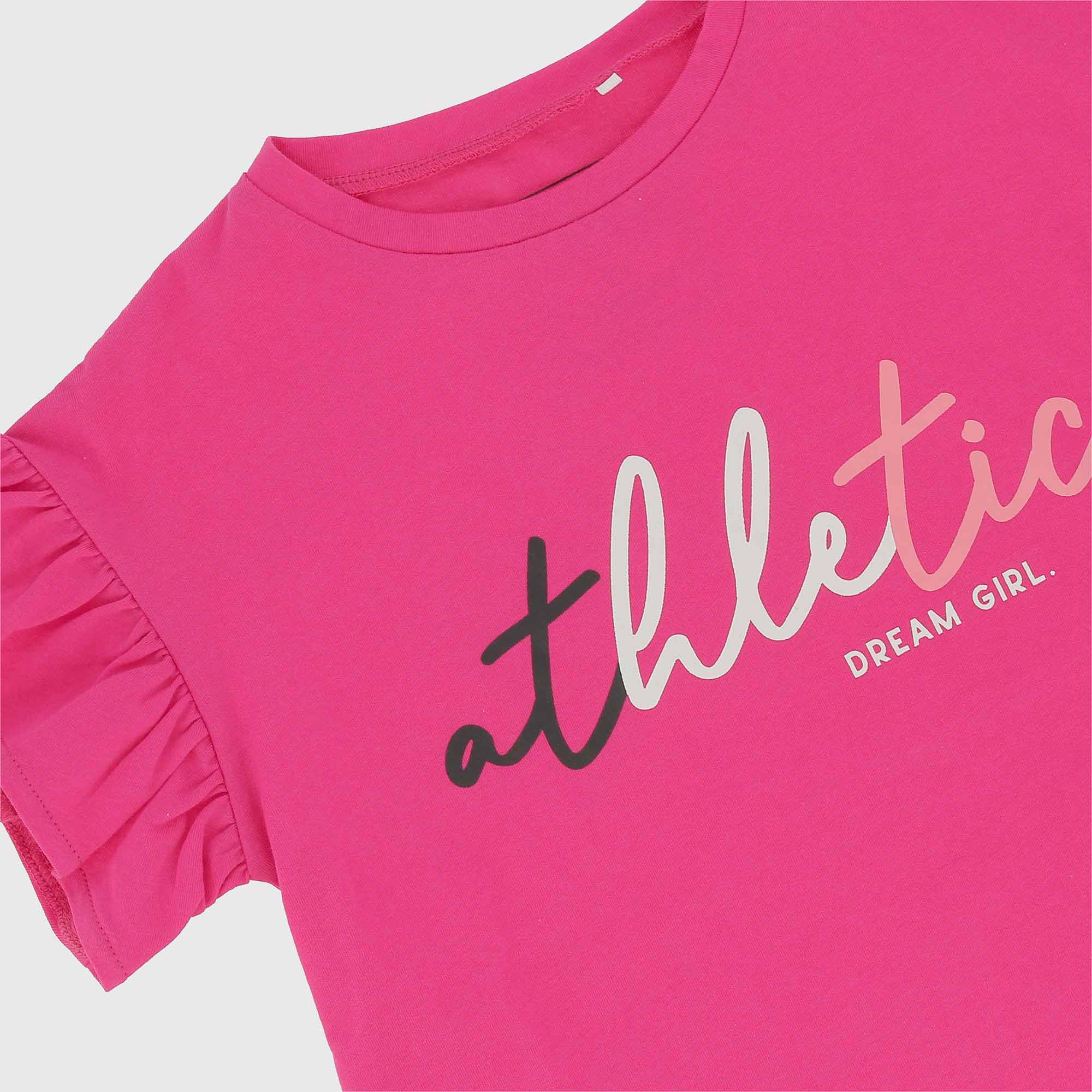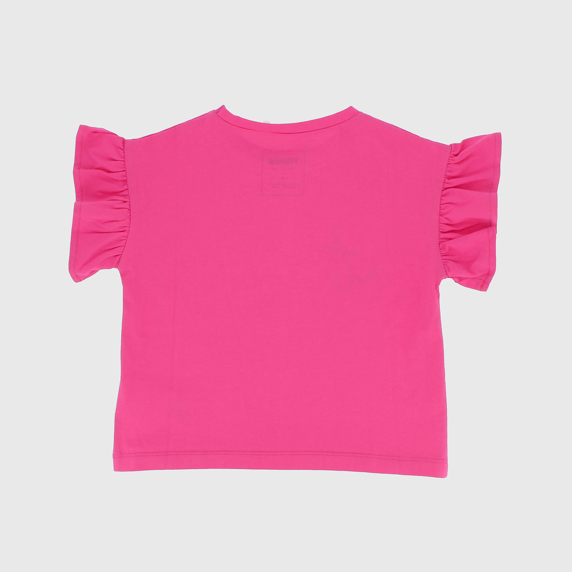 Maglietta in jersey, girocollo, a maniche corte con volants. Stampa frontale.