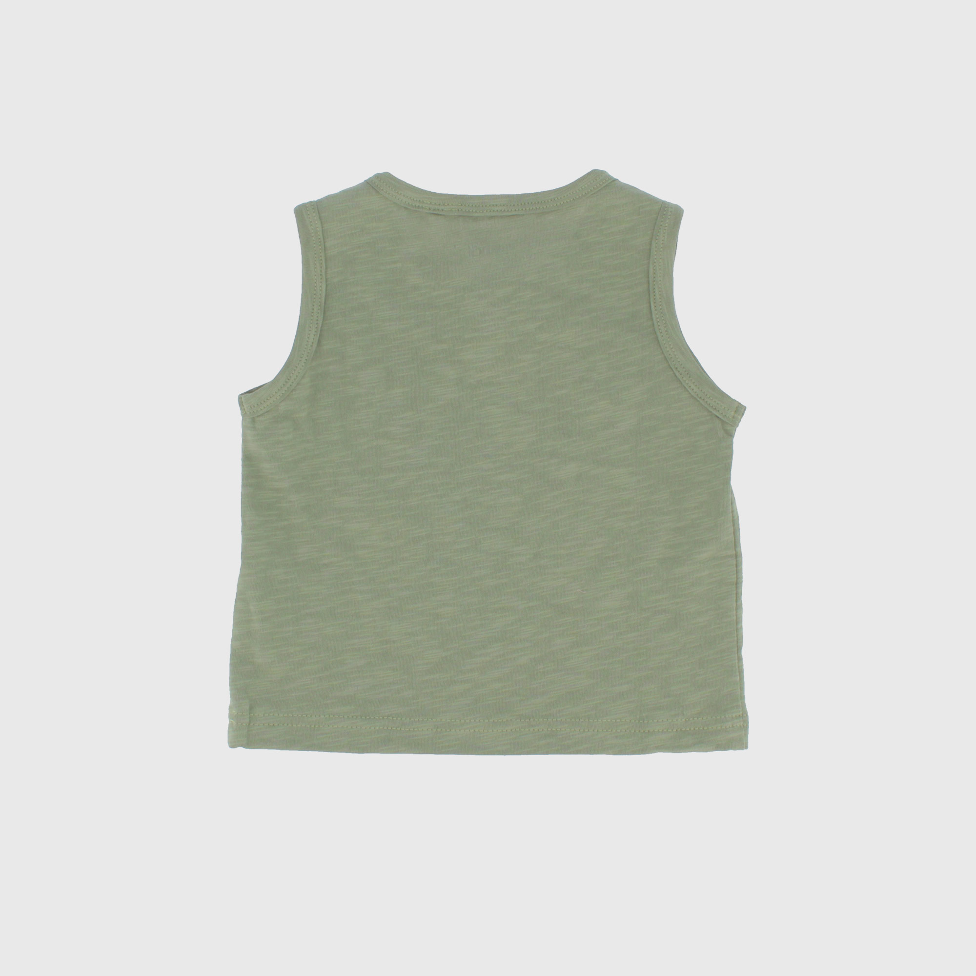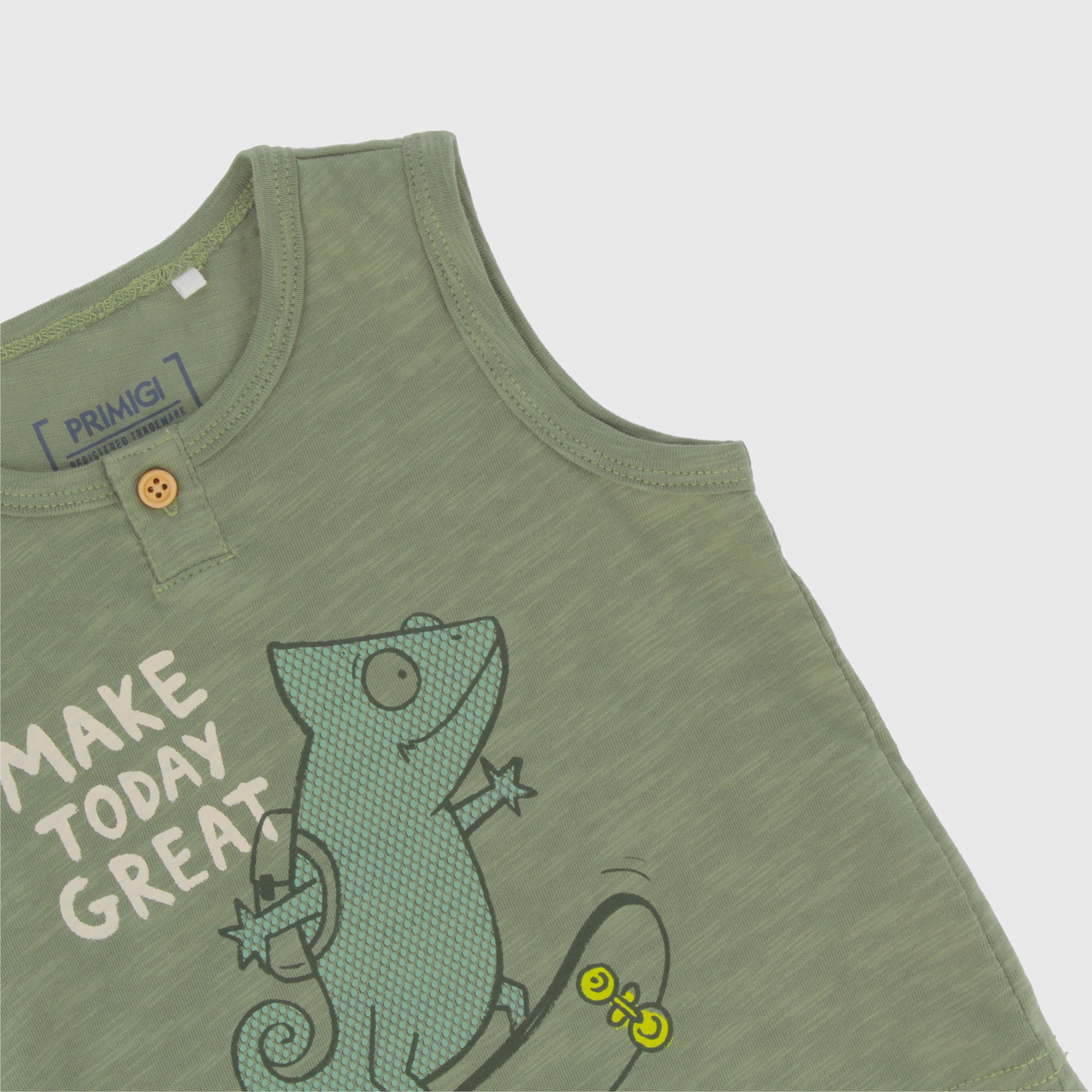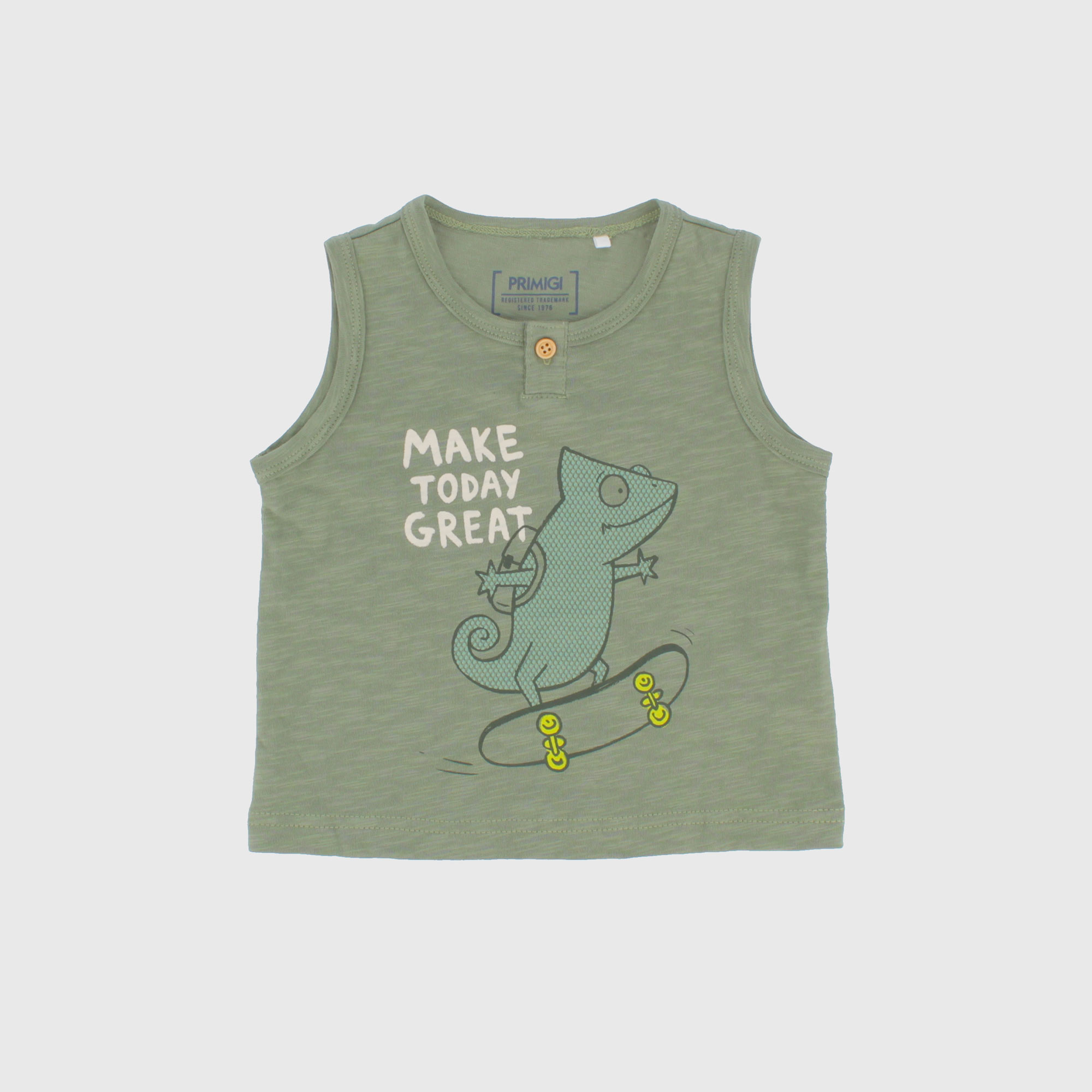 Canotta in jersey fiammato, girocollo. Chiusura frontale con bottoncino in legno sullo scollo. Stampa Geko sul davanti.